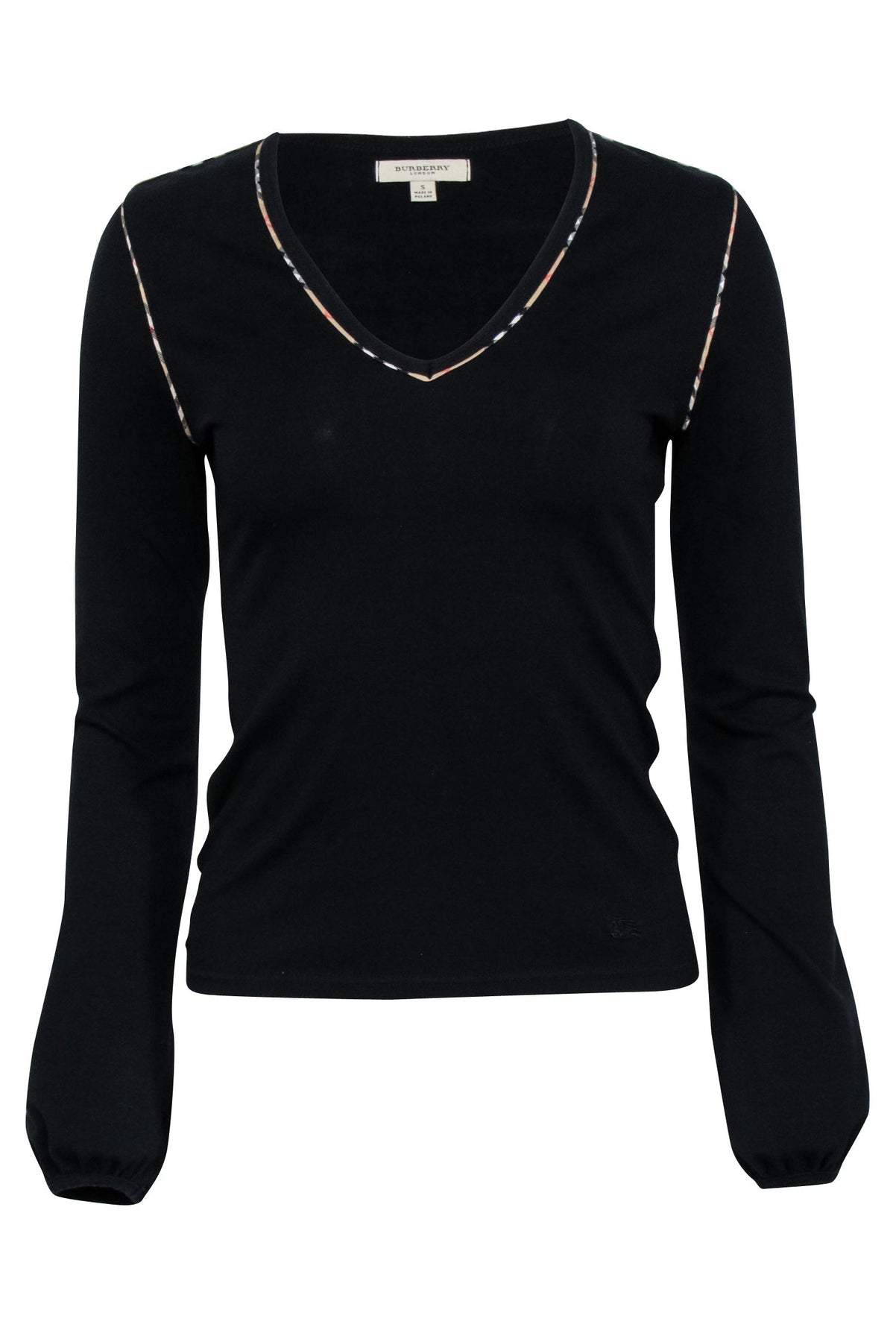 What could be more timeless than a black tee from the legendary Burberry brand? This wardrobe staple is crafted from a soft cotton blend and features contrast stitching in the fashion house's iconic plaid print. With a flattering v-neckline and elastic cuffs, this is sure to become your go-to for an effortlessly chic look. Embrace quiet luxury when you style it with jeans and platform loafers.