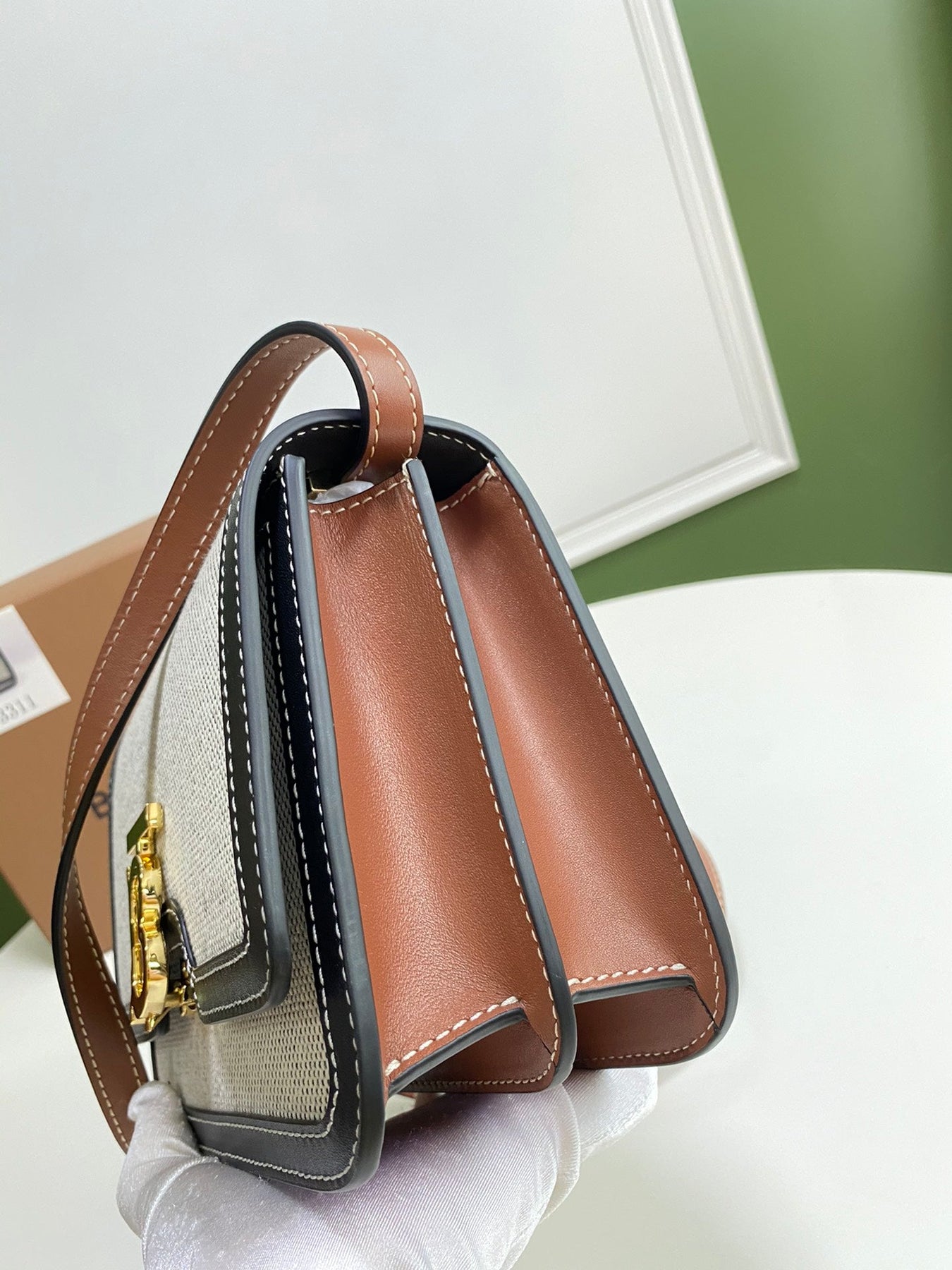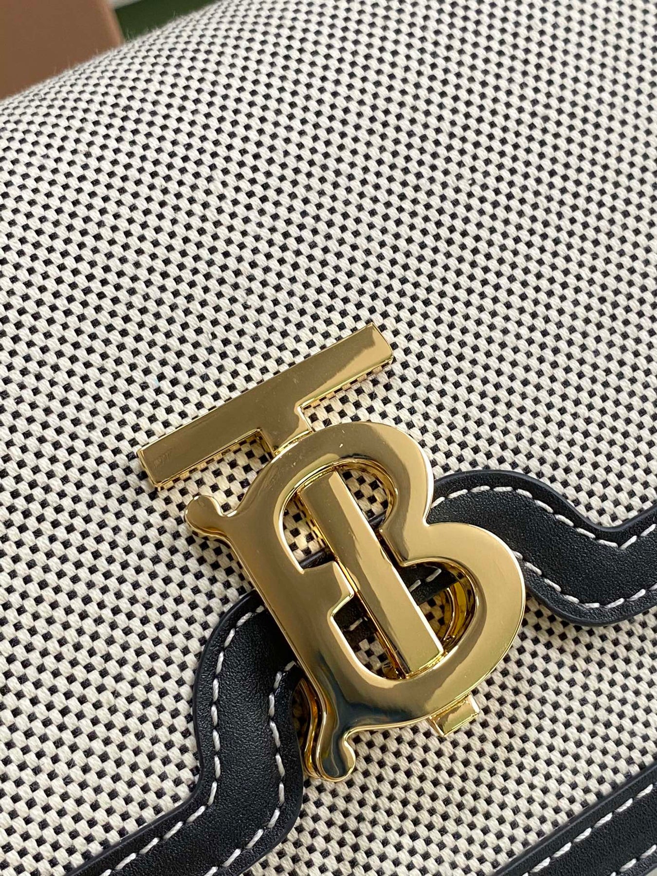 • A structured bag in two-tone canvas and topstitched leather with a Thomas Burberry Monogram clasp. Wear on the shoulder, across the body or carry as a clutch.