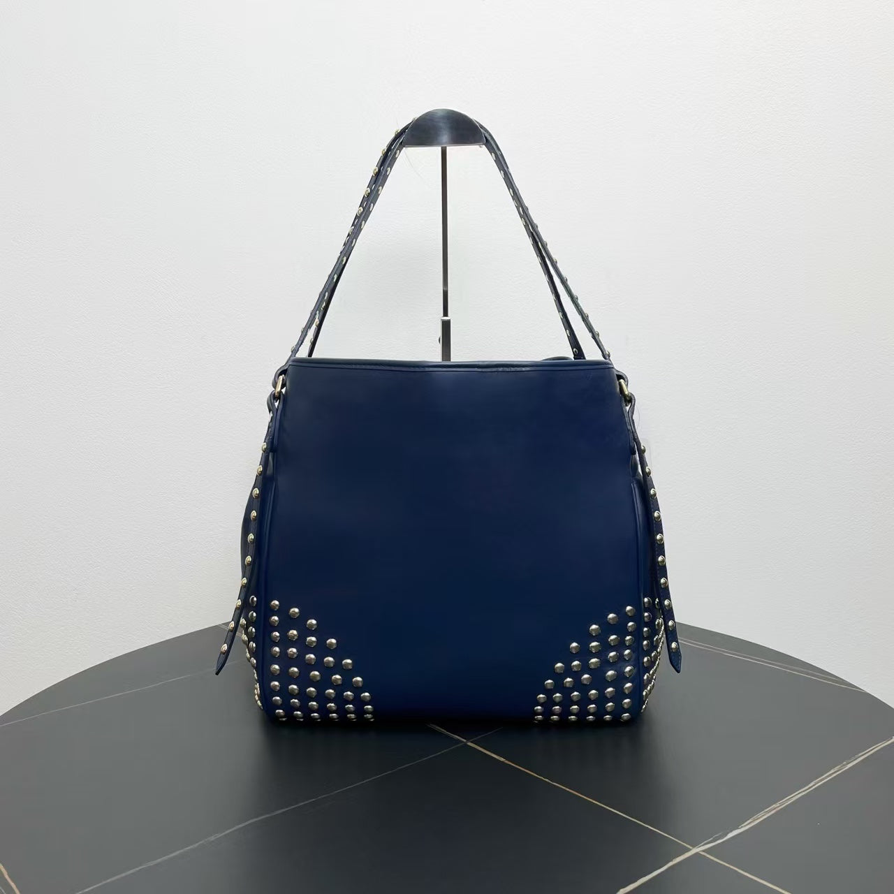 This used Burberry Studded Tote Bag is a perfect blend of edgy style and practicality for anyone who loves vintage Burberry bags. Crafted from luxurious navy leather and adorned with striking silver studs, this tote is both durable and stylish. It features a spacious interior lined with matching fabric, ideal for everyday use. Perfect for collectors and those who appreciate used designer handbags, this piece stands out in any collection.