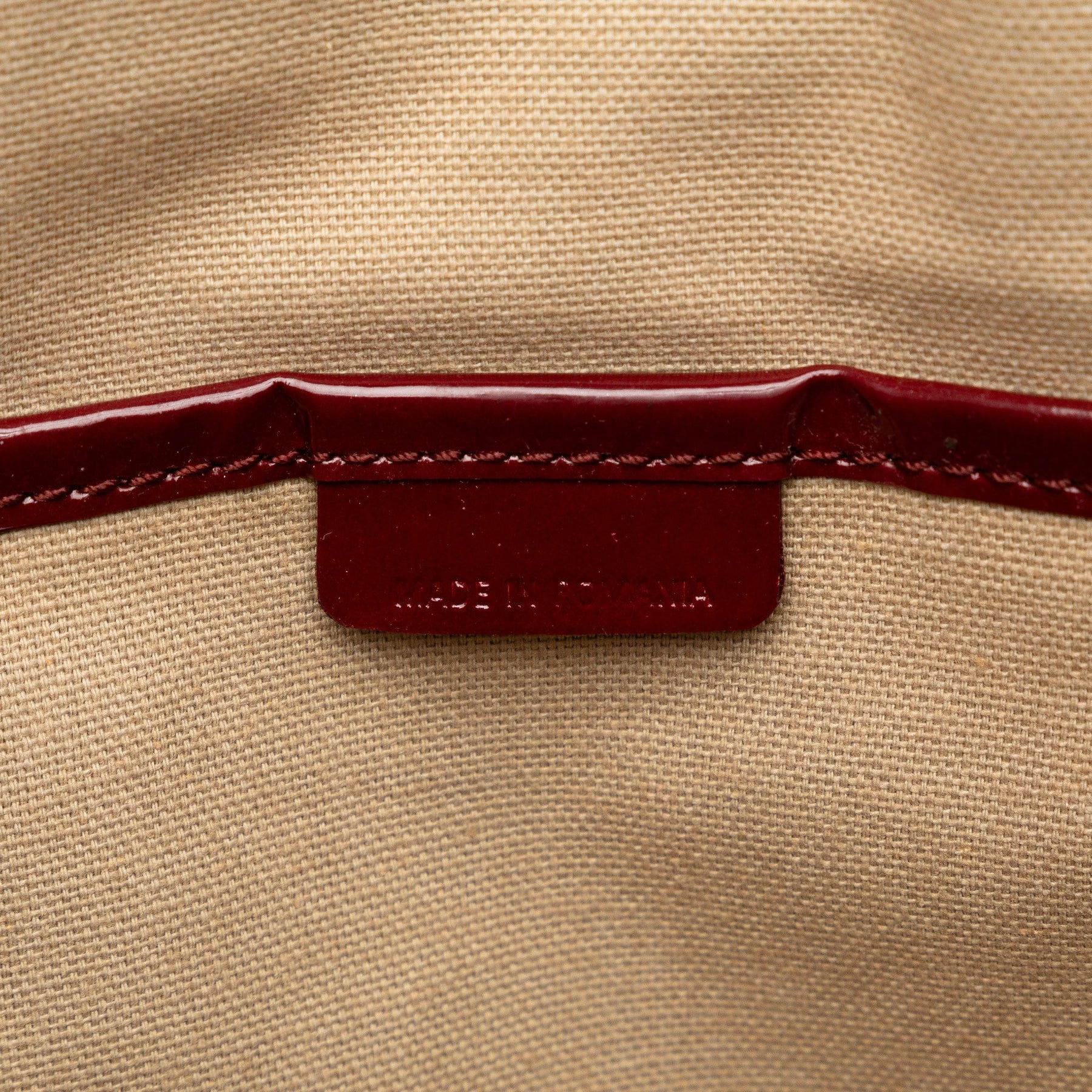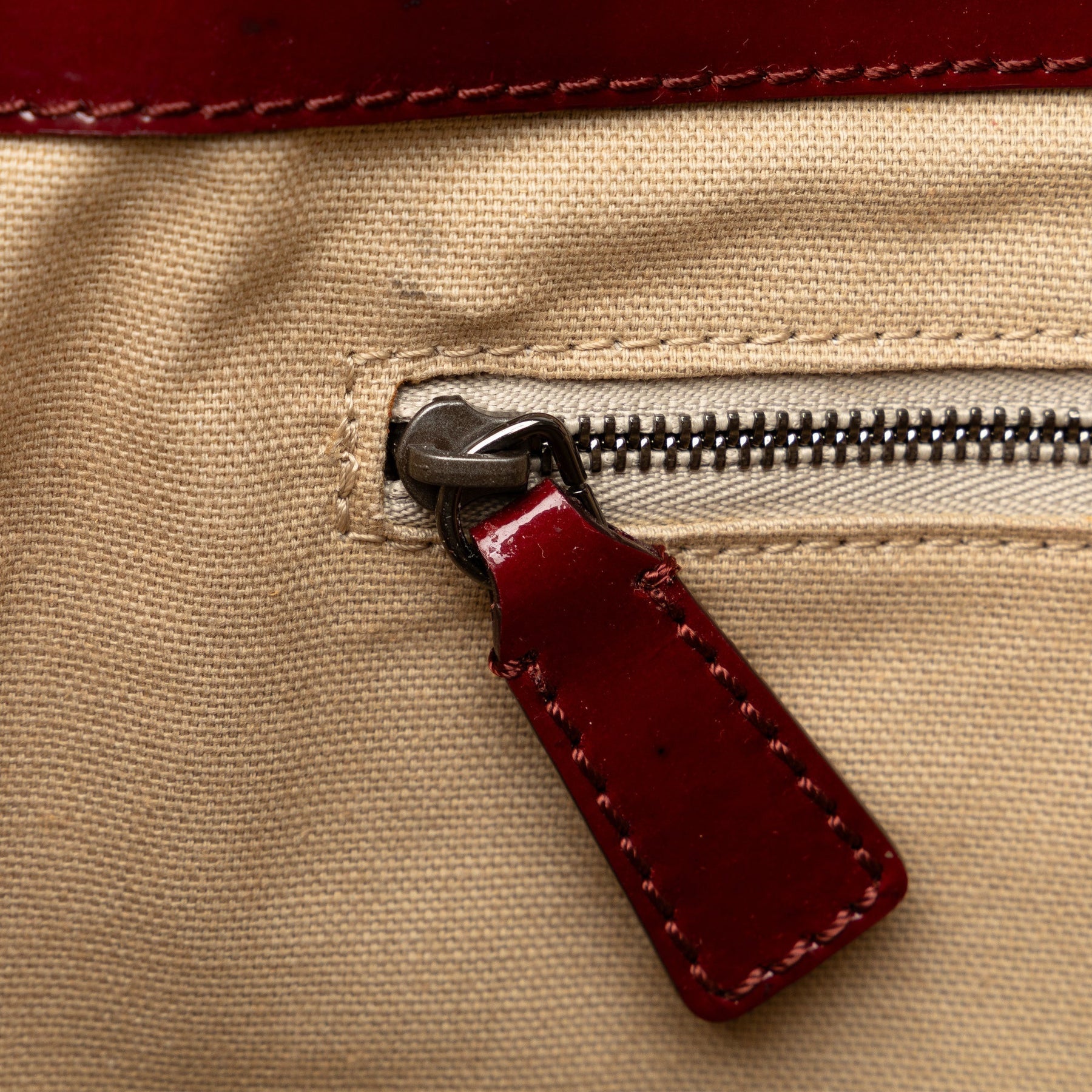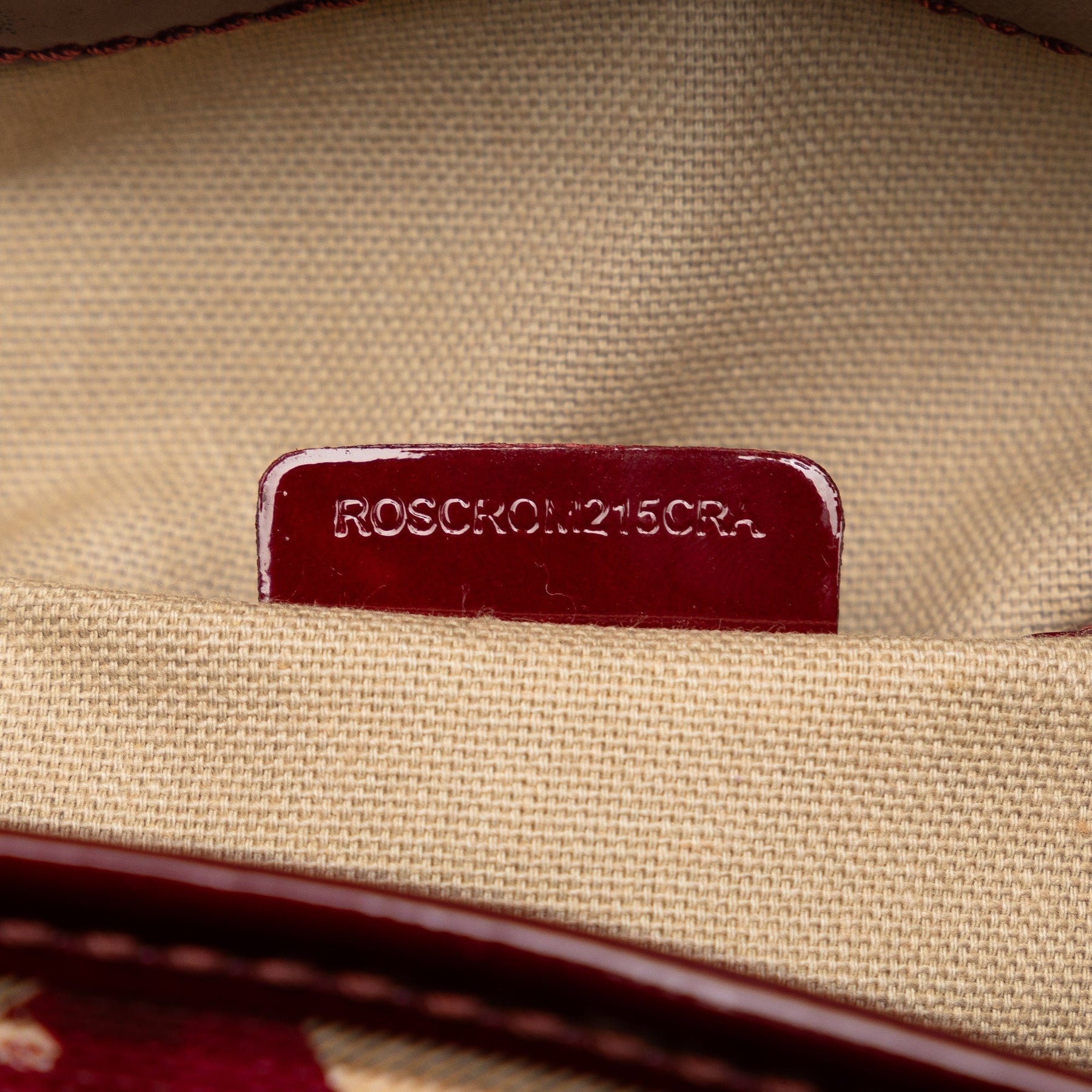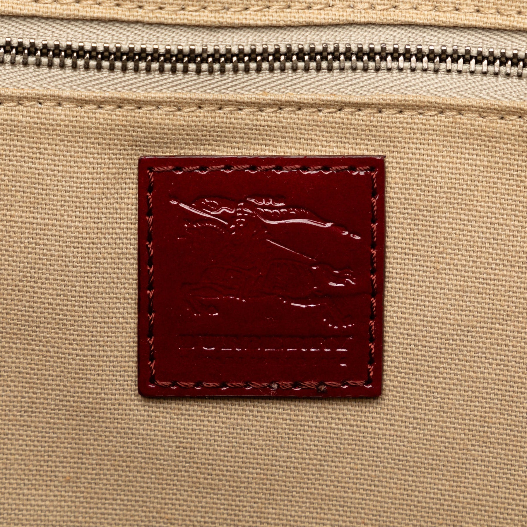 This tote bag features a coated canvas body with patent leather trim, flat leather straps, an open top with snap button closure, and interior pockets.