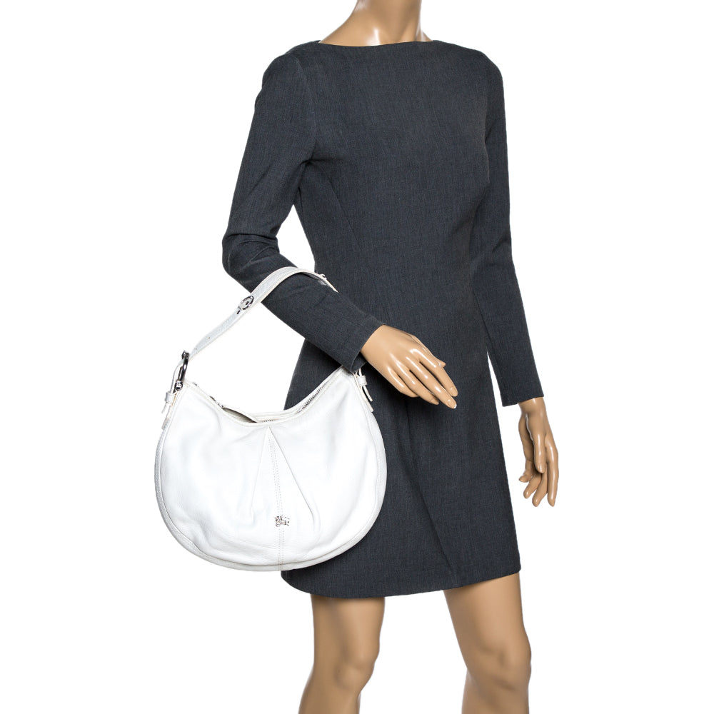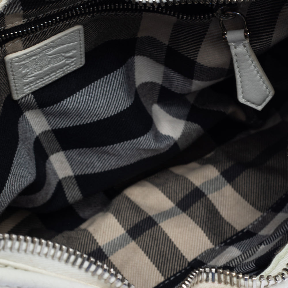 The fashion house of Burberry offers this white hobo bag crafted from high quality leather for everyday use. Lined with their signature check fabric it features silver tone hardware a single handle and a rounded base.