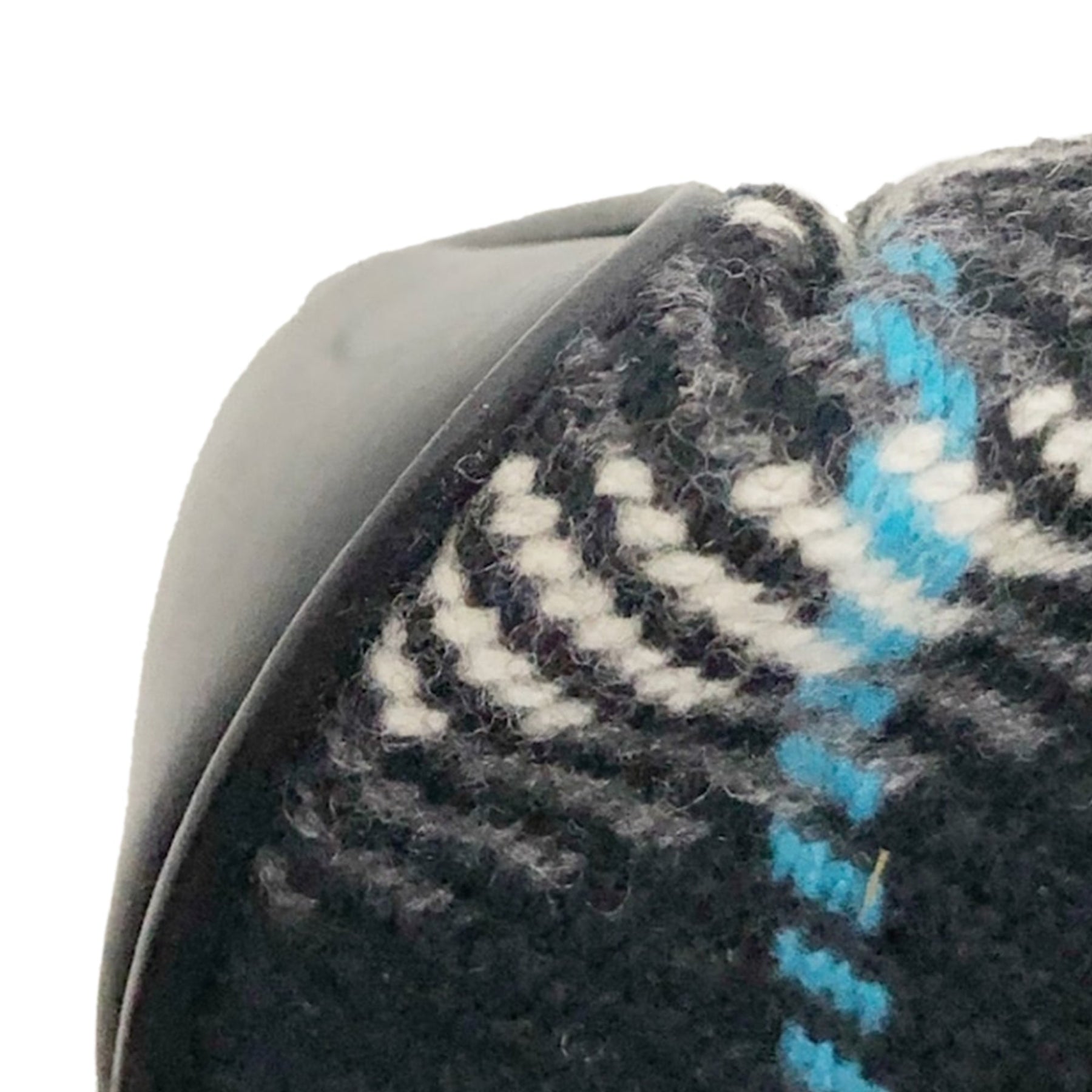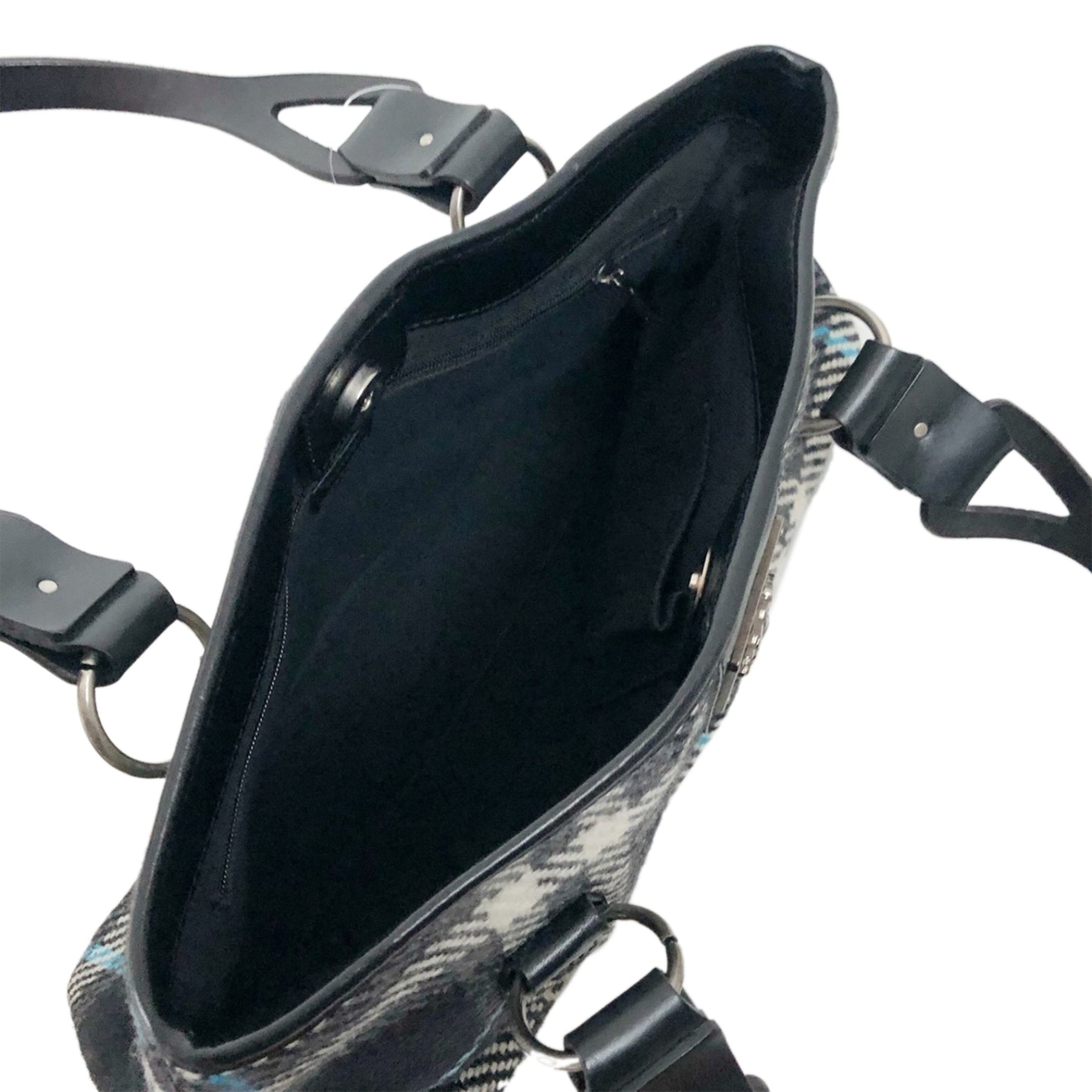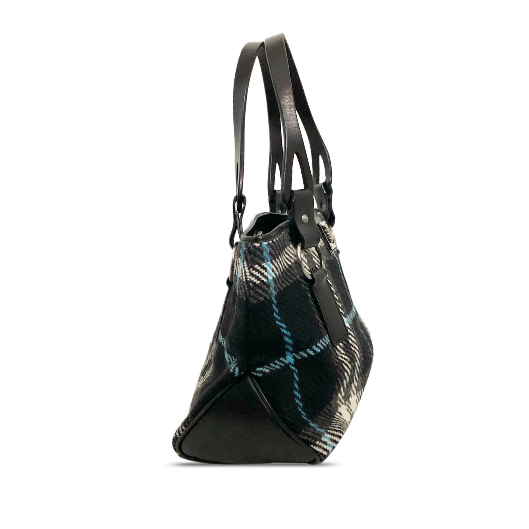 This handbag features a wool body, flat leather handles, an open top with magnetic snap closure, and interior zip and slip pockets.
