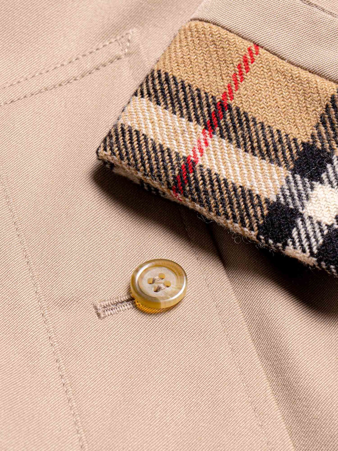 Burberry Nova Check Lined Wool Coat or . This coat is in a dark beige wool fabric and featured nova check accents throughout and a pleat in the back. There is also a fully detachable collar and lining.