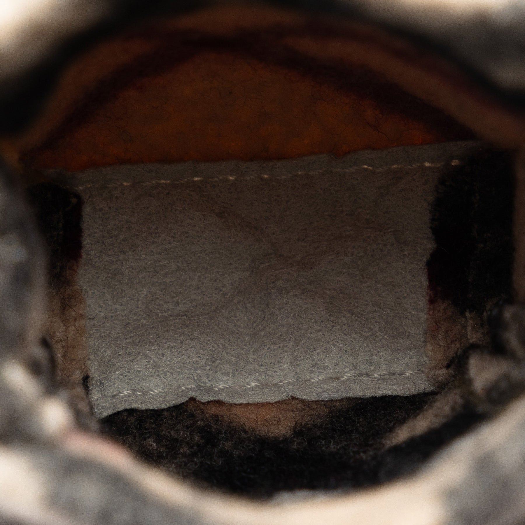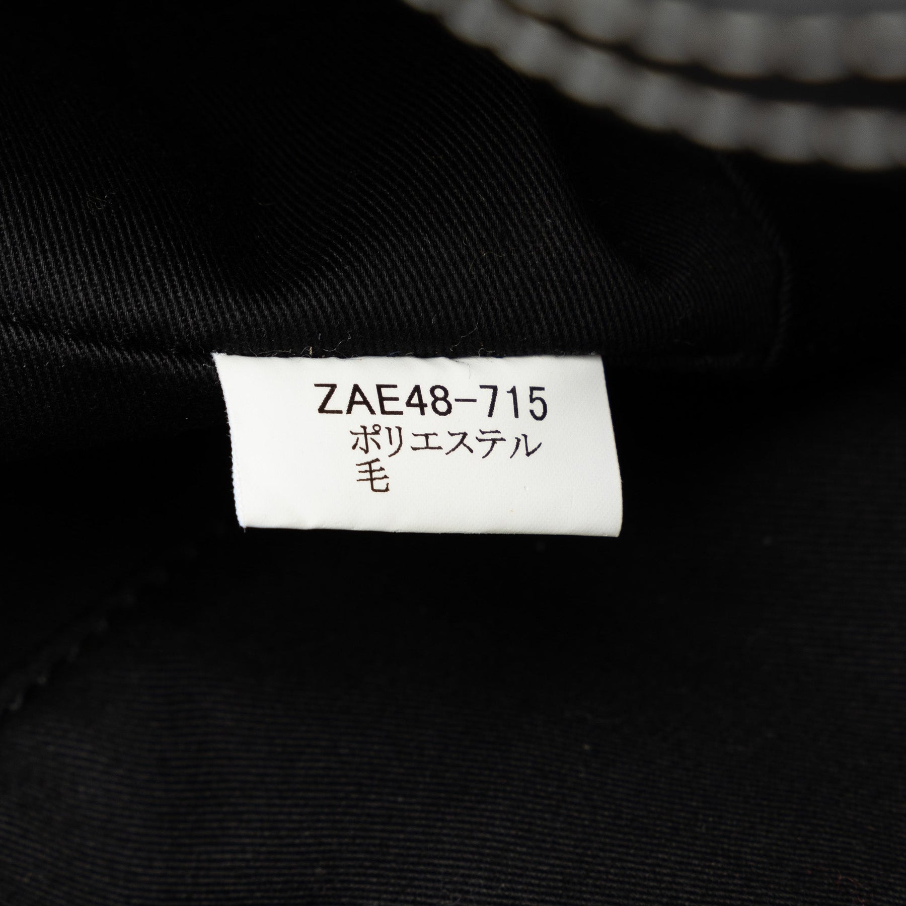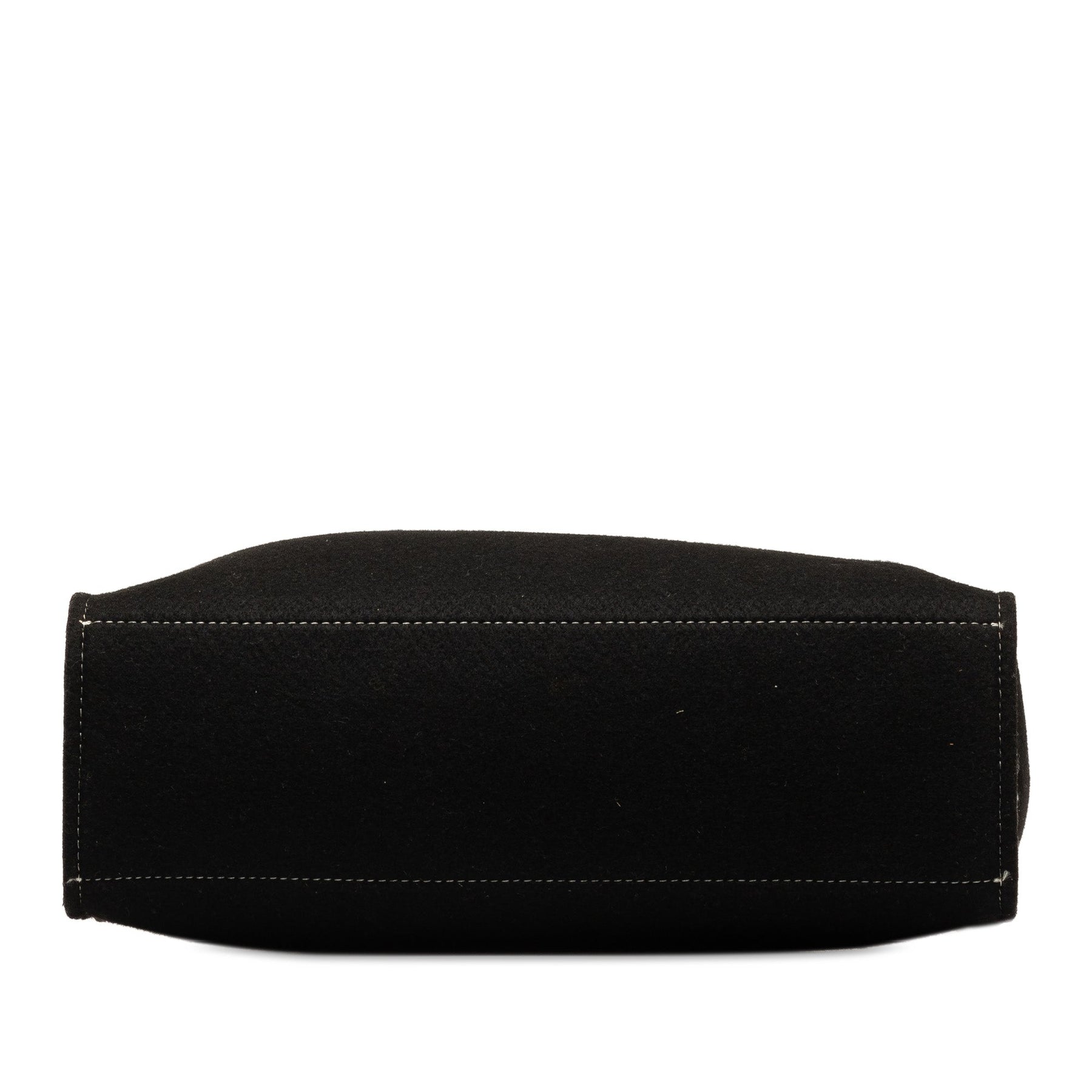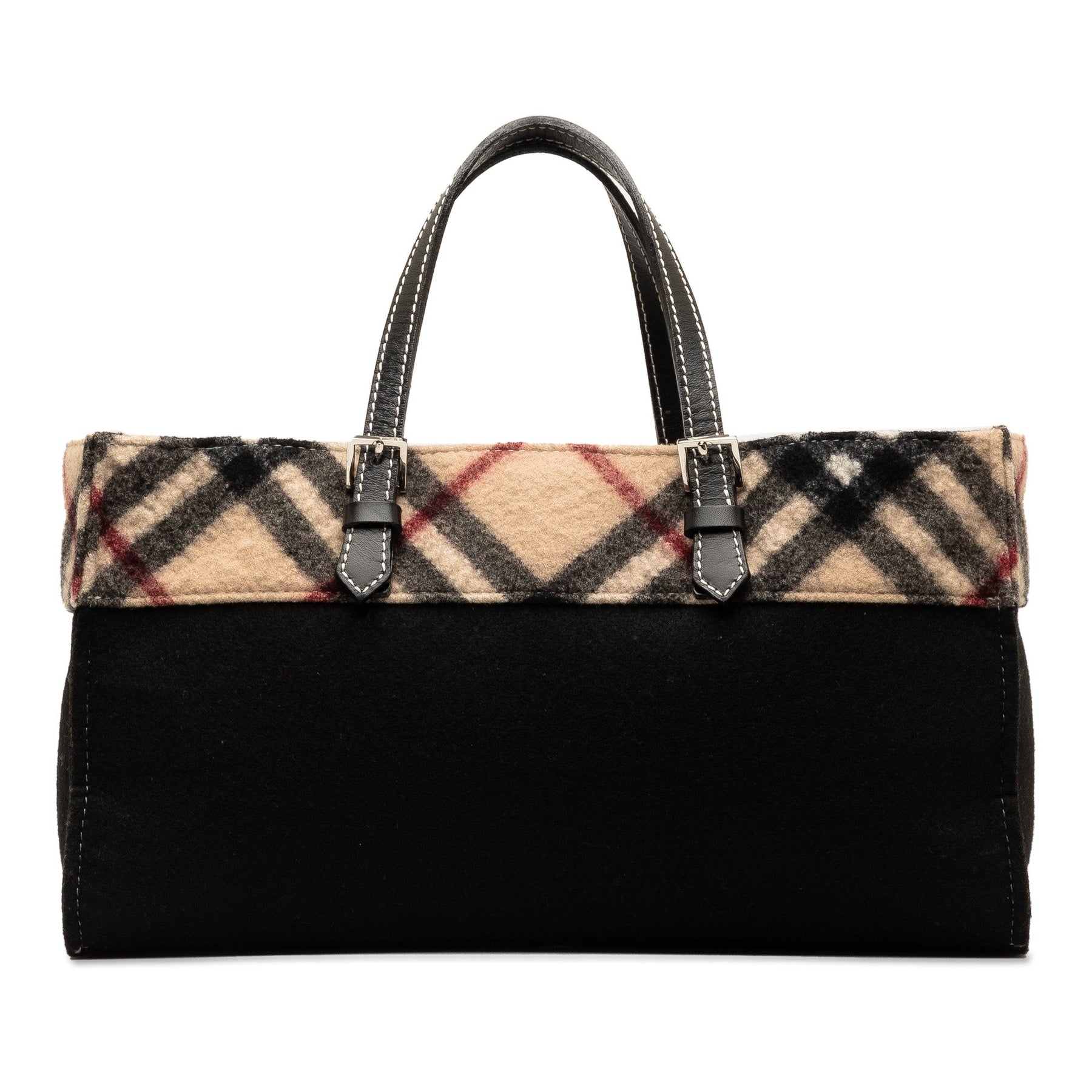 This handbag features a wool body, flat leather handles, an open top with strap closure, and interior zip pocket.