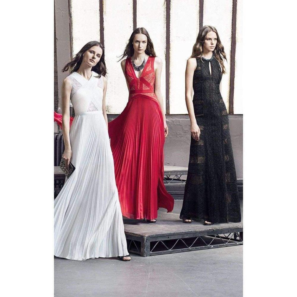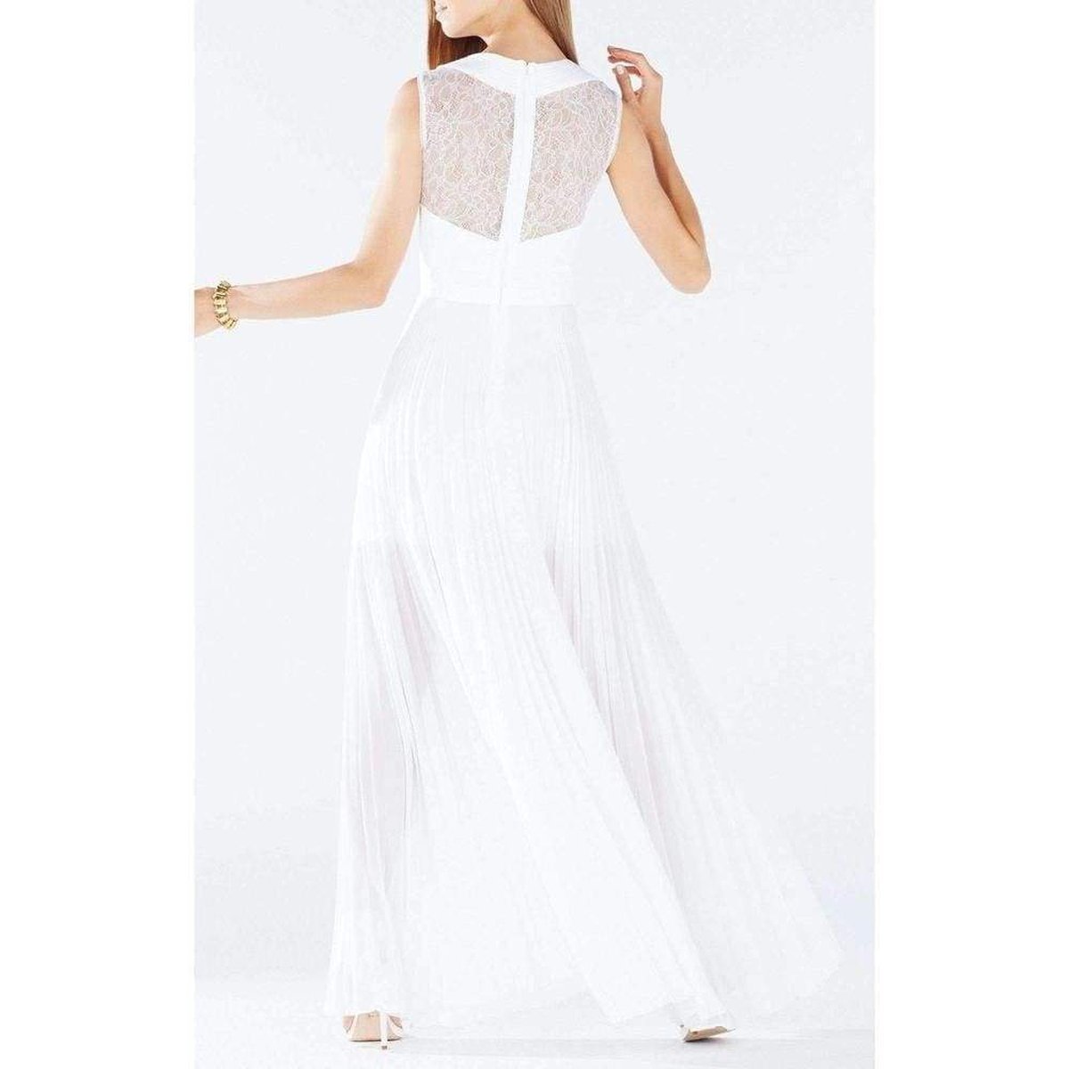 Embody a look of true grace and sophistication in a floor-sweeping silhouette, finished with fluid sunburst pleating and hints of lace for a romantic touch.