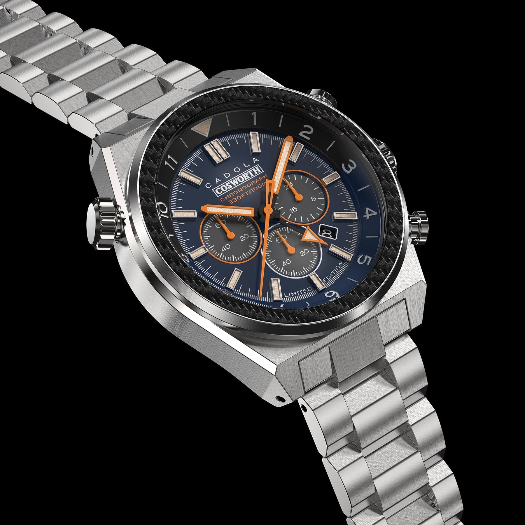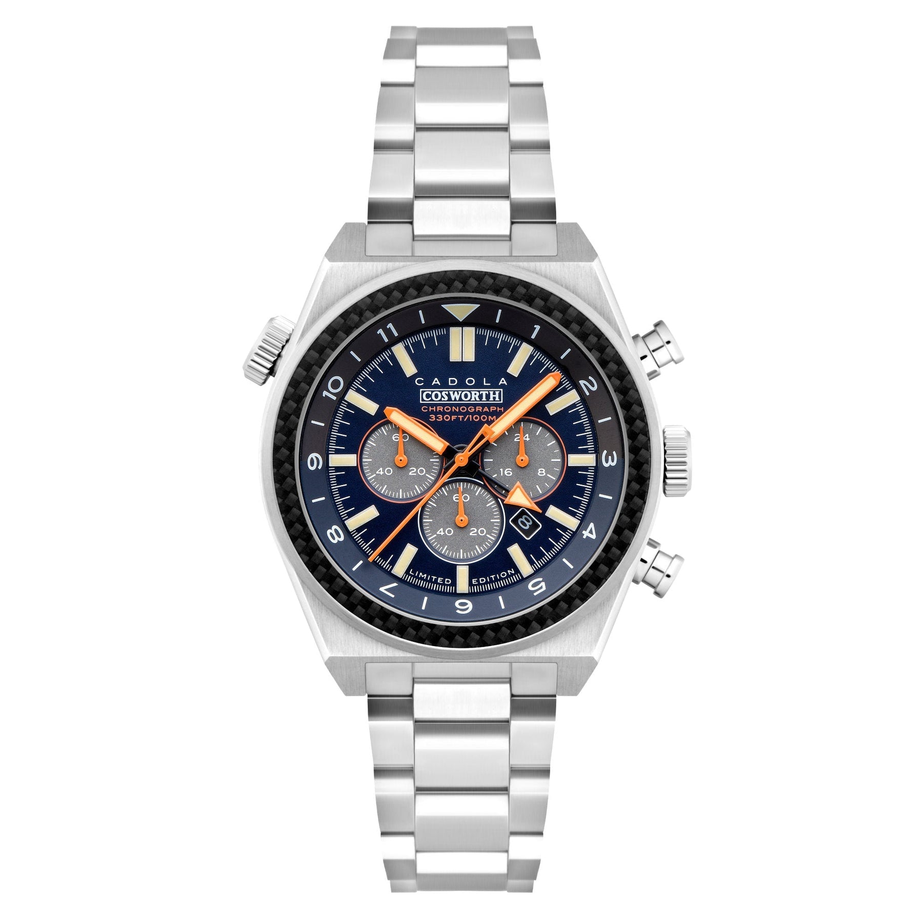 Collection Name: Cosworth Costin, Gender: Men's, Case Shape: Round, Case Material: Stainless Steel, Case Back: , Case Width (mm): 42, Case Thickness (mm): 14, Case Crystal: Mineral Crystal, Case Water Resistance: 100 m (330 feet), Dial Color: Blue, Band Type: Bracelet, Band Material: Stainless Steel, Band Color: Silver, Band Length (in.): 8, Band Size Width (mm): 20, Band Clasp: Deployment Clasp, Features: Chronograph, Movement Type: Quartz, Movement Caliber: M-MIY-FS26-D4.5BKW, Movement Crown: Pull and Push Crown, Country of Origin: Made in China,