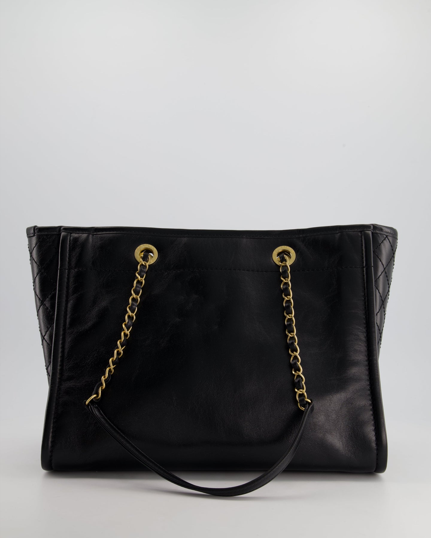 Chanel Black Small Deauville Tote Bag in Shiny Calfskin Leather with Antique Gold  Hardware and Pearl, Crystal Logo Detail