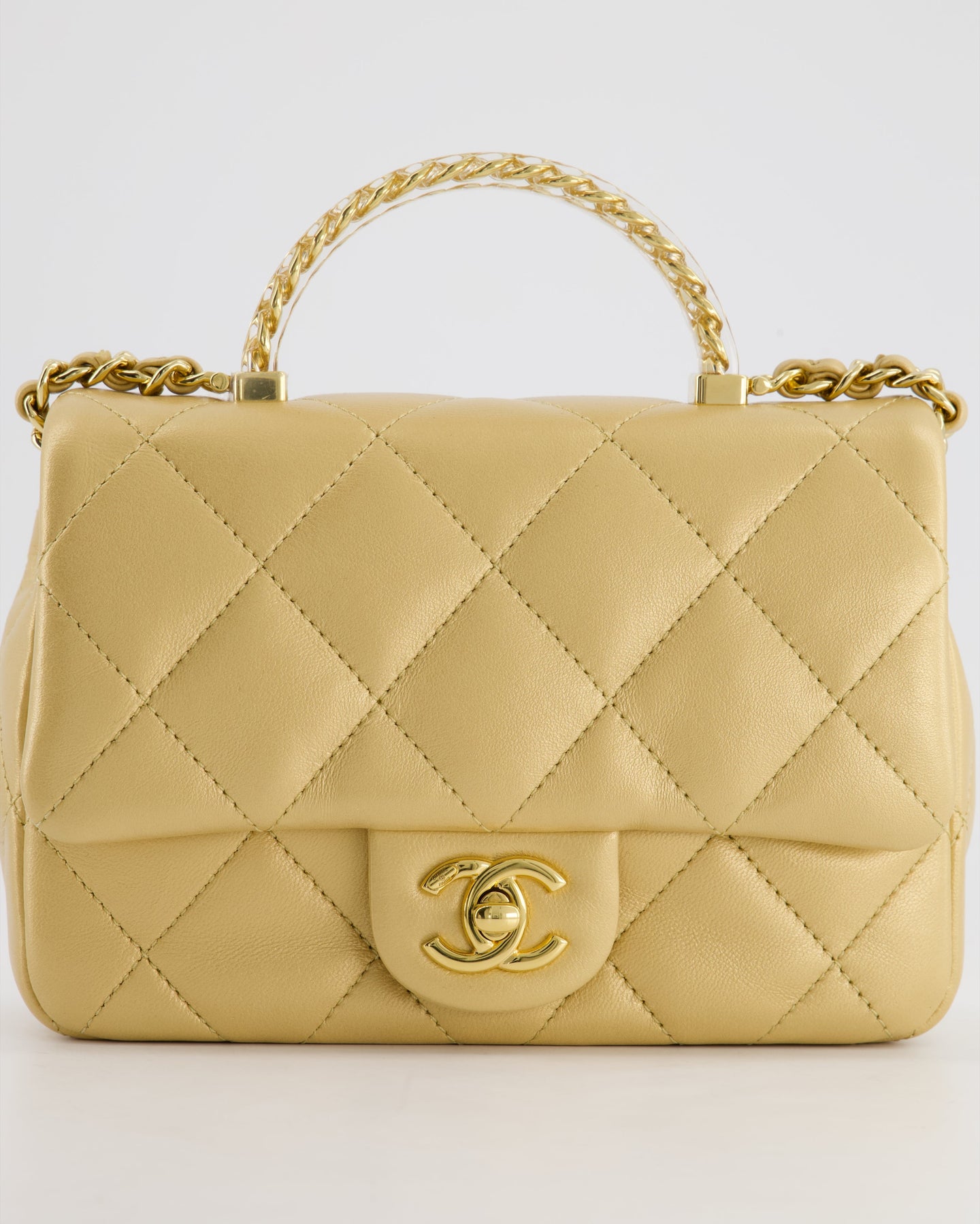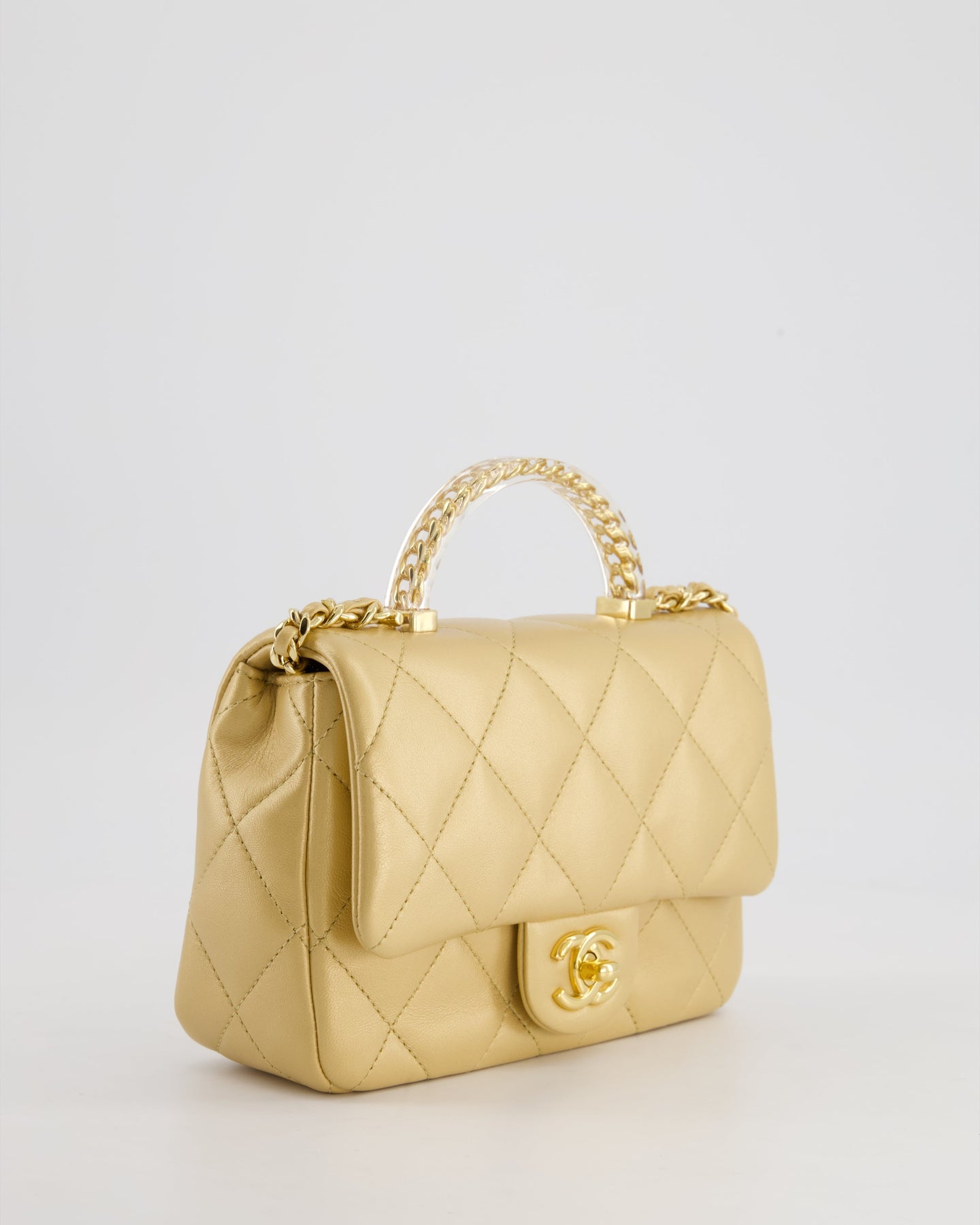 *CURRENT COLLECTION* Chanel Metallic Gold Mini Top Handle Bag in Calfskin Leather with Gold Hardware and Clear Perspex Handle Detail