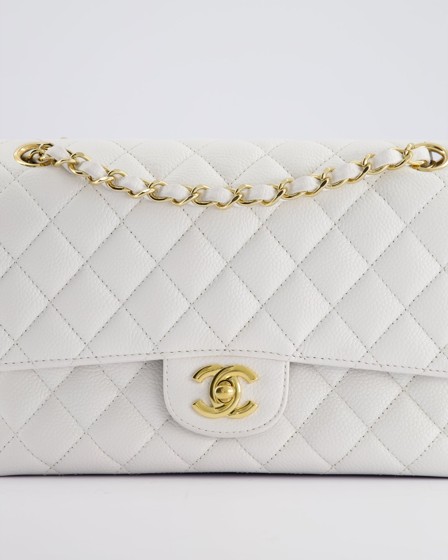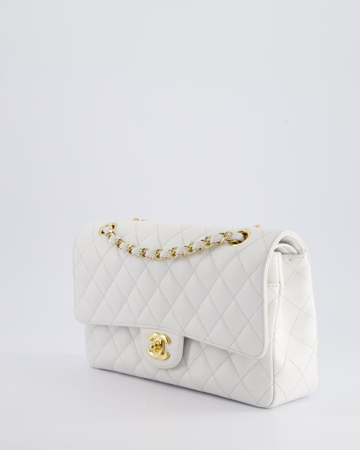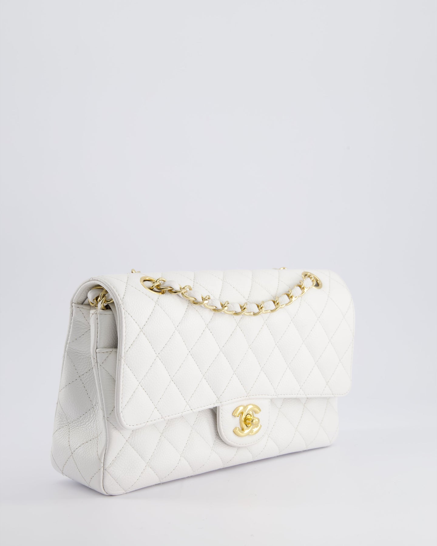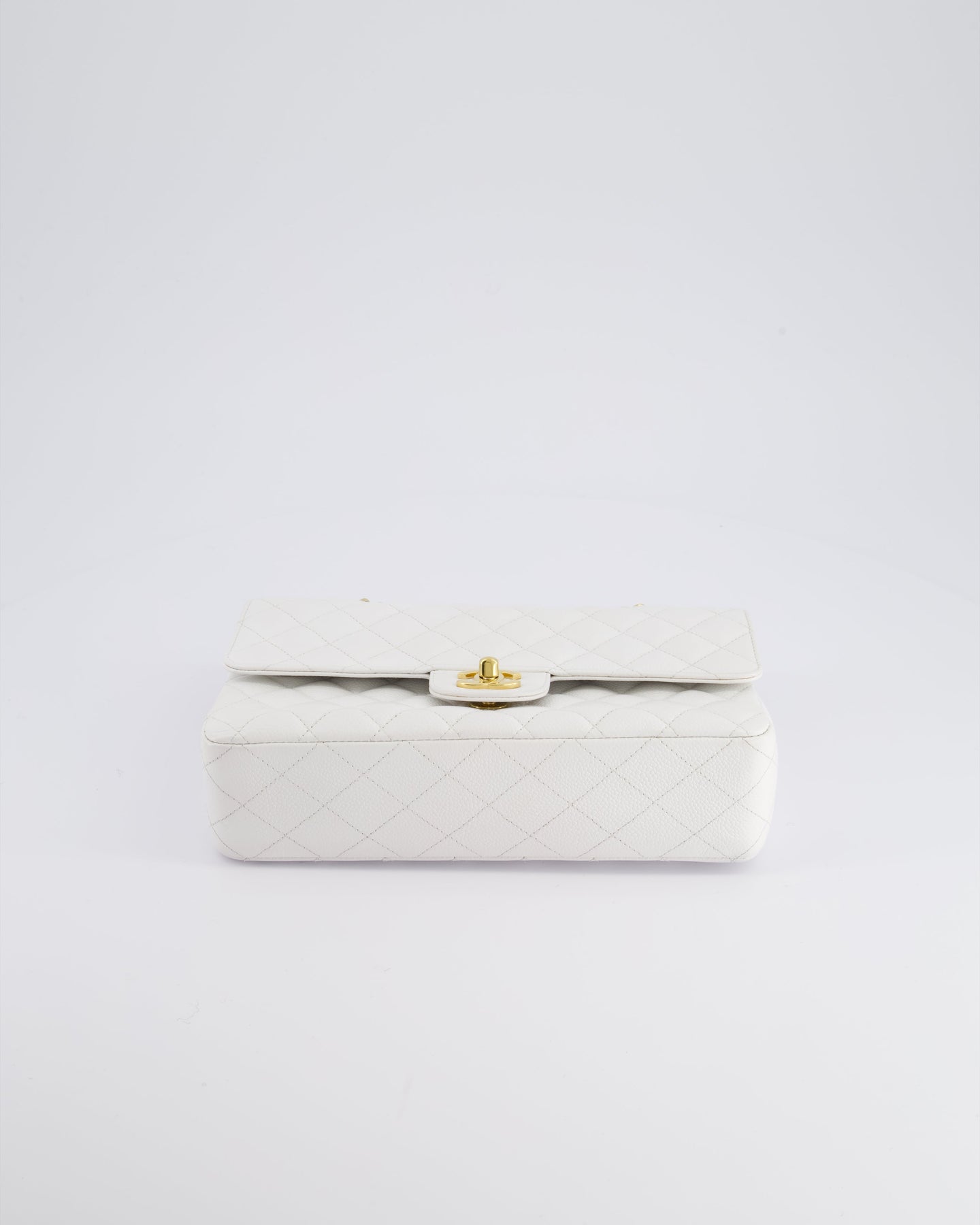 Chanel White Medium Classic Double Flap in Caviar Leather with Gold Hardware