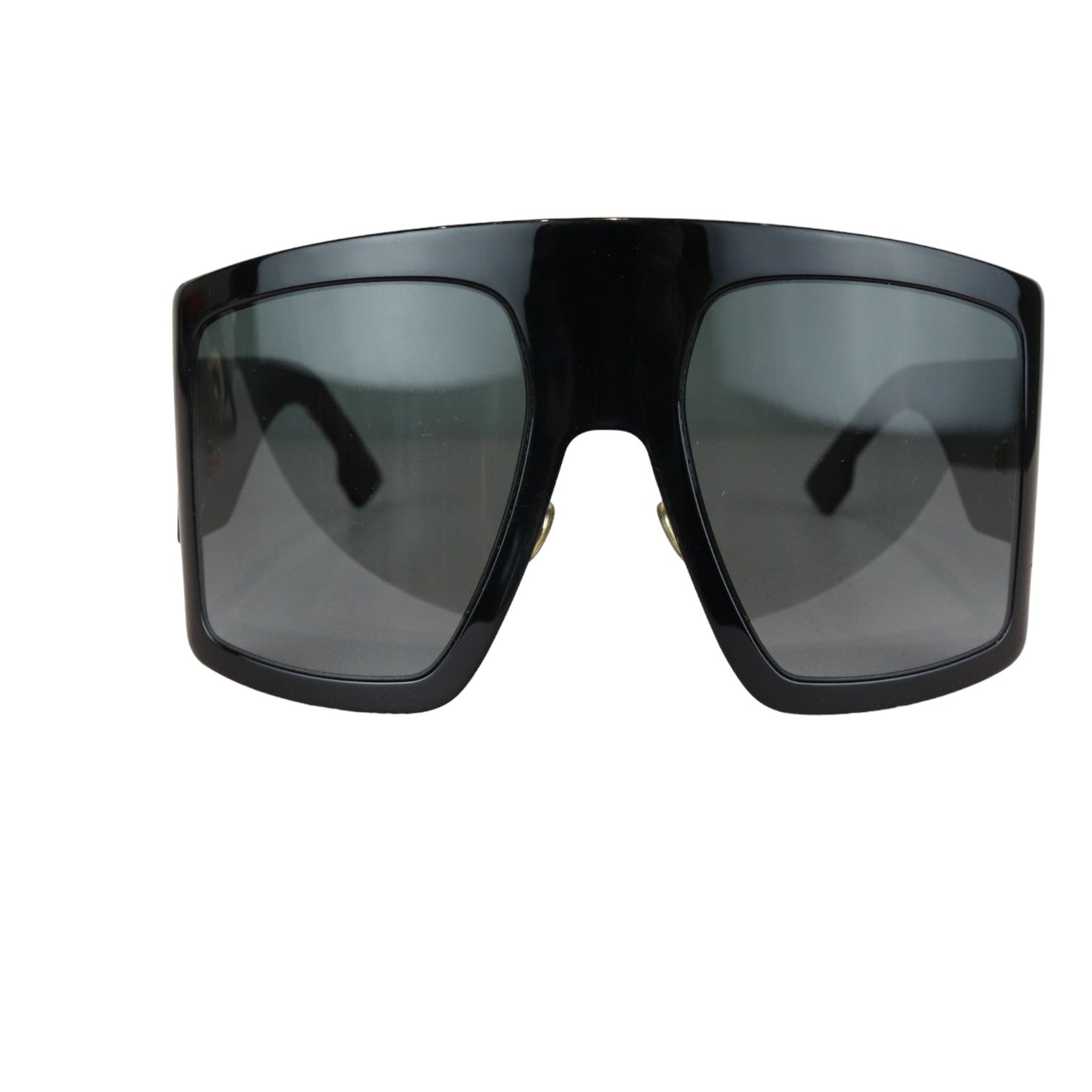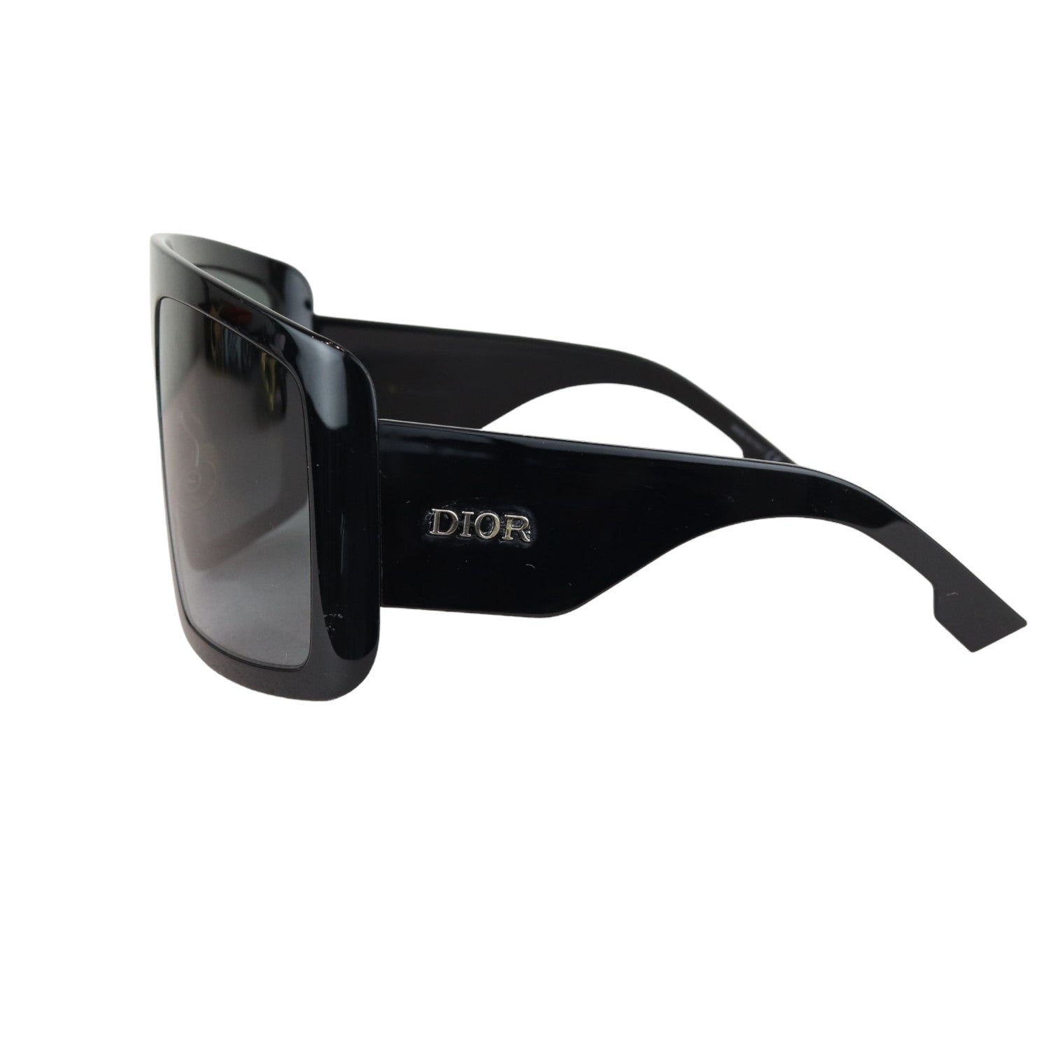 This is an Christian Dior Acetate DIORSO Light 1 Shield Sunglasses in Black. These stylish sunglasses have a black oversized frame with ombre lenses and feature the gold Dior logo on the arms at the temples.