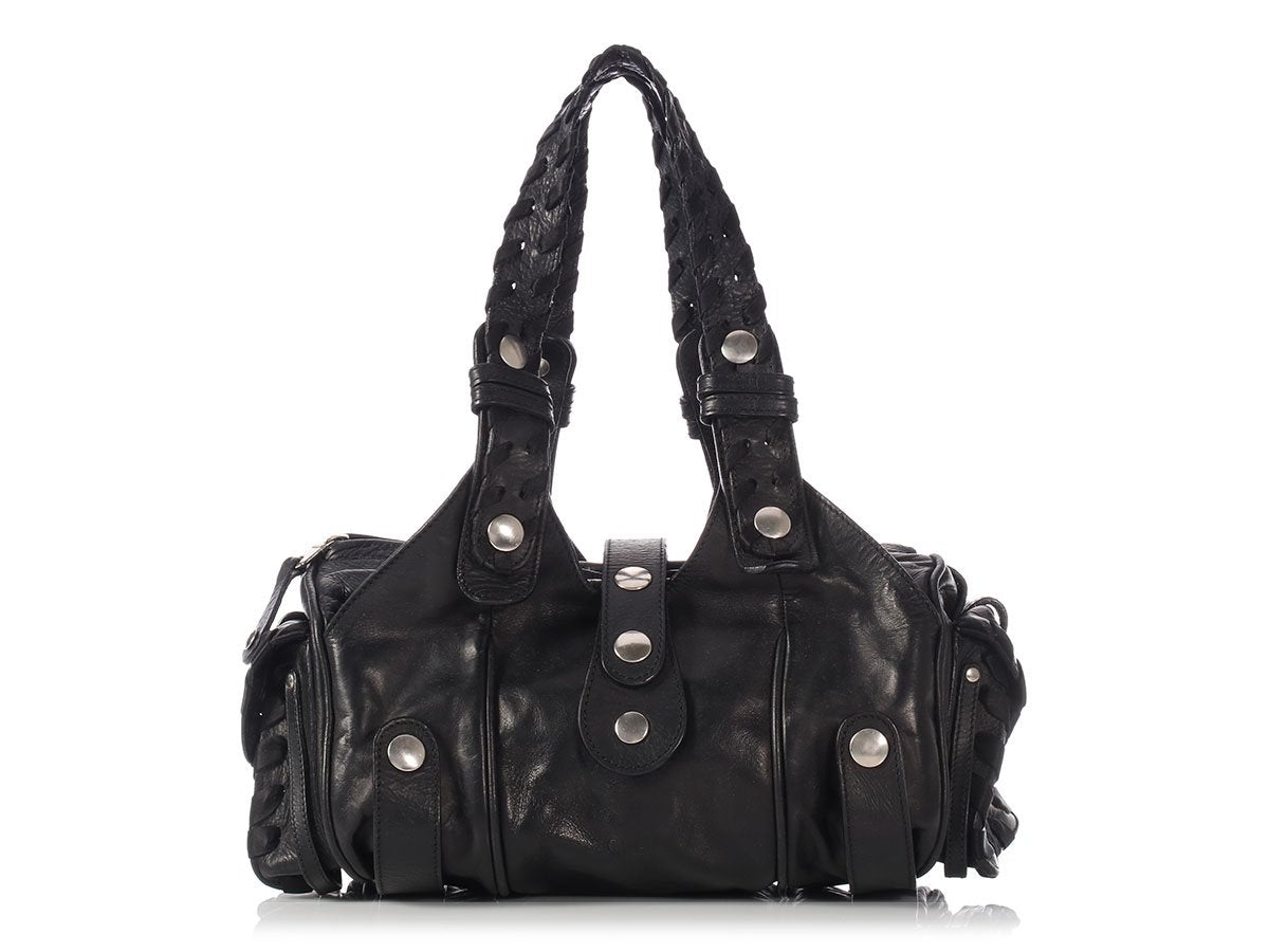 Made of supple calfskin leather, Chloé’s Black Silverado feels like a dream on your shoulder! The whipstitched straps have a drop of 9.5 inches and below them you’ll find a large slide pocket on the front, a large slide pocket on the back, a snapped flap pocket on each side, and silver hardware. A small snapped strap pulls over the zipped top and inside you’ll discover black fabric lining with one zipped pocket inside. This satchel comes with a dustbag, info card, and tag and it has scratches and stress marks on the leather that blend in well, wear on the corners, handles, and inside, loose threads throughout, and a mild perfume odor. If lovely leather is your thing, you’ll swoon for this Silverado!