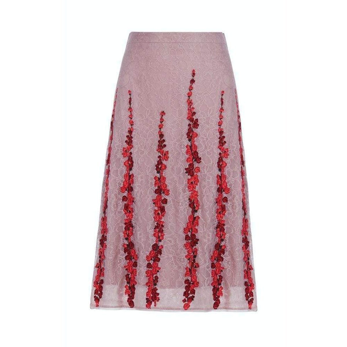 Up the romance in a sultry midi skirt, emblazoned with fluttering bougainvillea embroidery set against semi-sheer lace.