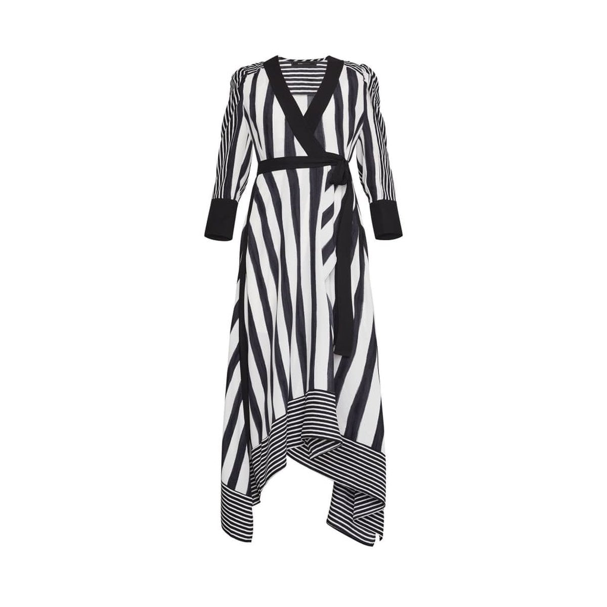 Fabric Self and Contrast 1: 100% polyester satin back crepe stripe; Contrast 2: 100% polyester crepe;