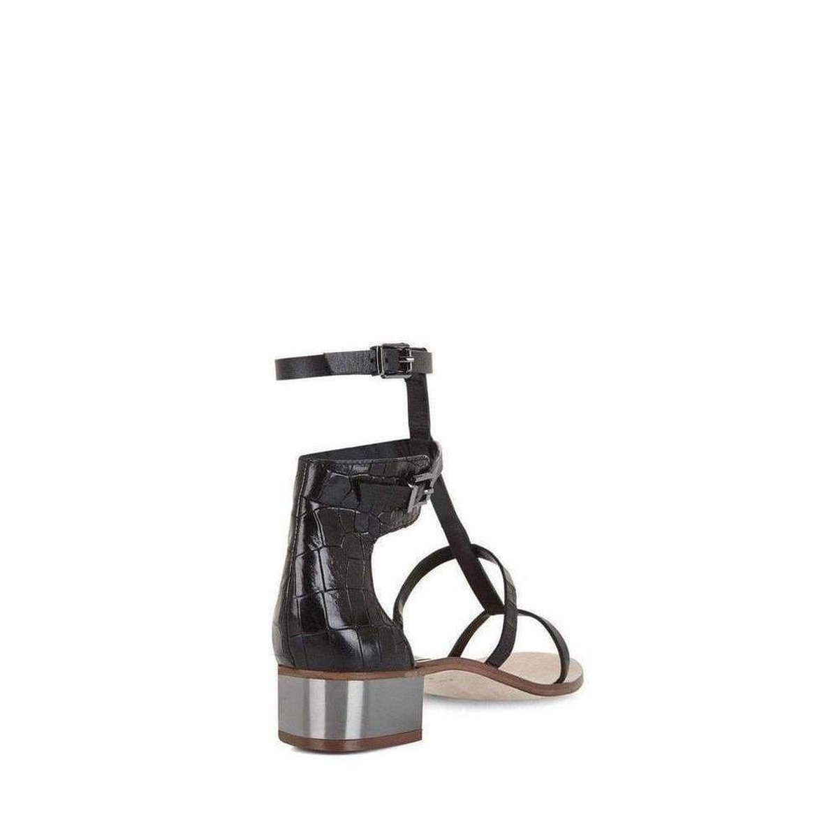 Multiple straps at ankle with adjustable side-buckle closure at top strap.
