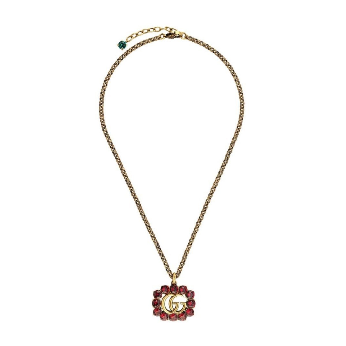 The Gucci Pink Crystal Double G Marmont Necklace in Gold is crafted from an aged gold-tone hardware and pink crystals in Italy. This necklace features the signature GG logo framed by a circle of sparkling pink crystals, a textured chain, and small, green crystal charm.