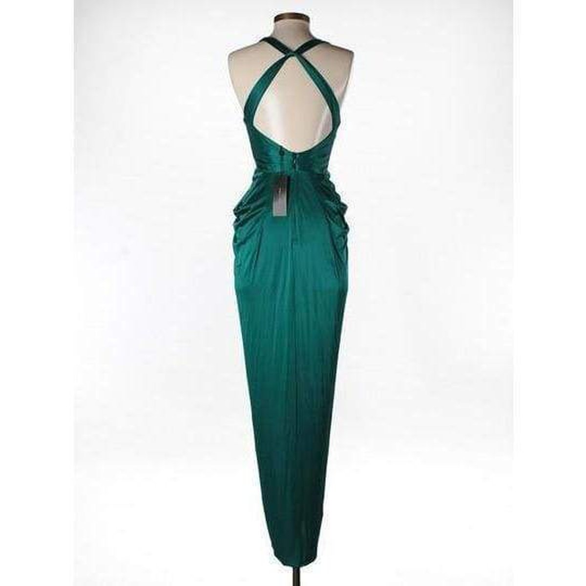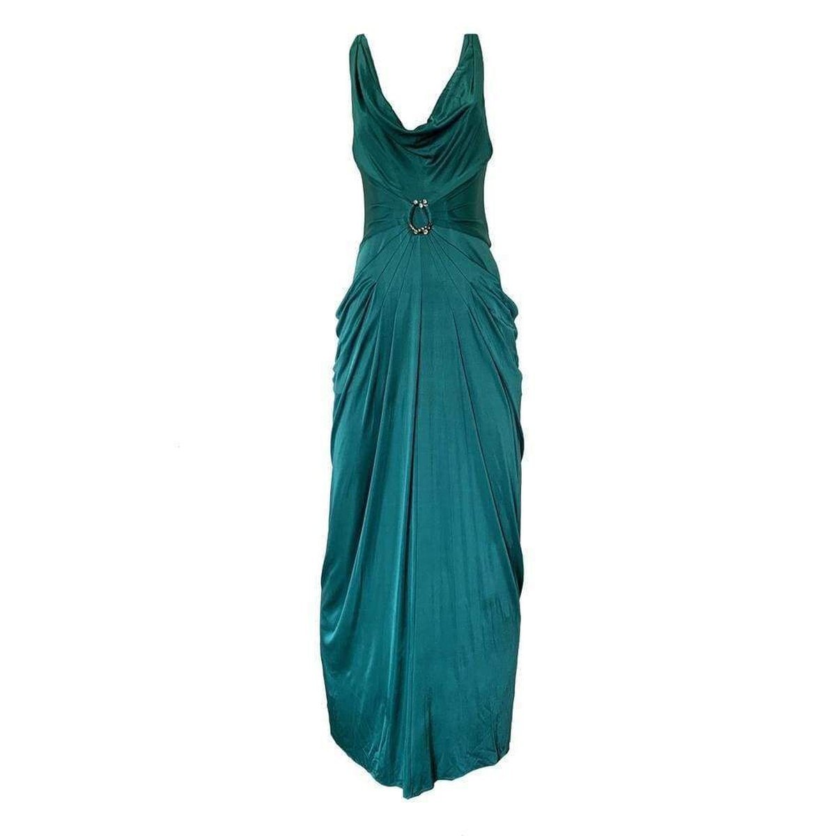 Cowl Neck stretch Satin gown featuring pockets and a beautiful rhinestone accent. Flattering on any figure!