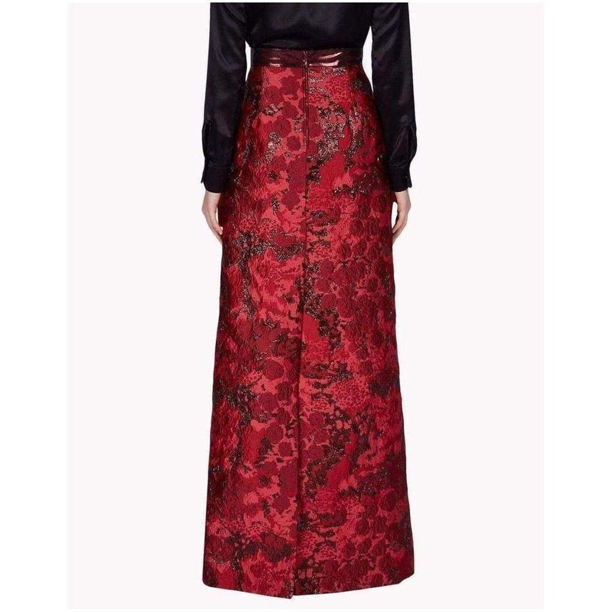 The rich red crimson floral pattern creates a long, elegant silhouette.