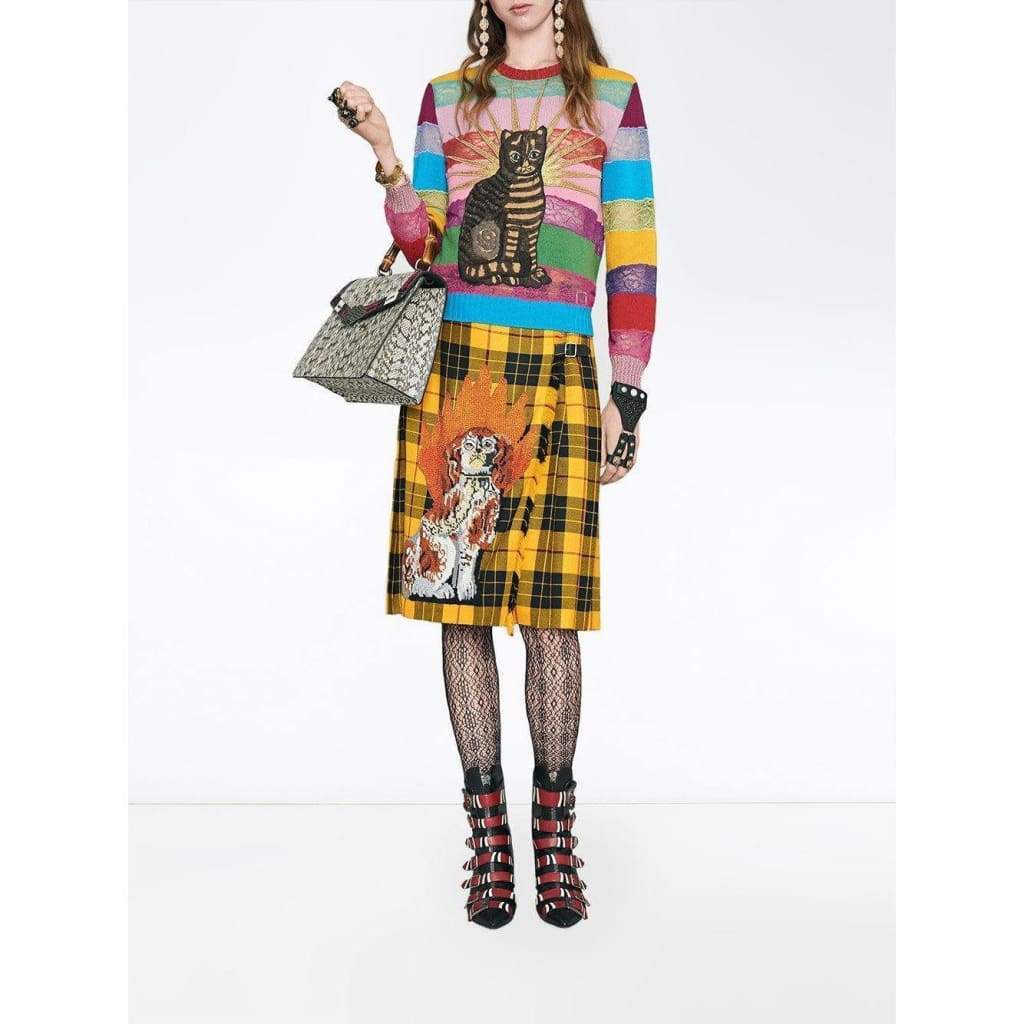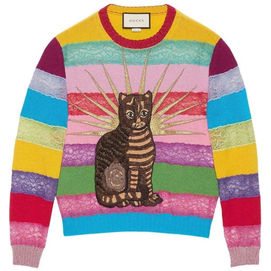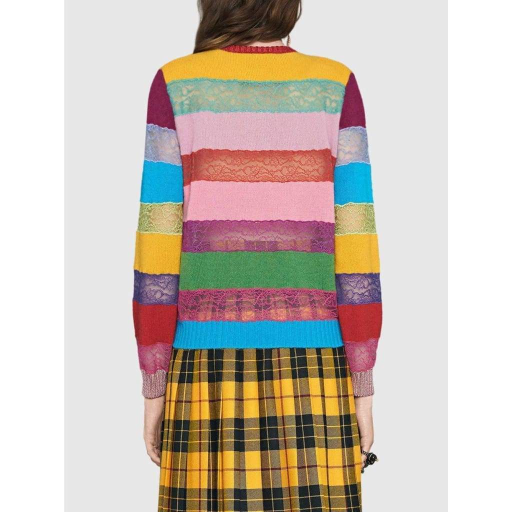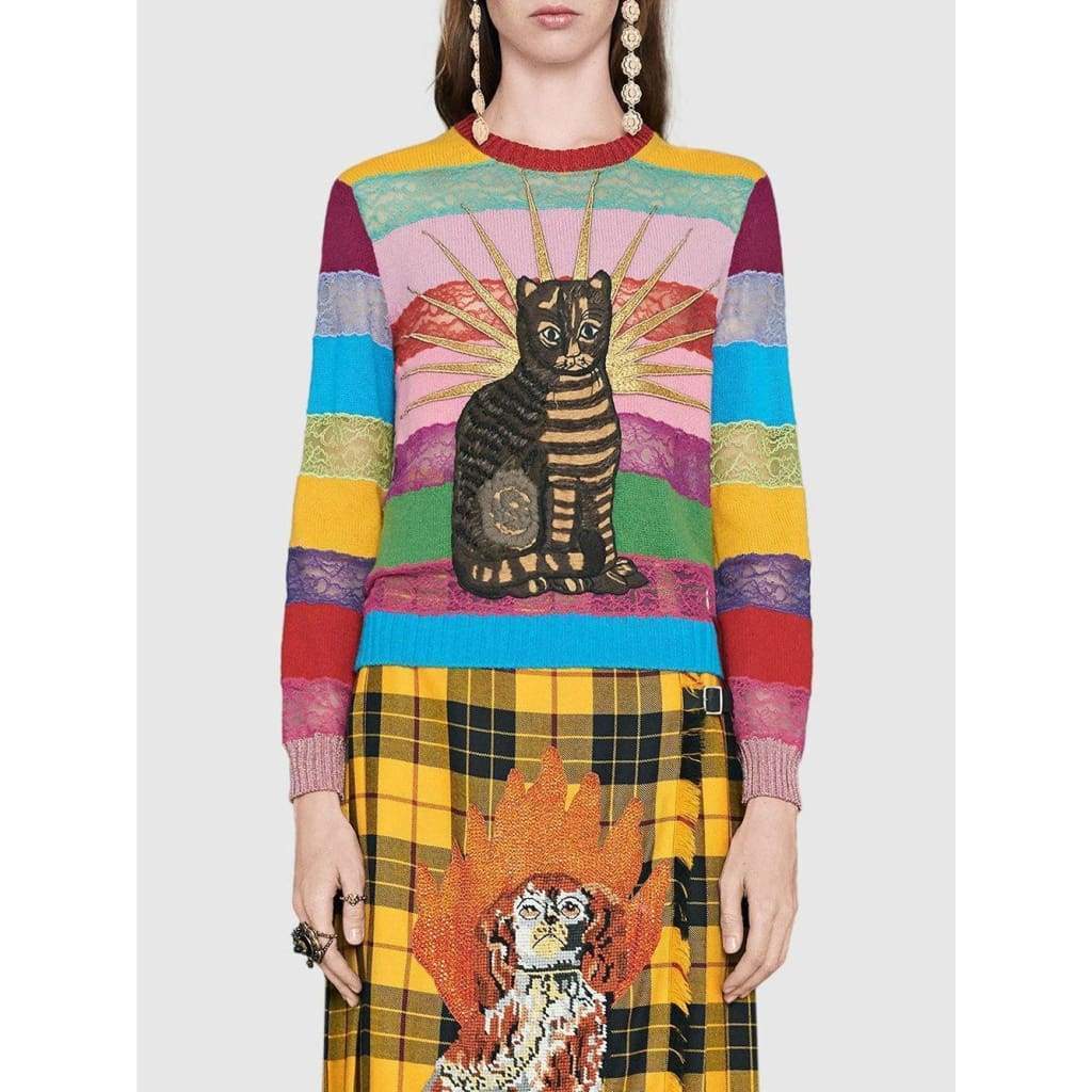An alternating striped sweater with merino and lace in multicolors with an embroidered cat appliqué with rays on the front. Multicolor merino wool with lace stripes.