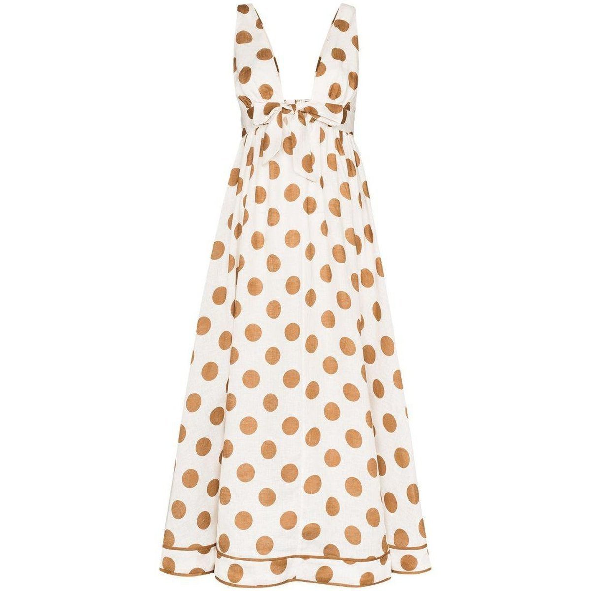This white Zimmermann Empire polka dot maxi dress features a deep V-neck, a tie front, adjustable shoulder straps, a shirred back panel, concealed zip fastening and a flared skirt. Crafted from linen, it's printed with brown polka dots and has a coordinating trim at the hem. Partially lined