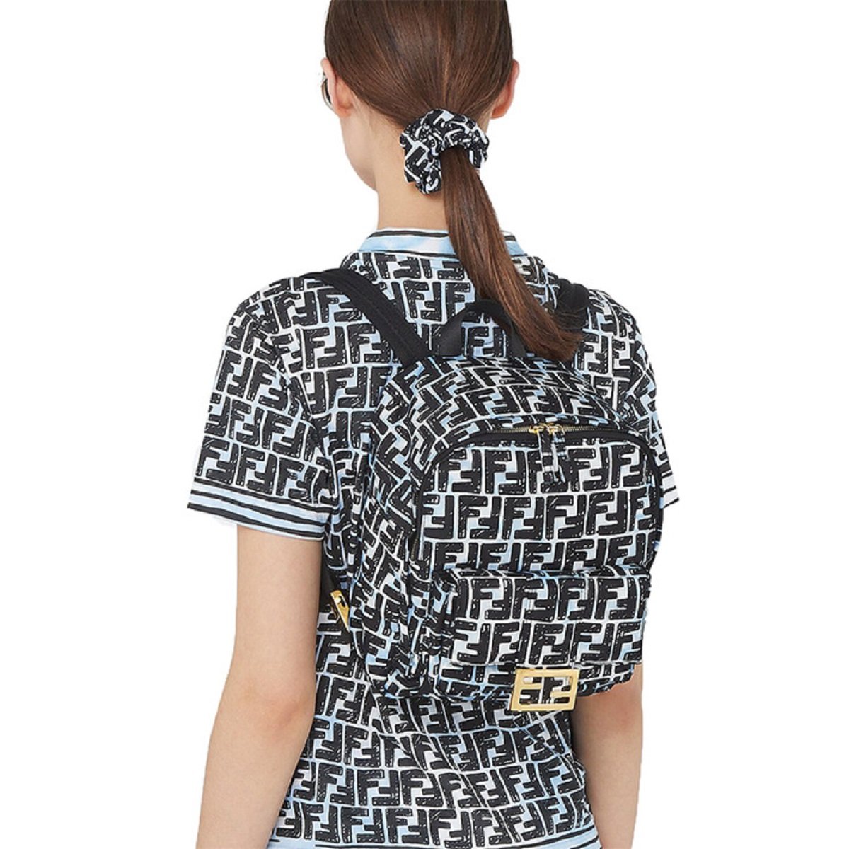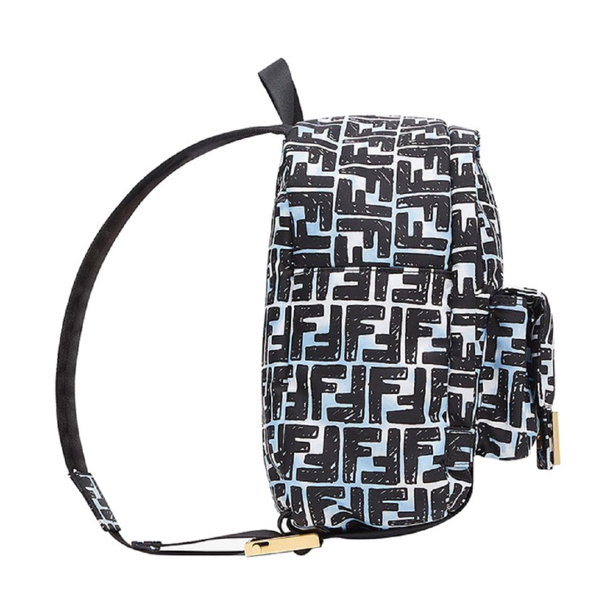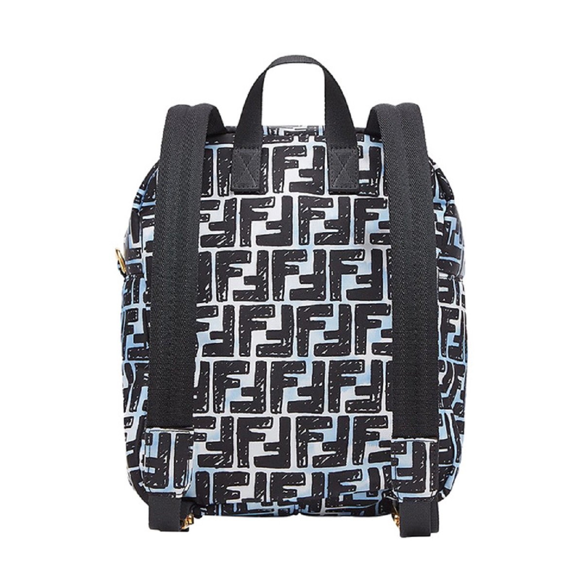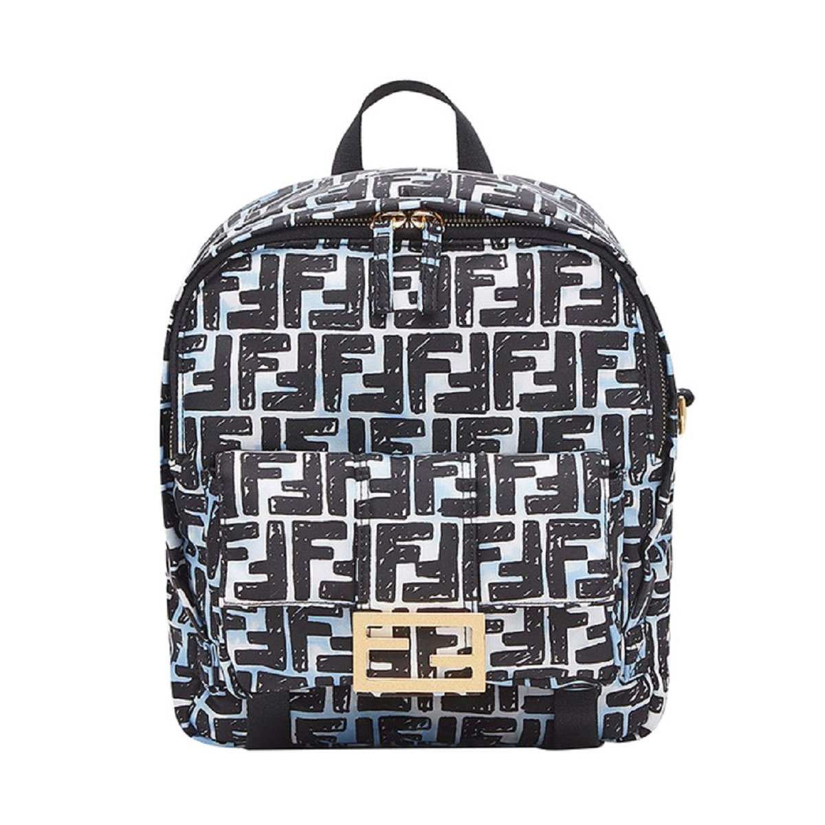 This backpack from Fendi is crafted using blue and white nylon with a black FF print. The backpack features gold-tone hardware and a front baguette style pocket with the iconic Fendi logo. The double zippers open to a spacious main compartment with a black fabric lined interior and slip pocket. The backpack is equipped with a top handle and adjustable straps for full functionality. This is a one of a kind backpack, with the unique style and quality of Fendi!