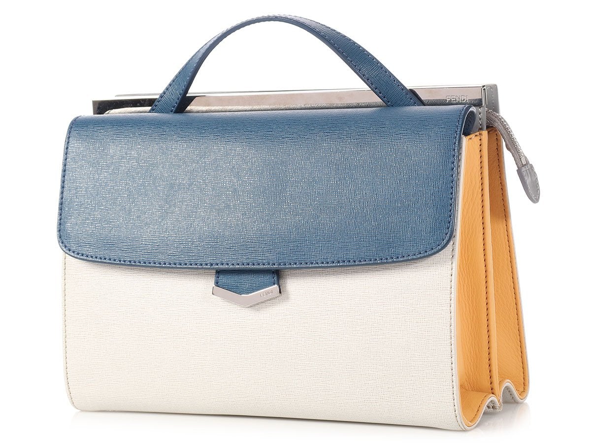 Expand your color-coordinating horizons when you carry Fendi’s Colorblock Demi Jour! Not content to sport just one hue, this structured satchel is made of thick, textured white, blue, yellow, and gray leather with silver logo hardware. The short top handle has a 2.25-inch drop, while the detachable, adjustable strap is shown with a crossbody-friendly 20.5-inch drop. Divided into two blue-striped fabric-lined sections for great organization, this Demi Jour has a magnetic flap on the front that opens up to one interior slide pocket, while the zipped rear section has no pockets. Arriving with a dustbag and cards, it has scratching on the hardware, a few indentations on the back, very subtle staining on the bottom, and a bit of wear inside. Pair it with a vibrant ensemble to up your color quotient or let it take center stage against a backdrop of dark hues or neutrals!