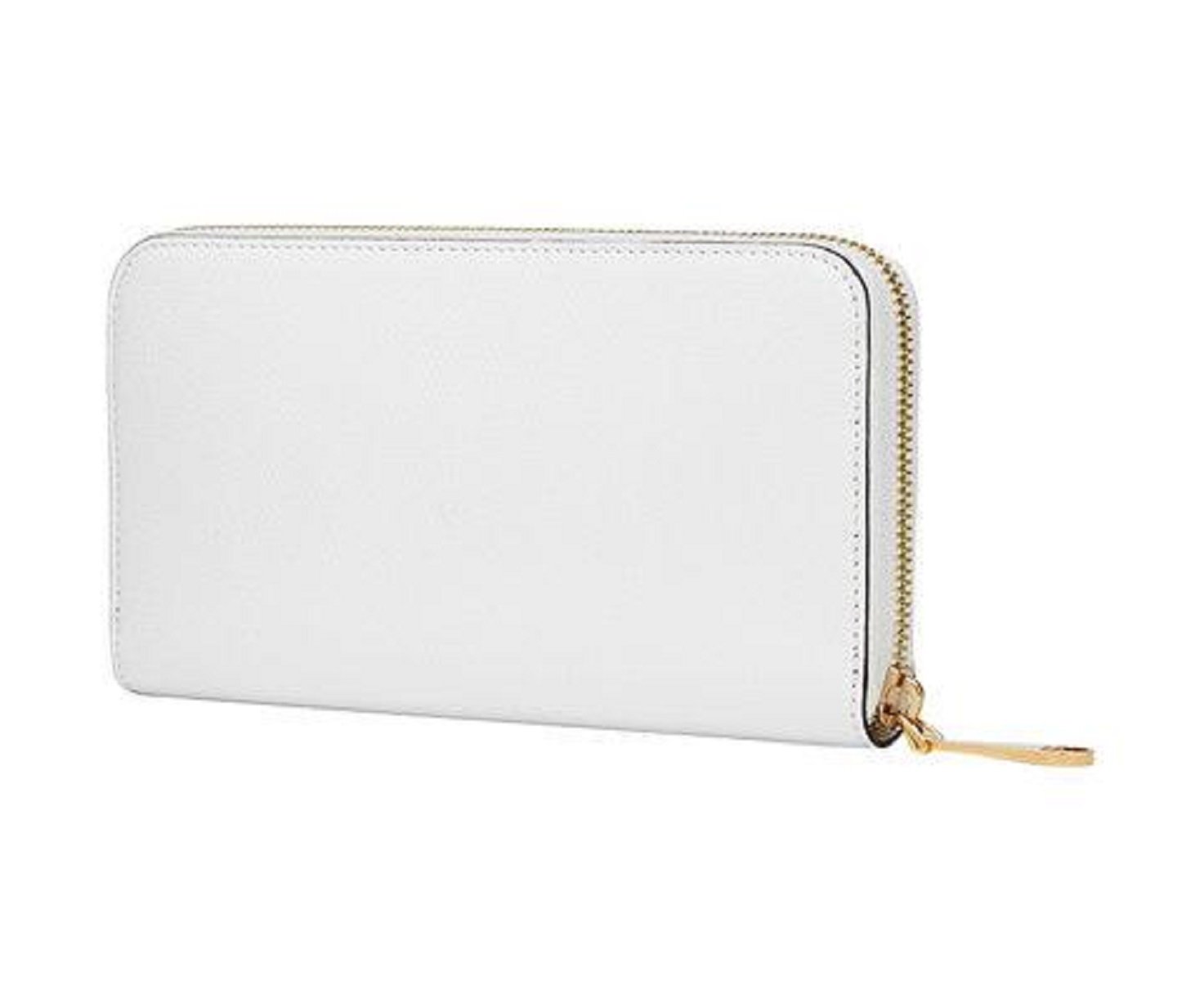 This white long wallet is crafted with grained calfskin leather and features a gold-tone metal Fendi logo on the front. The zipper opens to a leather and logo twill lining with three gusseted compartments, one zip pocket, two flat pockets, and eight credit card slots. This classic wallet is perfect for everyday use, with the distinctive style and quality only from Fendi!