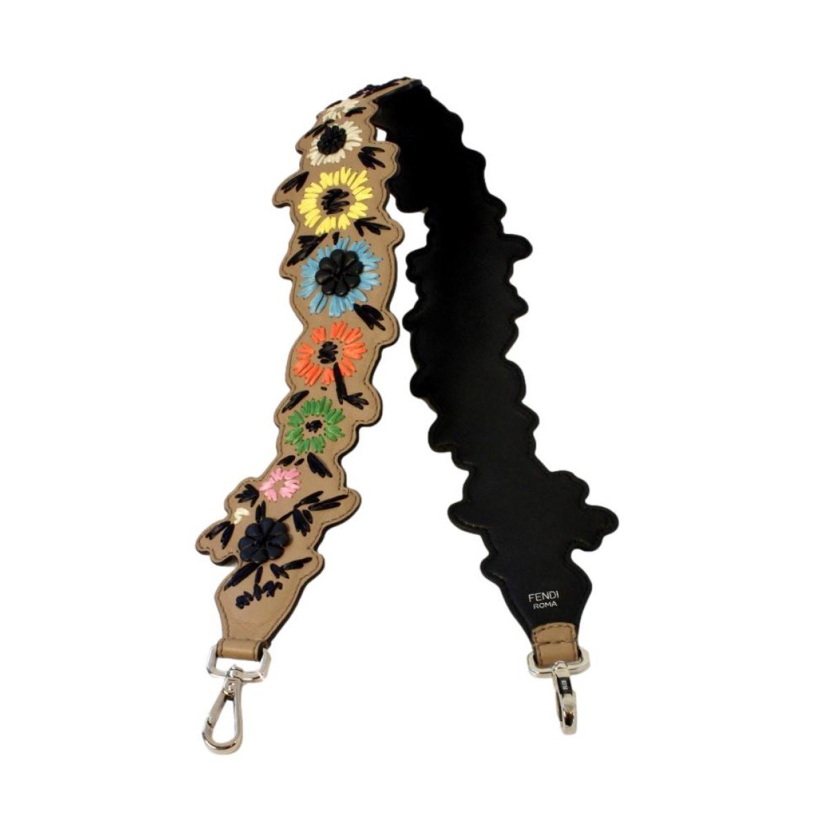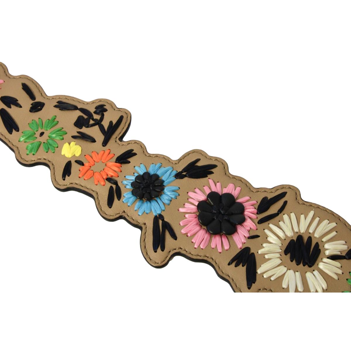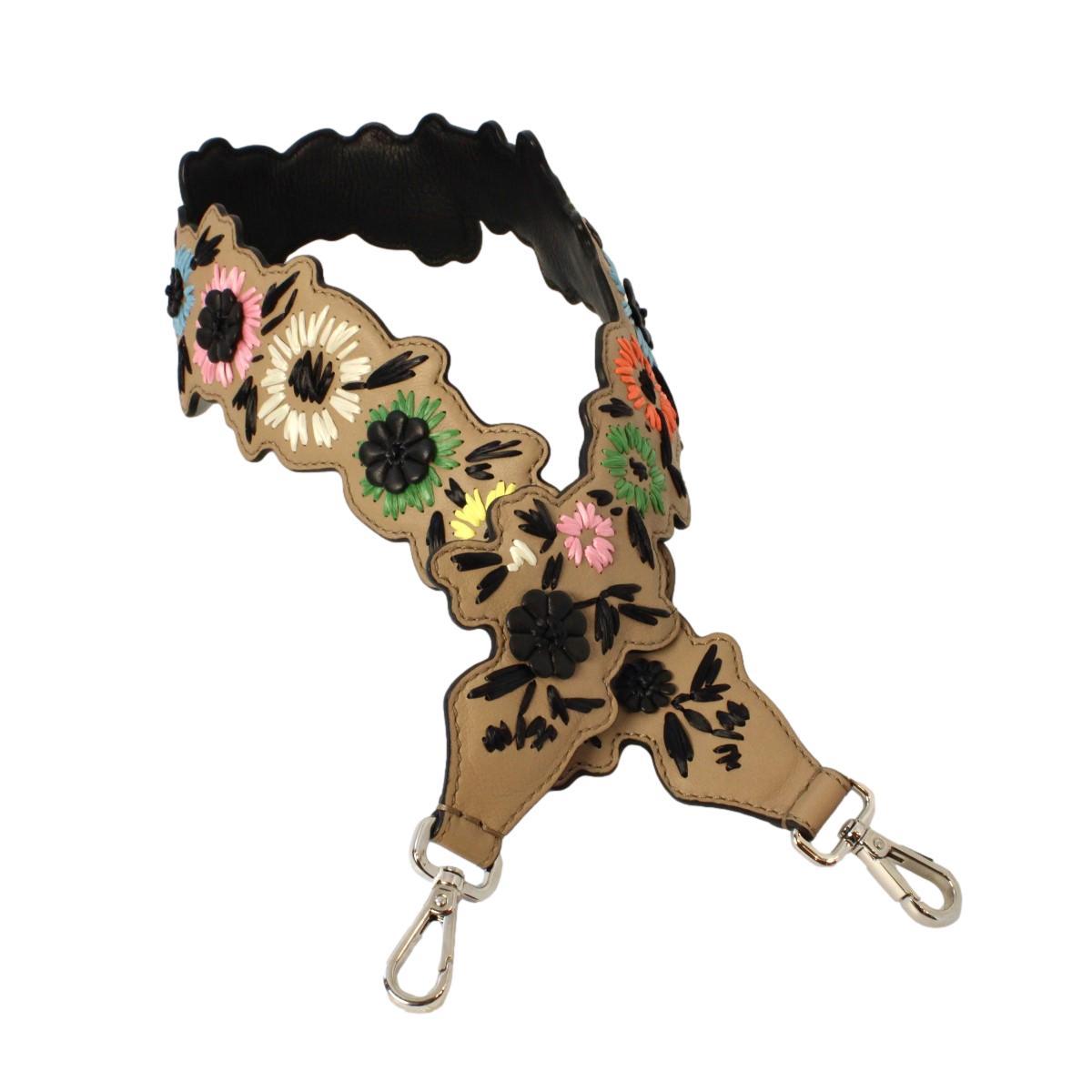 This Fendi flowered multicolored shoulder strap is so unique and cute. This multicolored leather strap is adorned with adorable flowers. This strap goes beautifully with a Fendi designer handbag and can be hooked on to other handbags as well. This Fendi shoulder strap will add a fun pop of color to your everyday wardrobe and will jazz up any handbag. Includes authenticity cards and Fendi dust-bag.