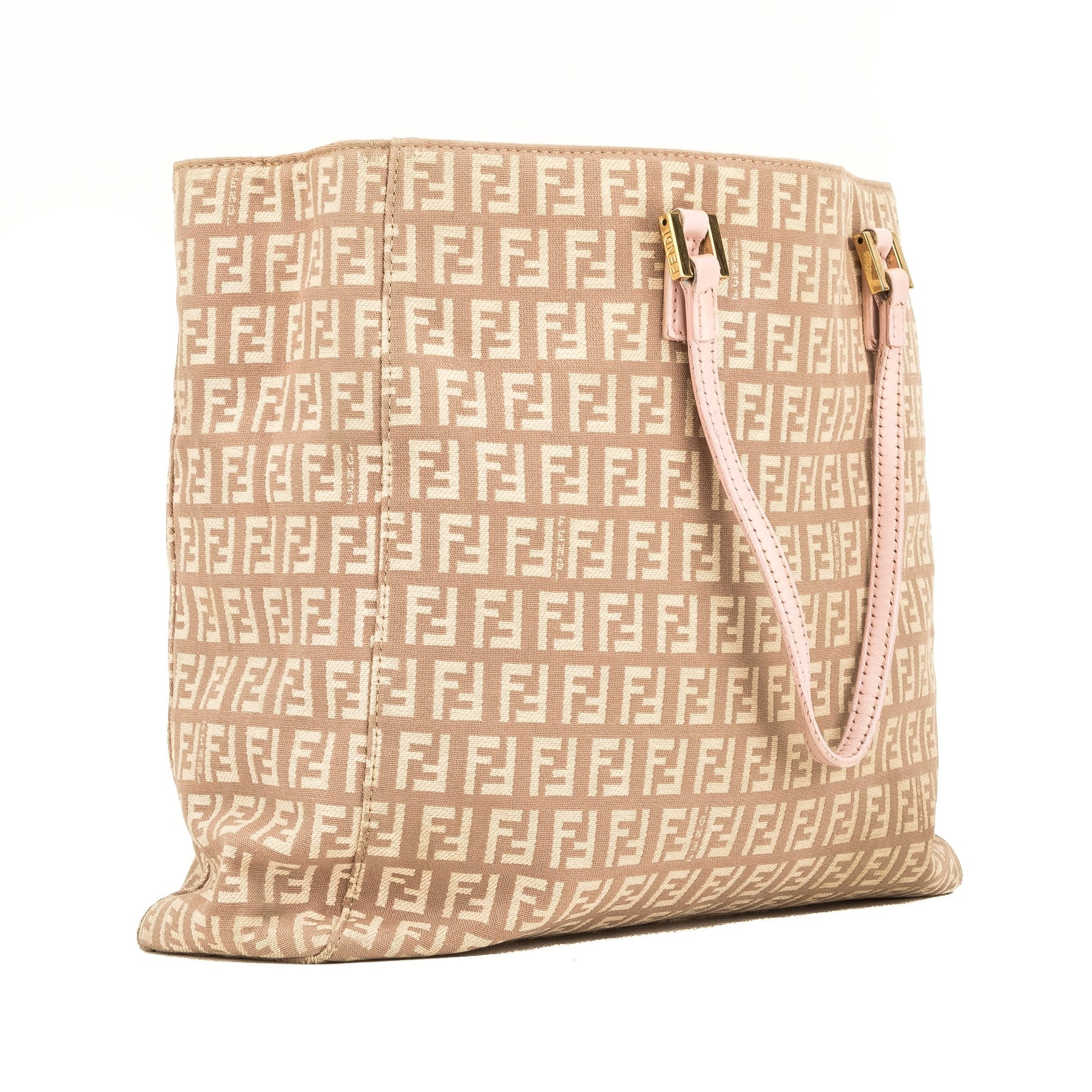 This authentic, pre-owned Fendi Zucchino Shopping Tote features the classic FF mono exterior with pink leather trimmings and nylon canvas Top zipper closure with the signature logo pull. This Fendi Shopping Tote Bag is a stylish tote bag with the Zucchino small Fendi logo fabric.