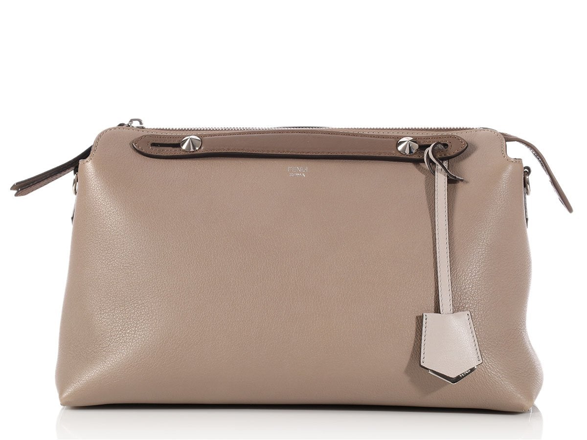 Fendi’s Taupe Grande Bauletto is the middle shade of taupe with the handles and trim slightly darker and the logo charm slightly lighter! Coming with a dustbag and shoulder strap, there is wear on the corners and hardware, while the front handle has a faint mark. Open the silver zipper on top to the light brown logo lining with a zipped pocket in the center and two slide pockets inside. The handles have a drop of an inch and a half and are flat when the strap is used – what a wonderful idea!