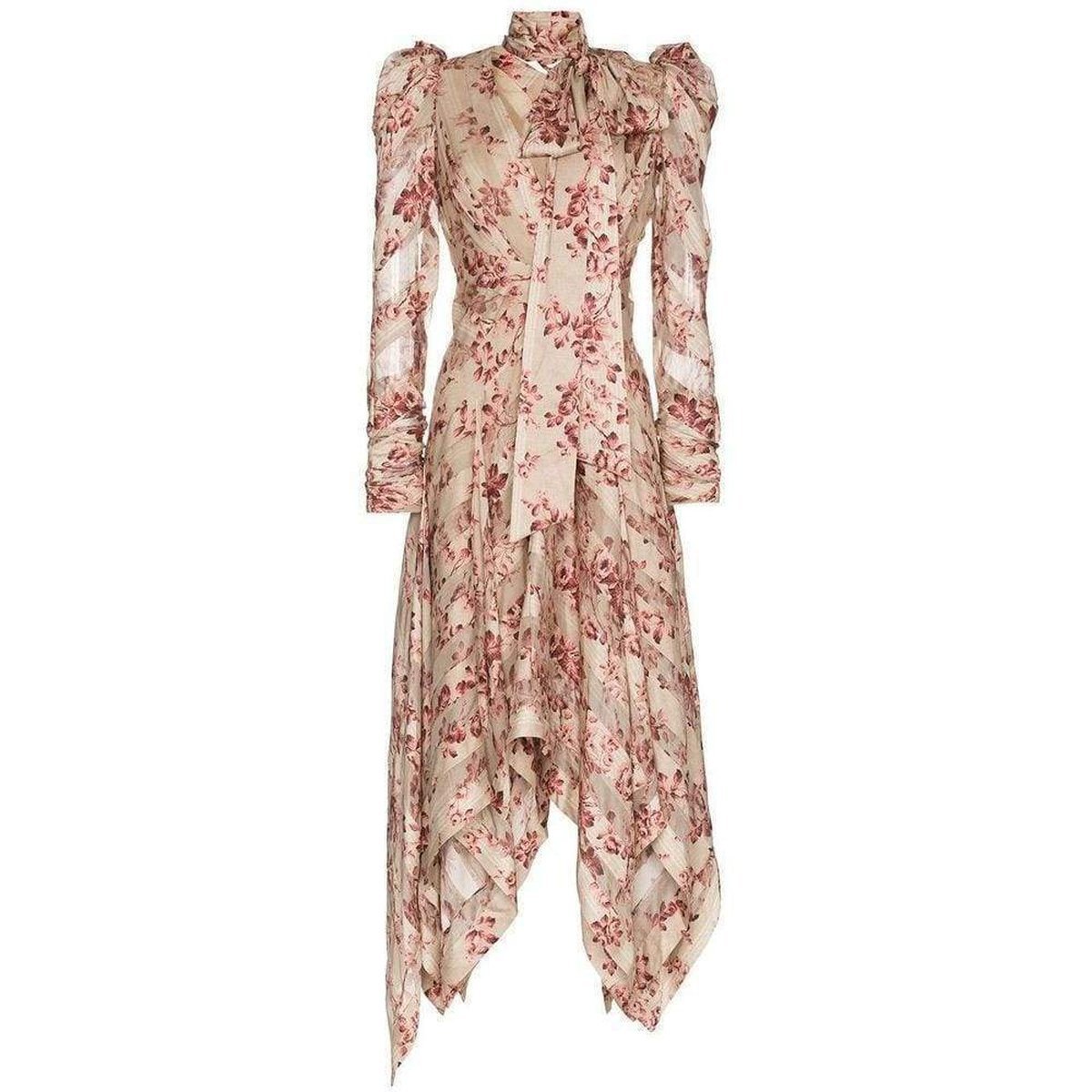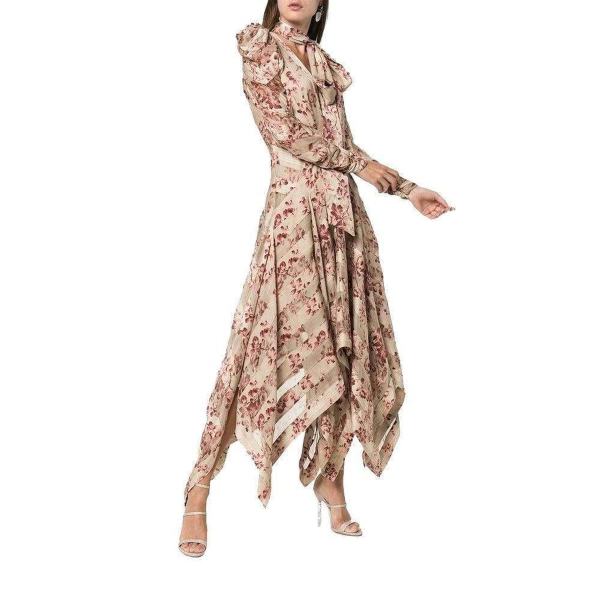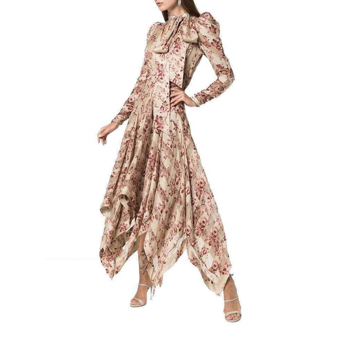 The dress is complete with a neck tie, draped long sleeves and a handkerchief hem for effortless glamour.