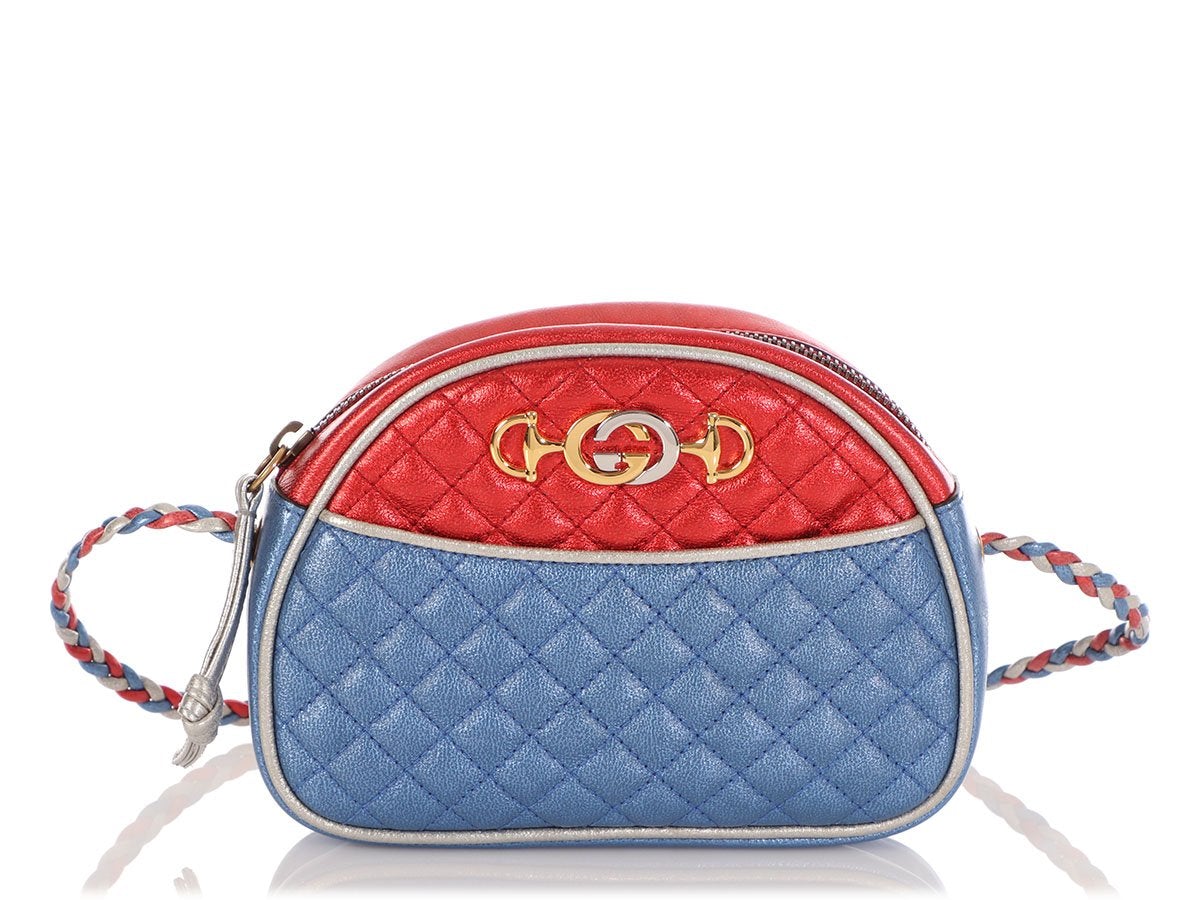 Gucci’s Mini Metallic Quilted Trapuntata Crossbody Bag is a tricolor little treasure! Made of fun metallic red, blue, and silver leather with interlocking gold and gunmetal G’s and horsebits on the front, this small bag has one slide pocket on the front and a long braided shoulder strap with a 26.75-inch drop. Unzip the top and you’ll find red floral fabric lining with two card slots inside. In excellent condition, it has light scratches on the hardware. The combination of bold colors gives me serious Wonder Woman vibes!