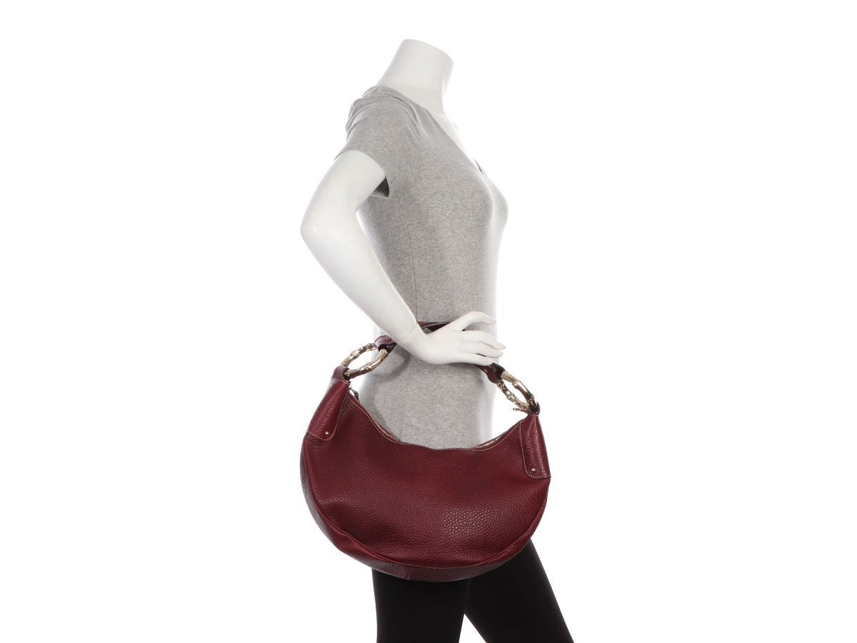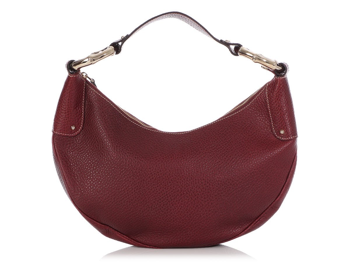 Larger-than-life hardware makes Gucci’s Burgundy Bamboo Ring Hobo stand out in a crowd! Oversized gold-tone bamboo rings add pizzazz to the bases of the handle which has a 9-inch drop, while the body of the bag is made of thick, grained dark-red leather. Unzip the top and you’ll find brown fabric lining with one zipped pocket inside. In very good condition, it has scratches on the hardware, a scratch on the side, a scuff on the back, and a few rub marks on the bottom (but most of the wear blends in well). The rings remind me a bit of bangle bracelets—there’s no reason your wrists should have all the fun!