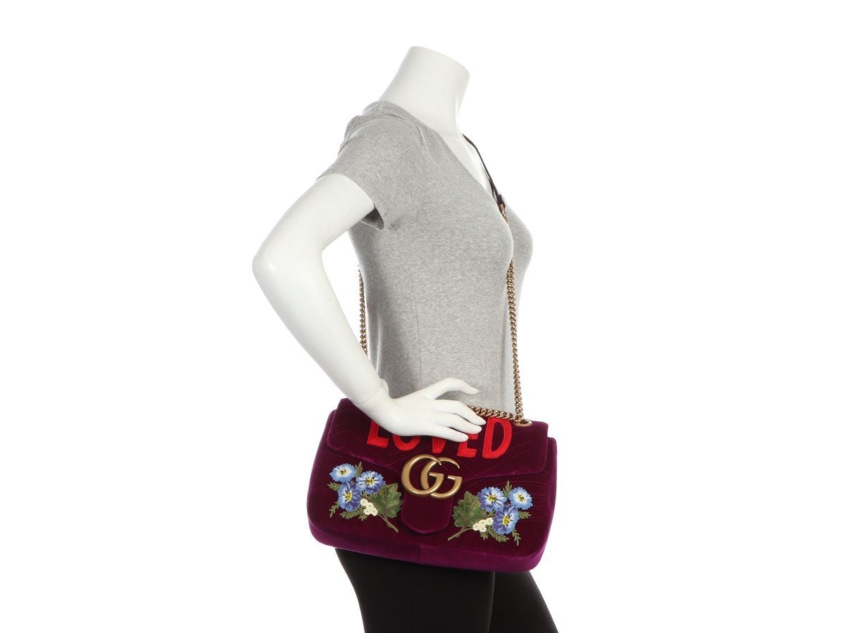 Remind yourself how truly fabulous you are by making Gucci’s Medium Purple Embroidered Velvet GG Marmont Shoulder Bag part of your daily affirmations! Crafted from chevron-quilted velvet, it has blue flowers embroidered into the front, a heart quilted into the back, and the word “Loved” spelled out in big red letters above the brass double G’s on the flap. A hidden clasp secures the flap and inside you’ll find pink satin lining with one zipped and one slide pocket. In very good condition with a dustbag, fabric sample, and info booklet, it has scratches on the underside of the flap, rubbing on the front under the flap from the hardware, some indentations on the back, a run in the lining, a few faint stains inside, and a very subtle musty smell. The leather-topped chain strap can be worn doubled with an 11.25-inch drop or pulled long with a 20.75-inch drop, allowing you to feel the Gucci love two different ways!