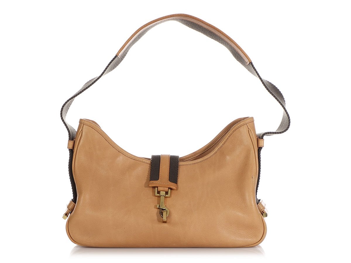 Gucci’s Small Tan Shoulder Bag is a petite practical bag with a can-do attitude! It’s made of tan leather, and the shoulder strap with a 10.25-inch drop is brown webbing with matching leather details. Another webbing-and-leather strap pulls over the top and secures with a clasp, while the interior is brown logo fabric with one zipped pocket inside. A previously loved bag, the corners, edges, and front are rubbed, there are scratches throughout, the hardware is scratched, losing its gold tone, and the back of the clasp is peeling, there are faint marks on the bottom, makeup residue inside, and it has a perfume smell. It’s a bag with tales to tell, and plenty of tales to write in its next chapter!