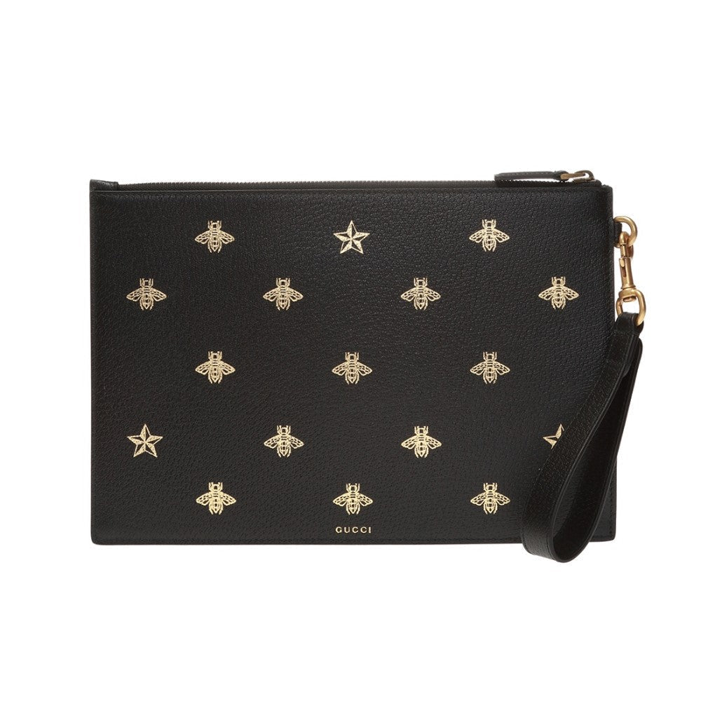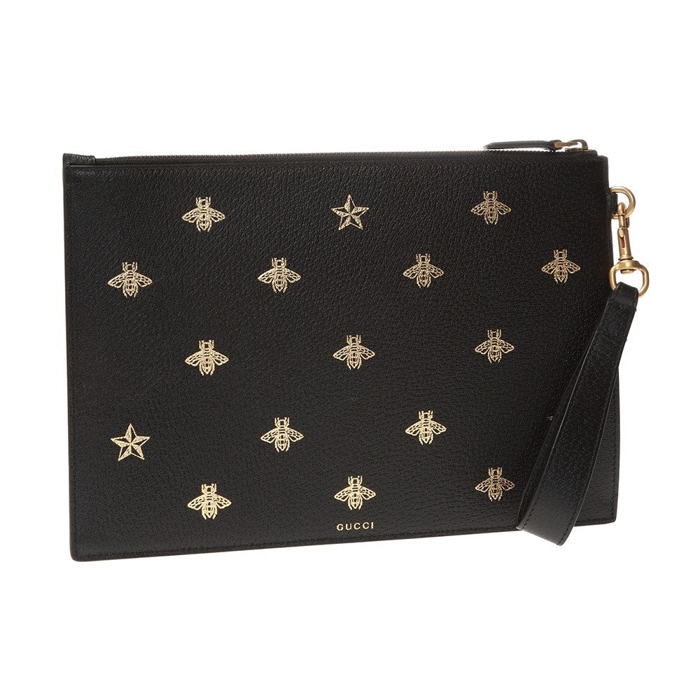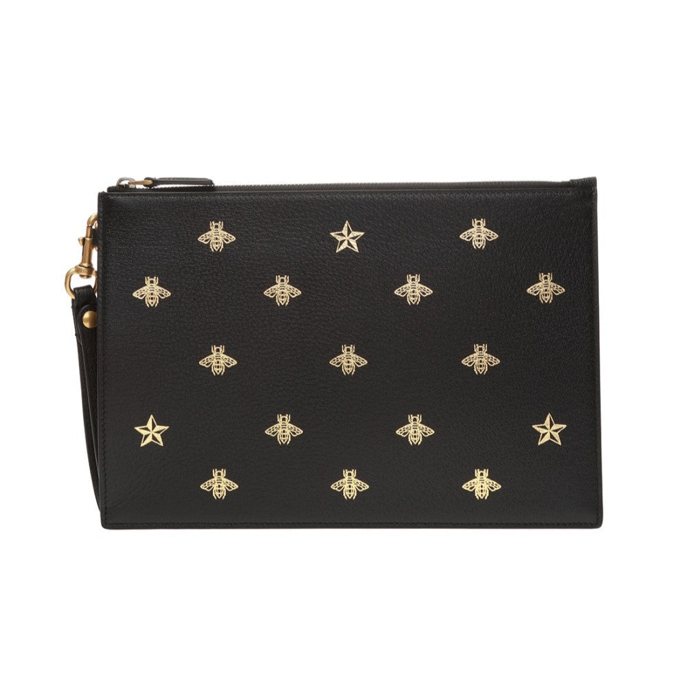 This show stopping Gucci clutch is the perfect accessory to complete any outfit. This wristlet is crafted of black leather with a gold bee and star motif. There is a detachable wristlet strap and a zipper across the top of the clutch. This wristlet pouch has plenty of room to fit everything you would need and is perfect for a night out!