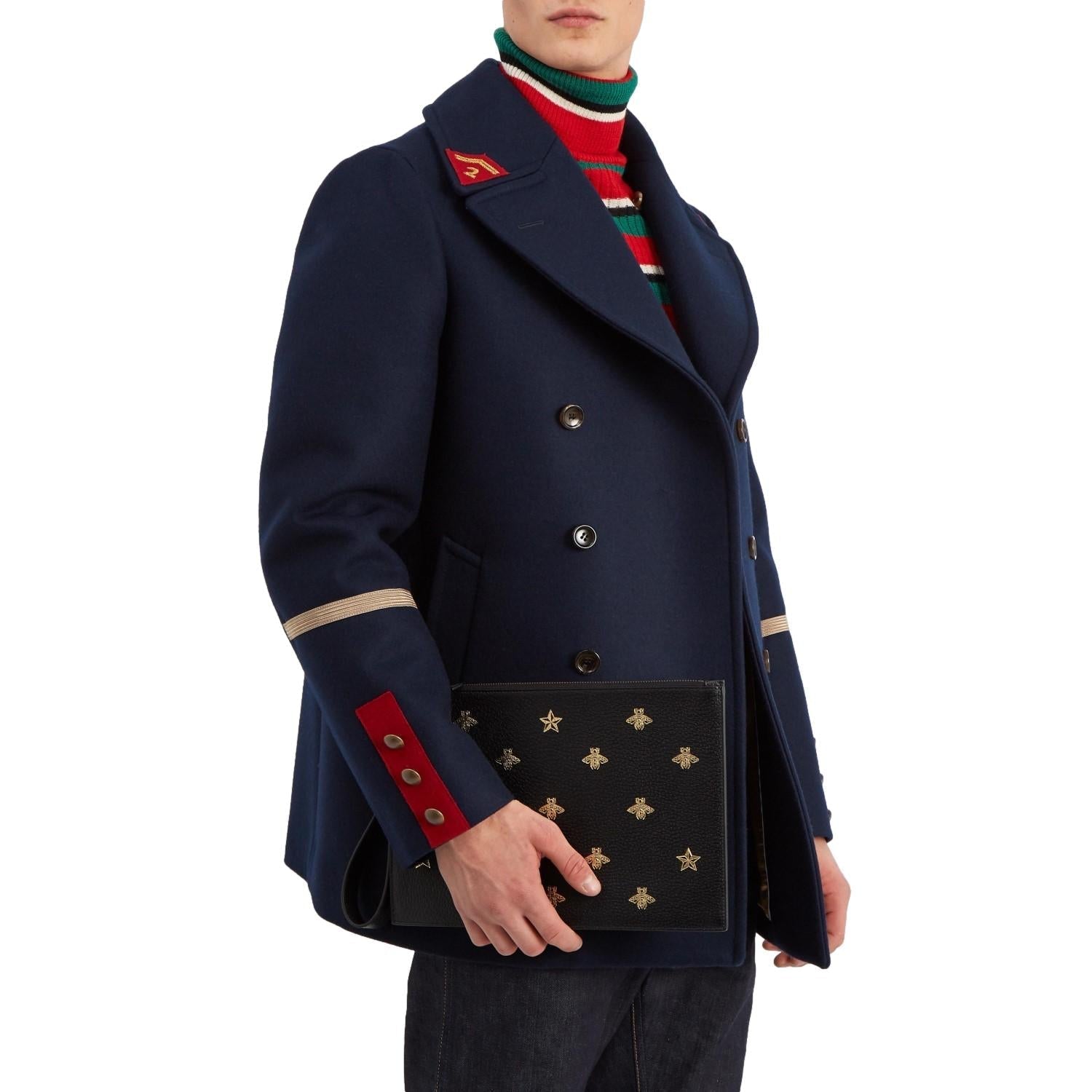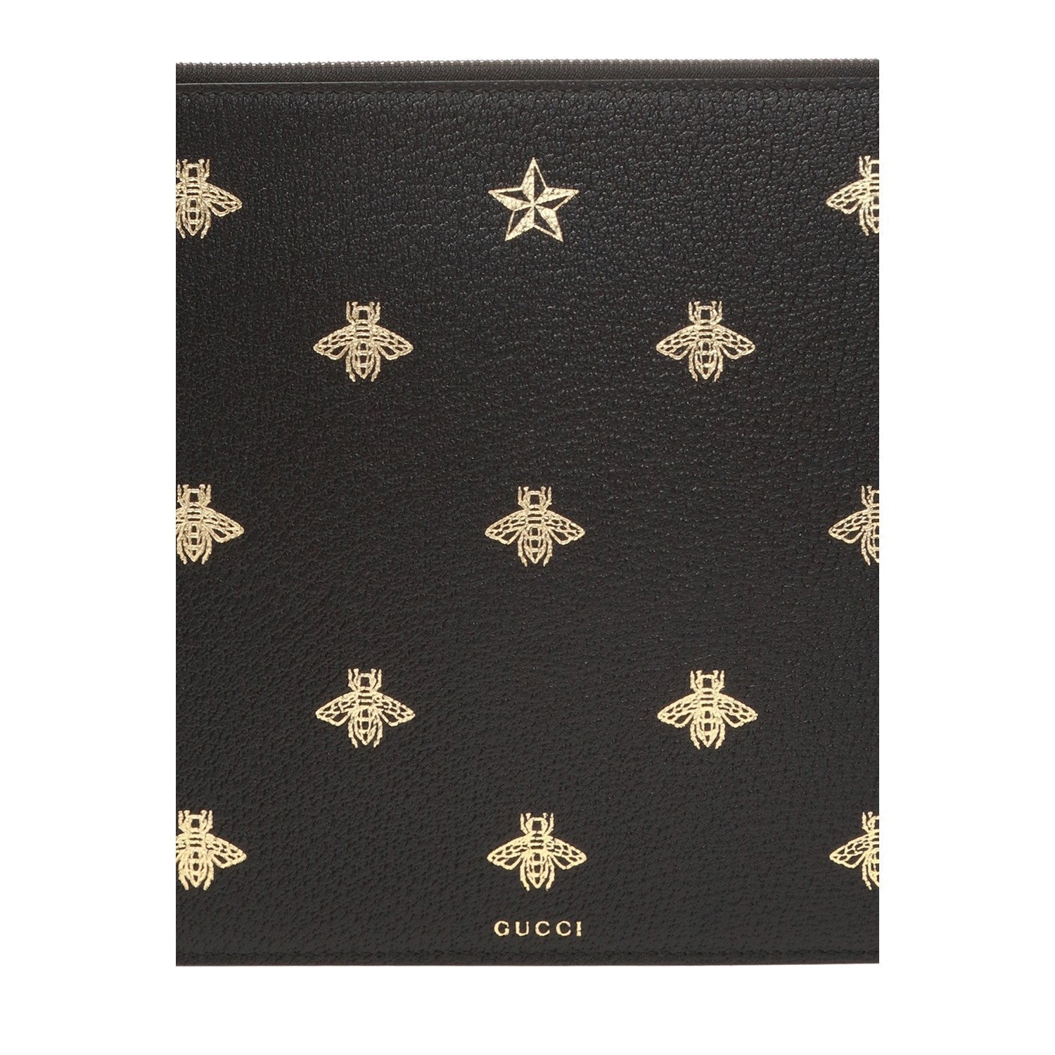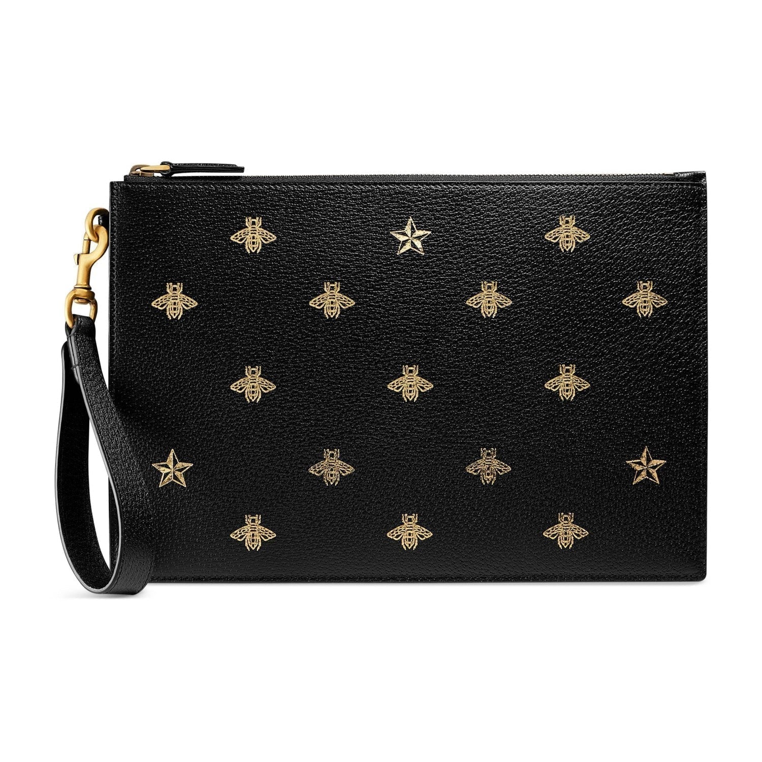 This show stopping Gucci clutch is the perfect accessory to complete any outfit. This wristlet is crafted of black leather with a gold bee and star motif. There is a detachable wristlet strap and a zipper across the top of the clutch. This wristlet pouch has plenty of room to fit everything you would need and is perfect for a night out!