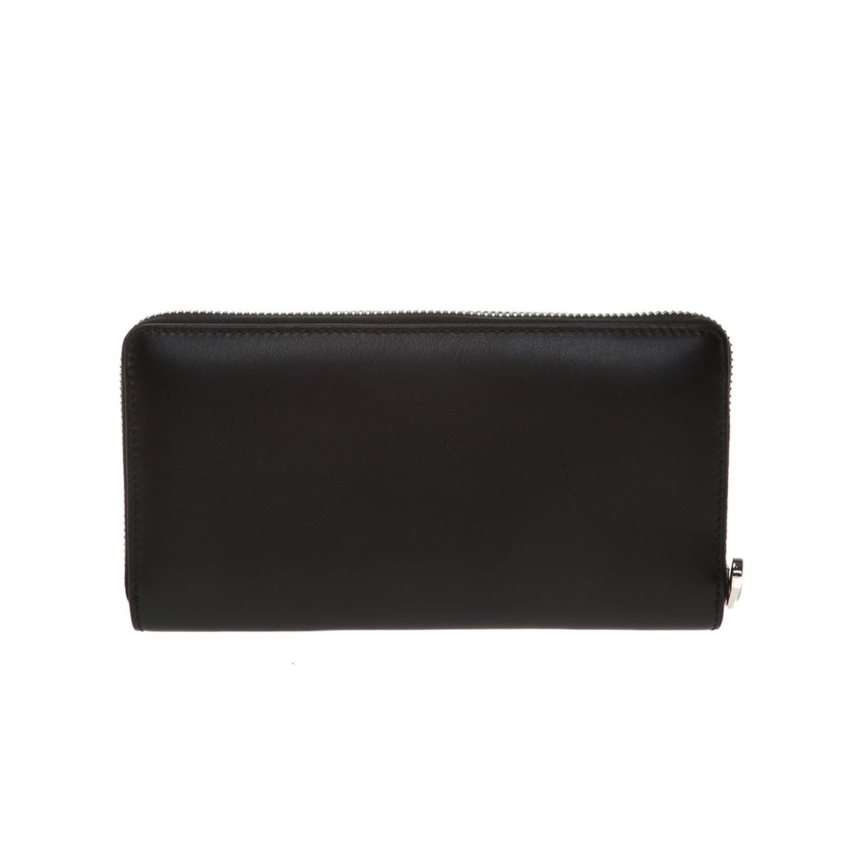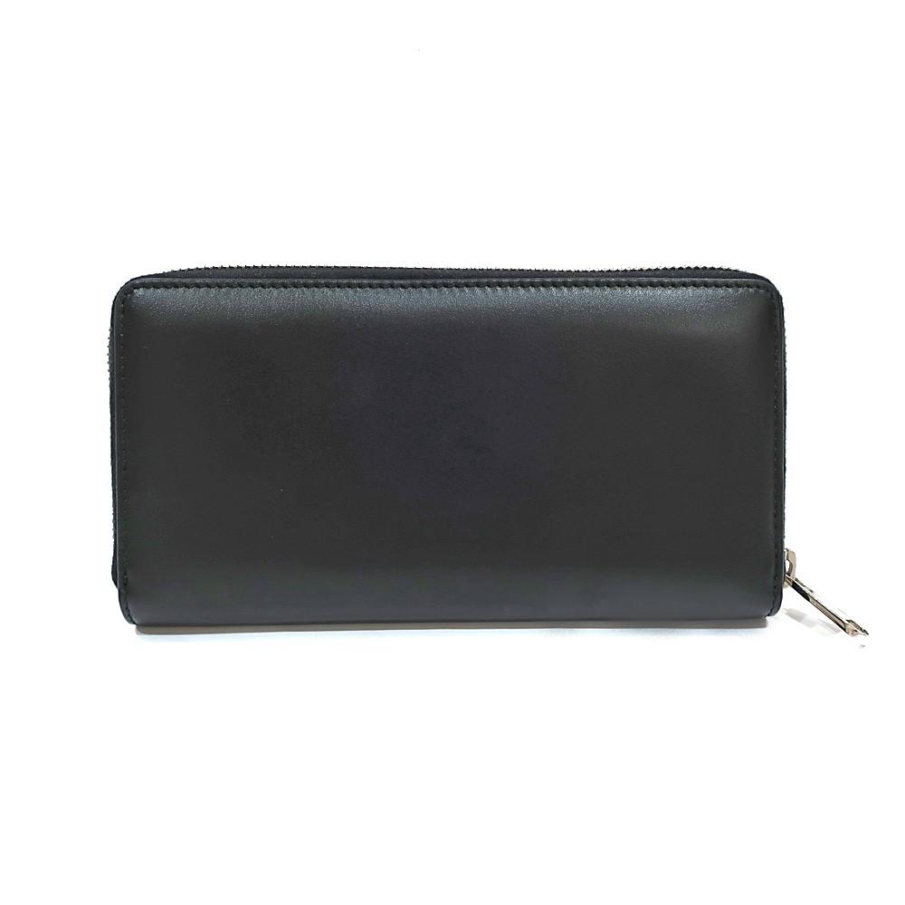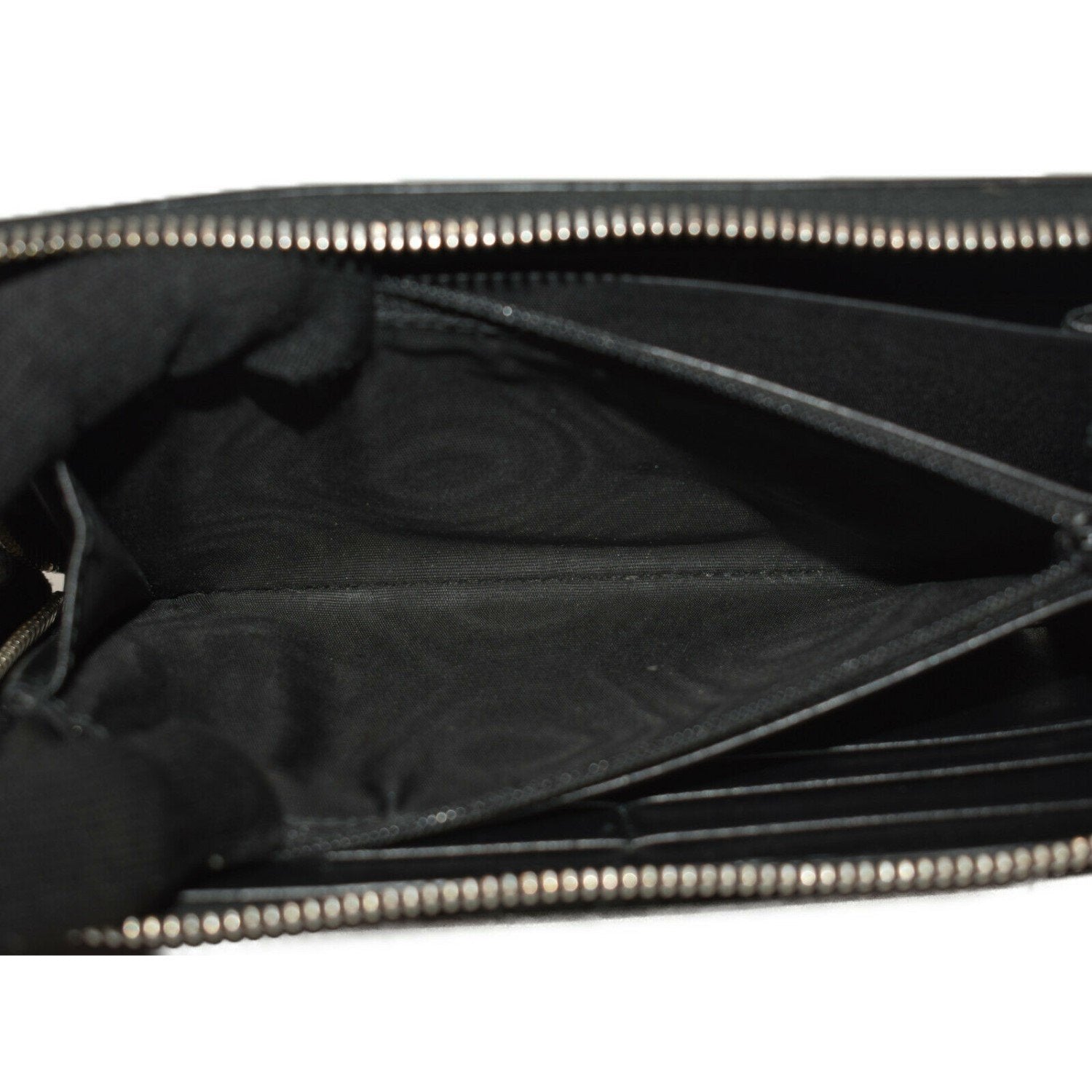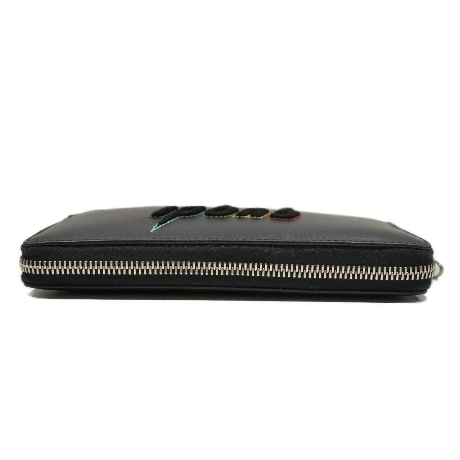 Gucci continental black smooth leather wallet with rainbow embroidered blade lightening logo. This wallet pairs fine Italian craftmanship with modern detailing. The soft calfskin leather is smooth, and paired with black stitching. Silver zip around closure opens to 3 bill slots, a zippered coin pouch, and 8 card slots. Hold all of your essentials in this fabulous wallet.