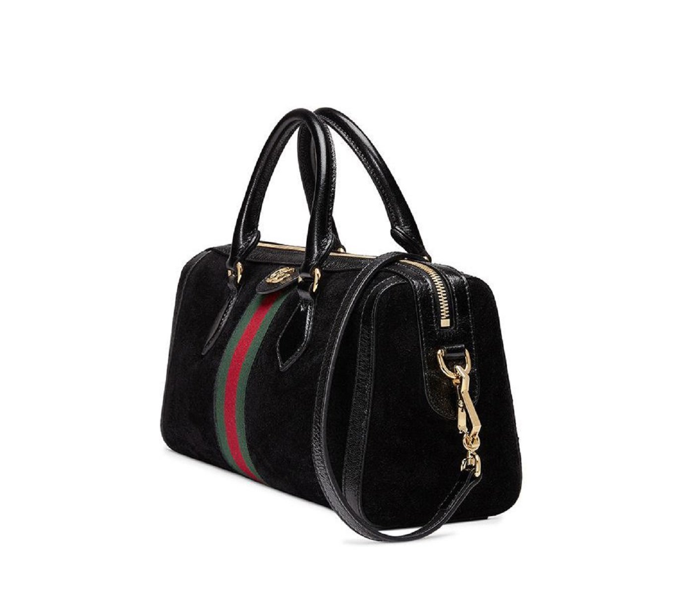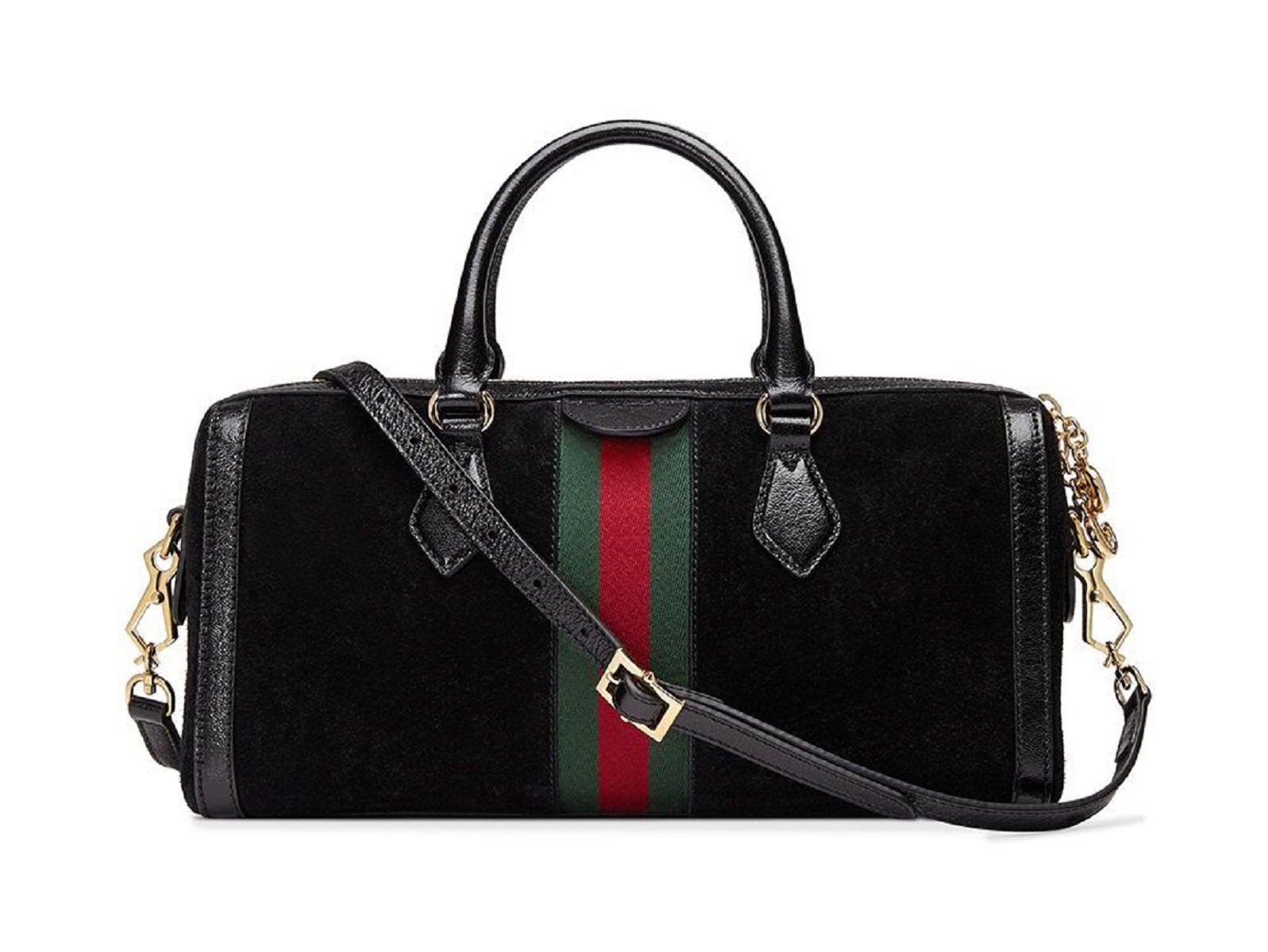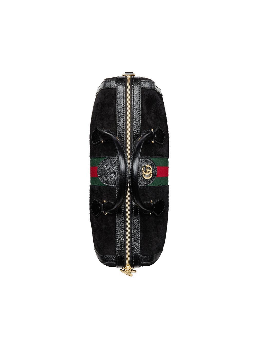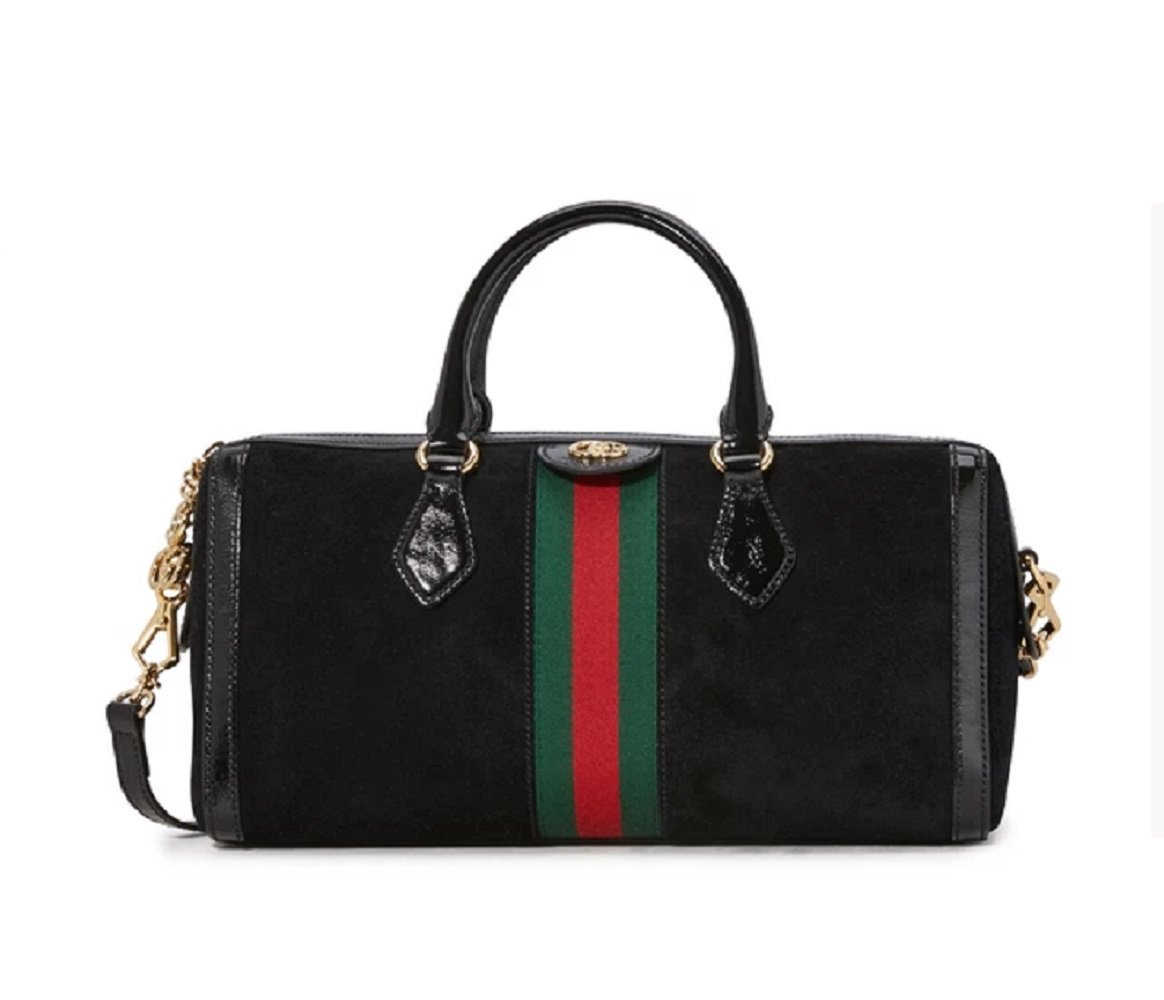 This suede web stripe boston bag is a beautiful statement piece part of Gucci's Ophidia collection. It is composed of suede exterior with the classic GG golden logo on the front and zippers.