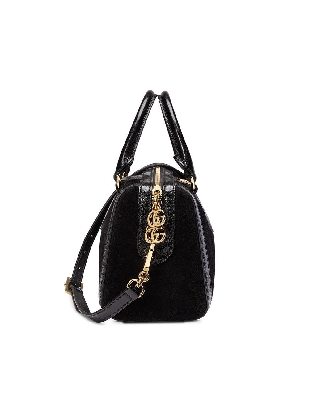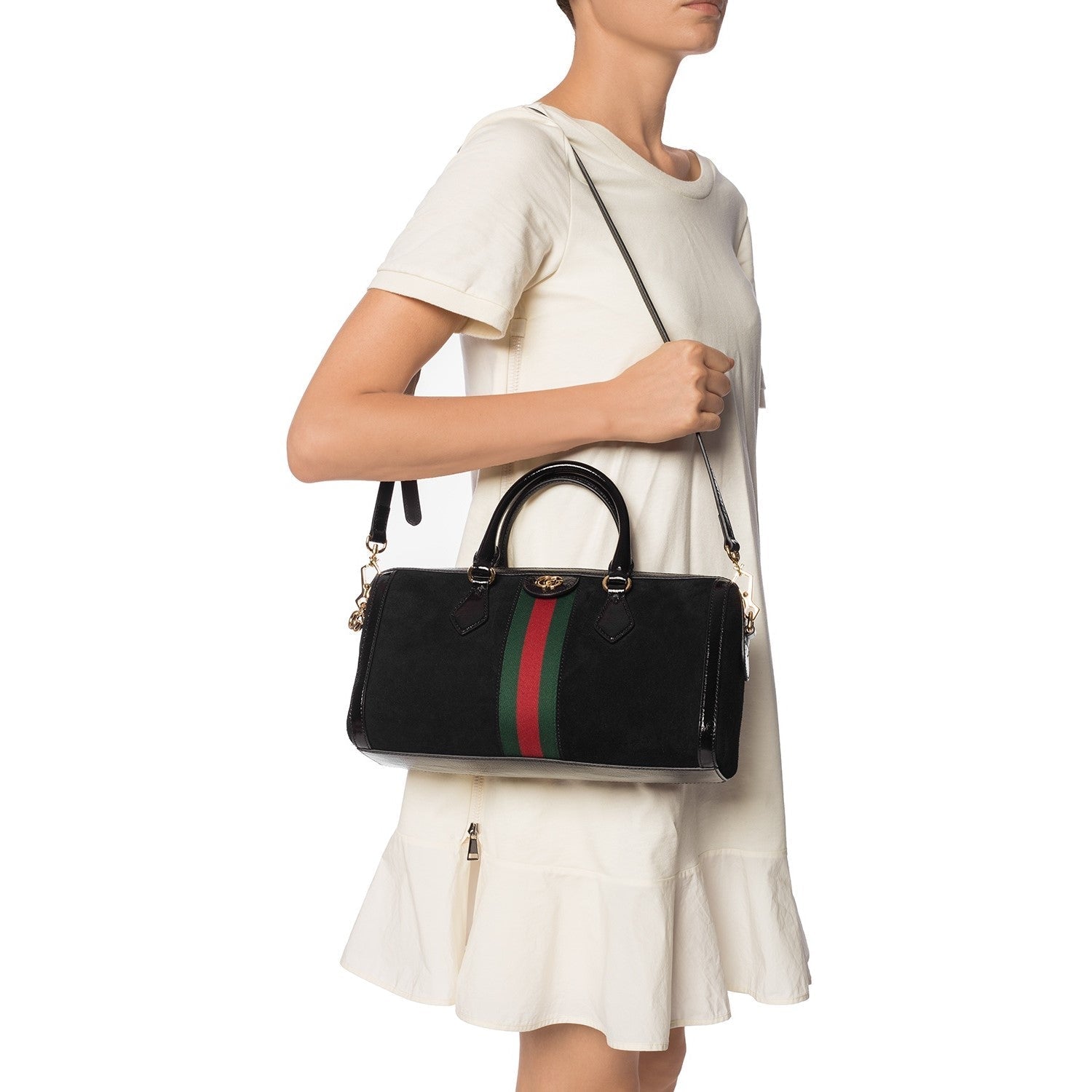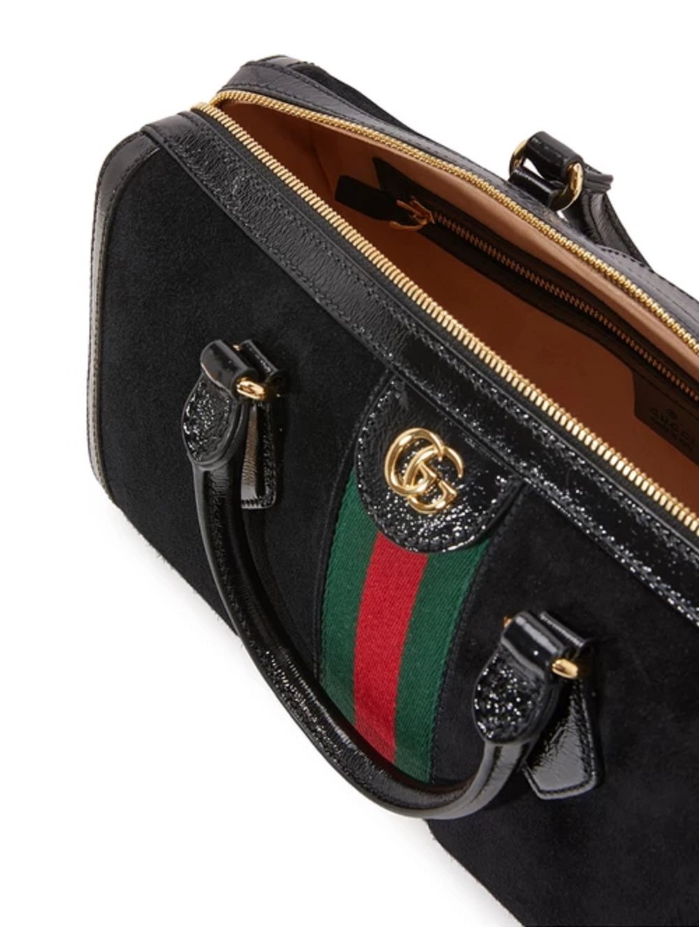 This suede web stripe boston bag is a beautiful statement piece part of Gucci's Ophidia collection. It is composed of suede exterior with the classic GG golden logo on the front and zippers.