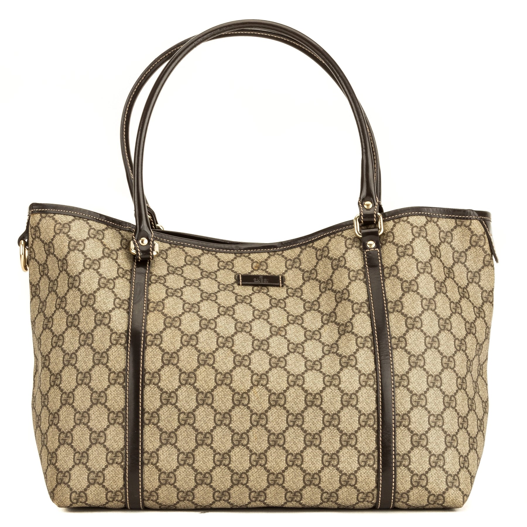 This is an authentic, pre-owned GUCCI Tote Bag. It features a coated GG Monogram canvas with a brown leather trim, a contrasting stitch detail, a leather nameplate, rolled handles, and gold-tone hardware. The interior has a brown textile lining with a zip pocket and a snap magnetic closure. It has d-rings on the sides to attach a shoulder strap.