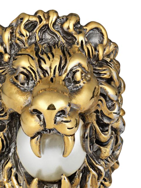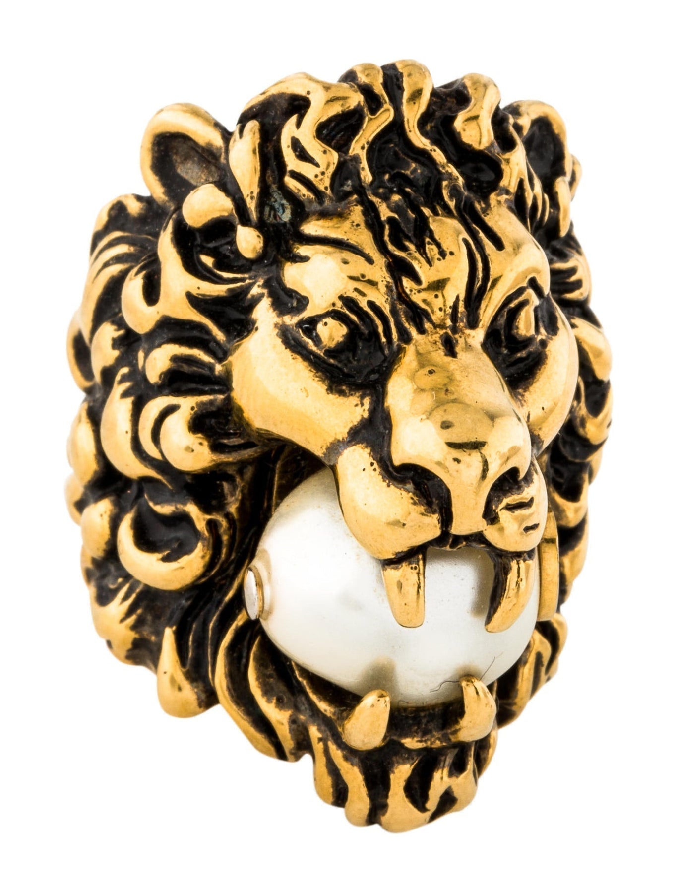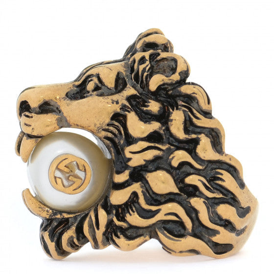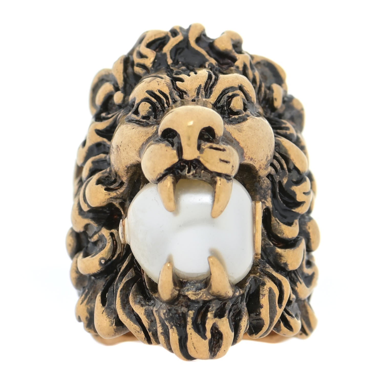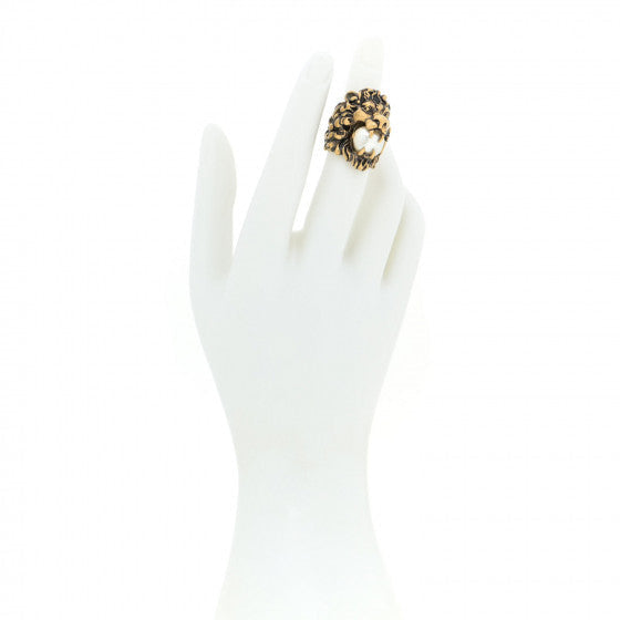 This simply chic ring is made of metal with an aged gold finish and features a lion head with a resin pearl as an accent of sophisticated style.