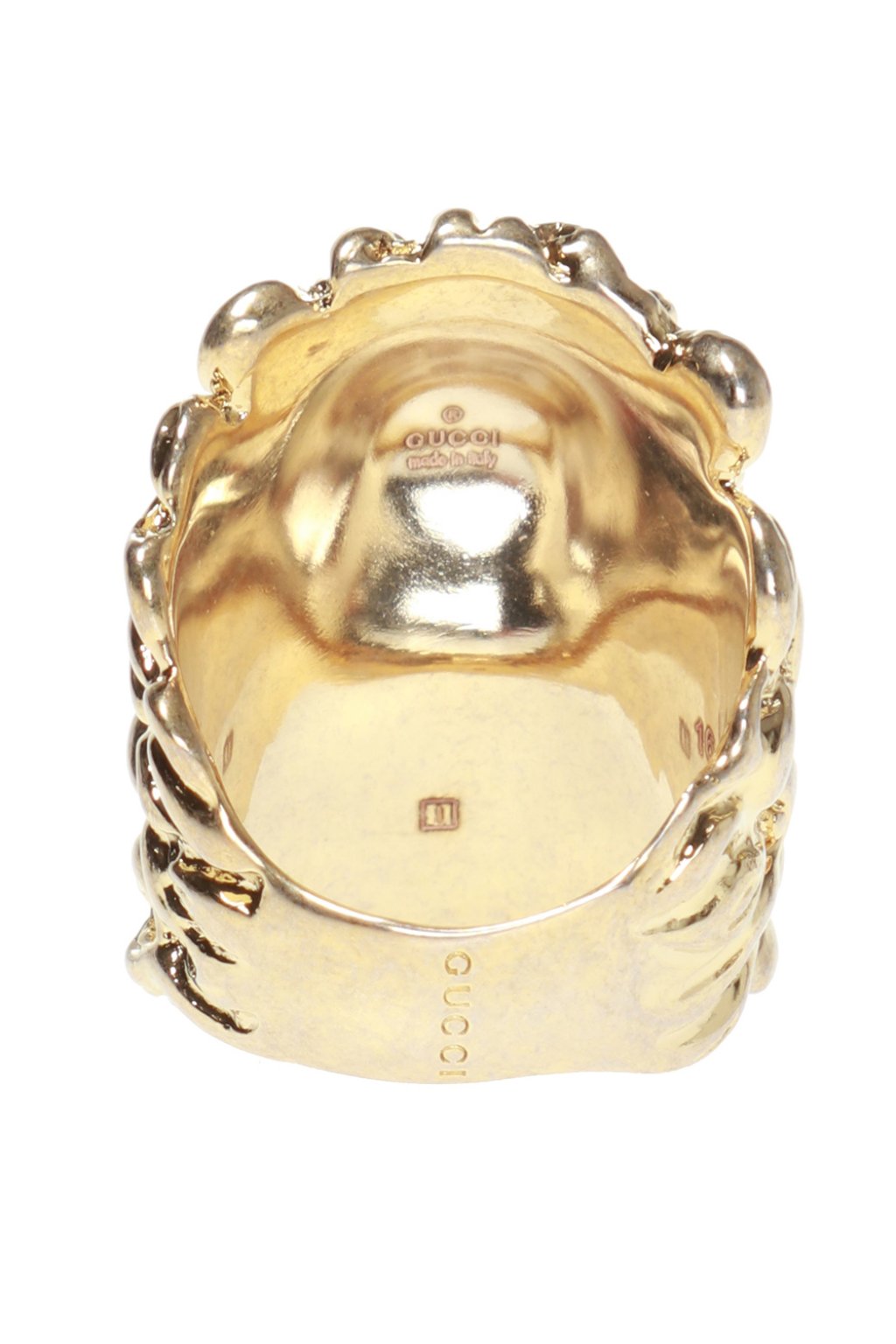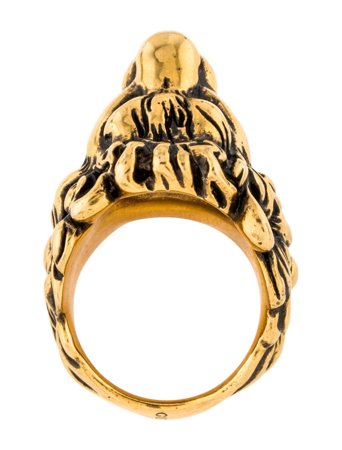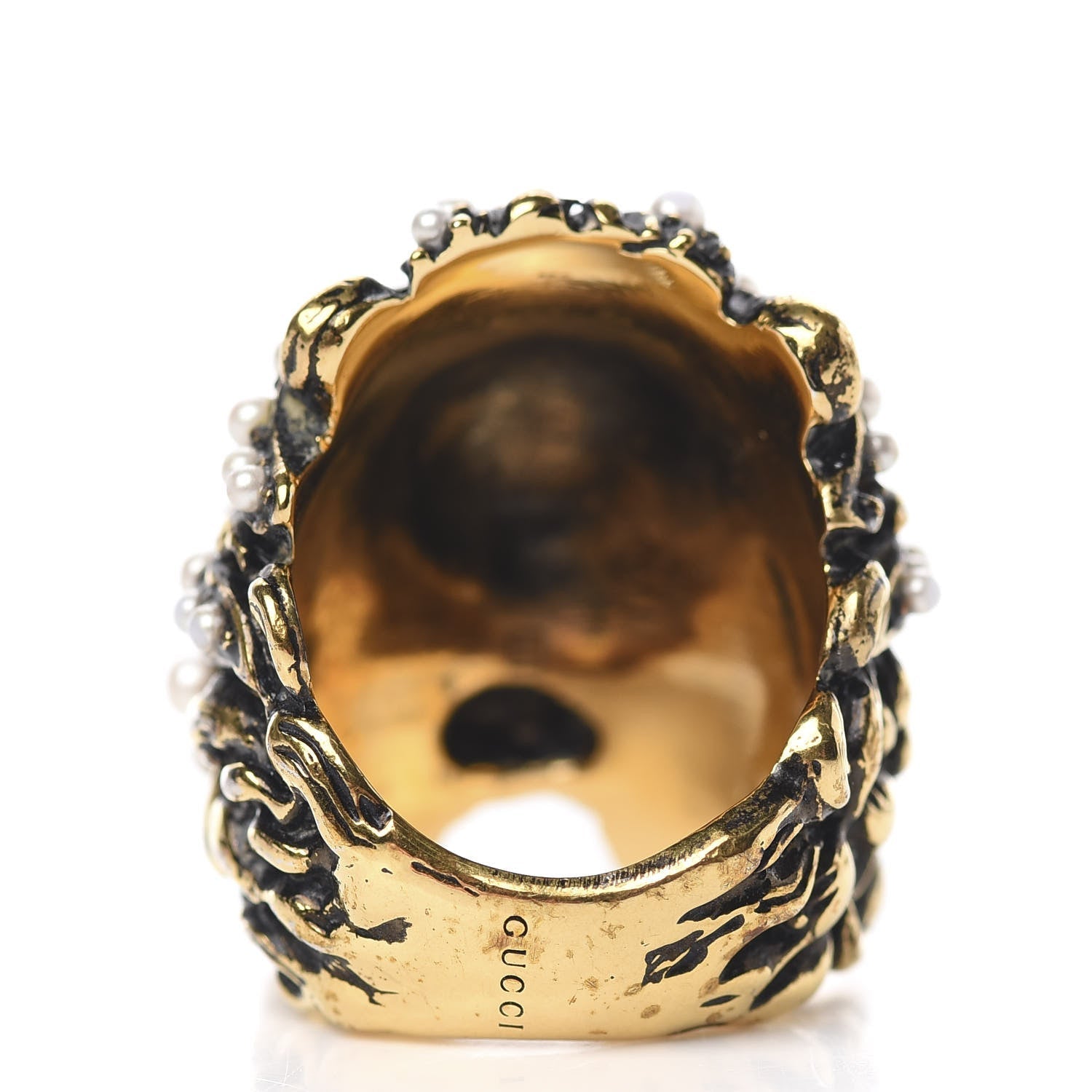 This simply chic ring is made of metal with an aged gold finish and features a lion head with a resin pearl as an accent of sophisticated style.