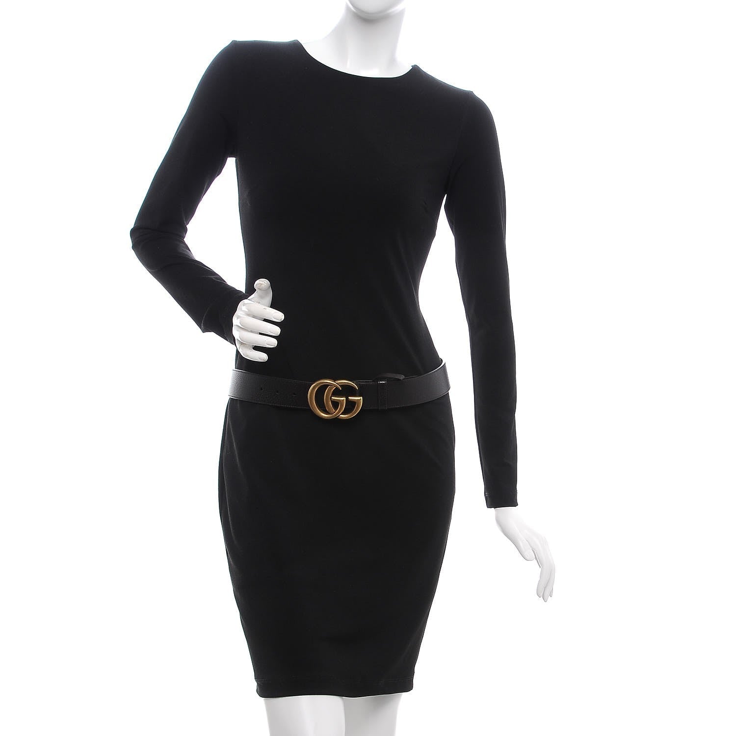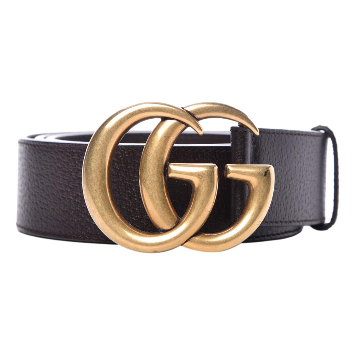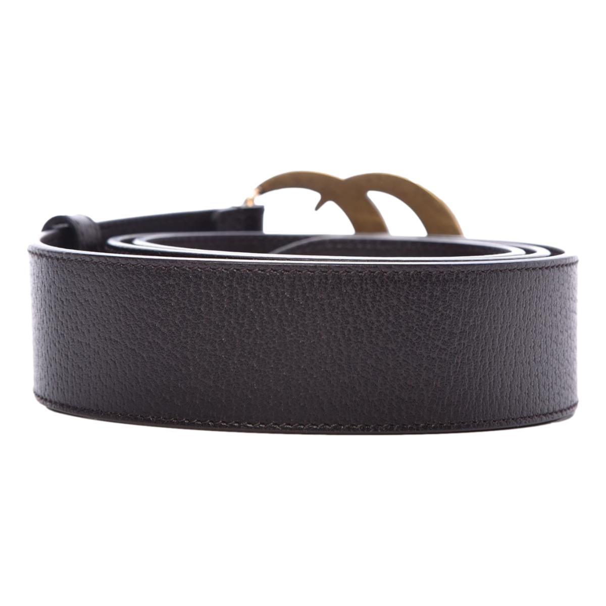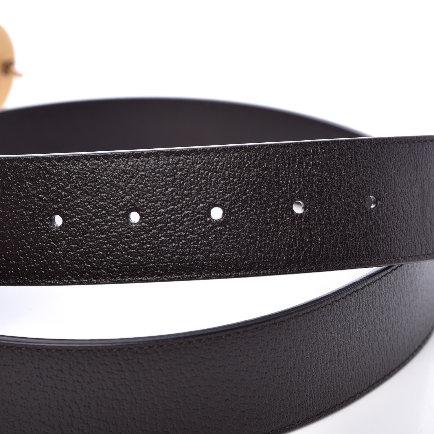 This stylish belt is crafted of dark brown calfskin leather and features an interlocking GG antique brass buckle for a sophisticated style only from Gucci!