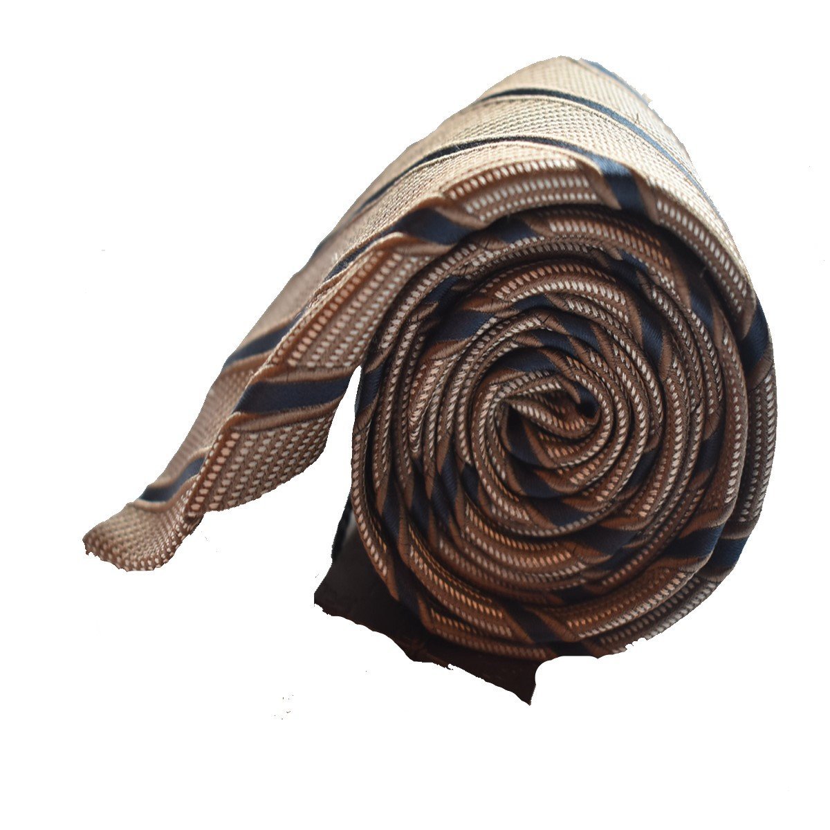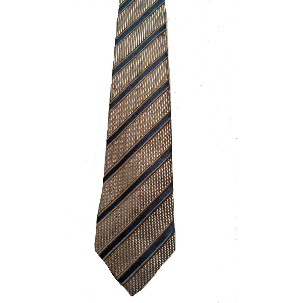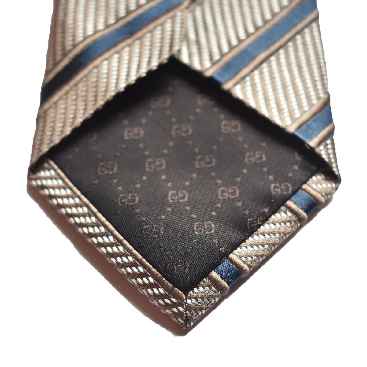 This handsome silk neck tie by Gucci will dress up your outfit for the perfect occasion. Look sharp and stylish with the classic tailored tied with gold, camel, and teal blue stripes.