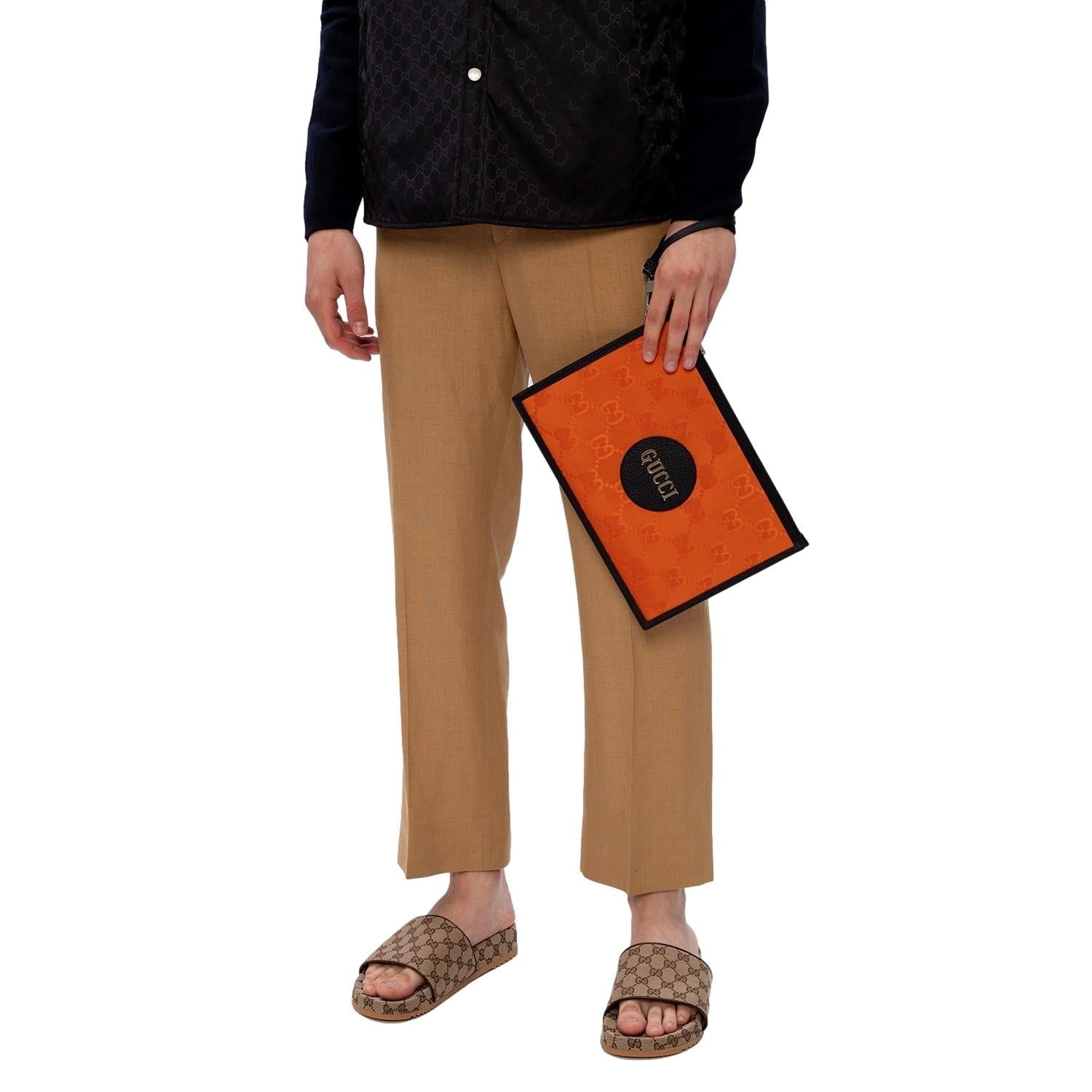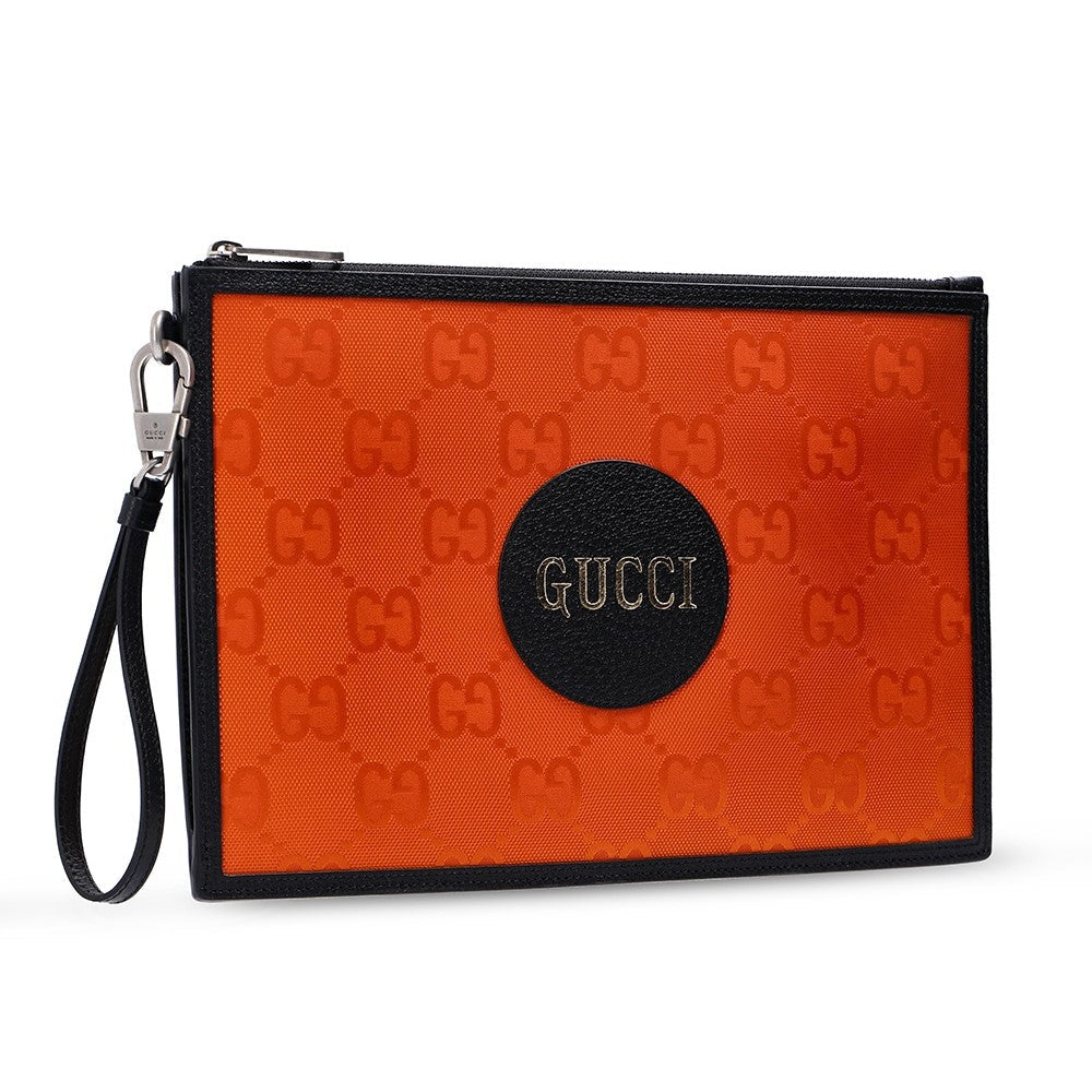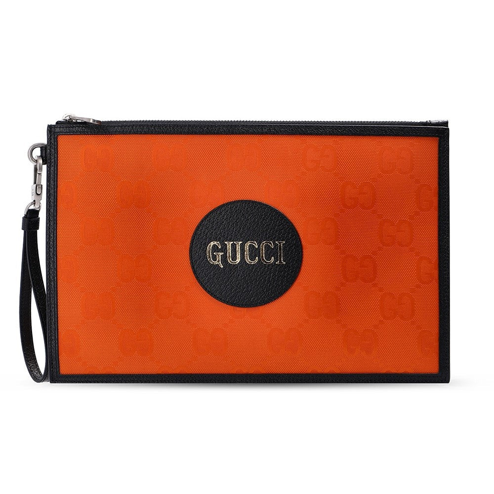 This clutch from the "Off The Grid" collection is the perfect accessory to complete any outfit. It is crafted with a Guccisima print Econyl fabric and black leather details. There is a detachable wristlet strap and a zipper across the top of the clutch that is accented by silver toned-hardware. Make a statement with this fun wristlet clutch from Gucci!