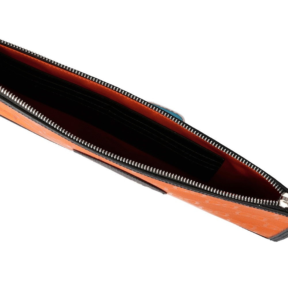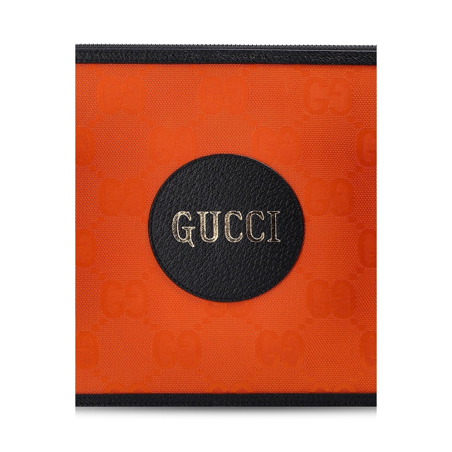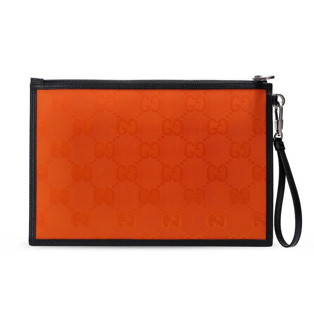 This clutch from the "Off The Grid" collection is the perfect accessory to complete any outfit. It is crafted with a Guccisima print Econyl fabric and black leather details. There is a detachable wristlet strap and a zipper across the top of the clutch that is accented by silver toned-hardware. Make a statement with this fun wristlet clutch from Gucci!
