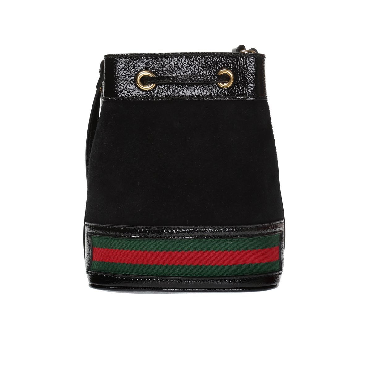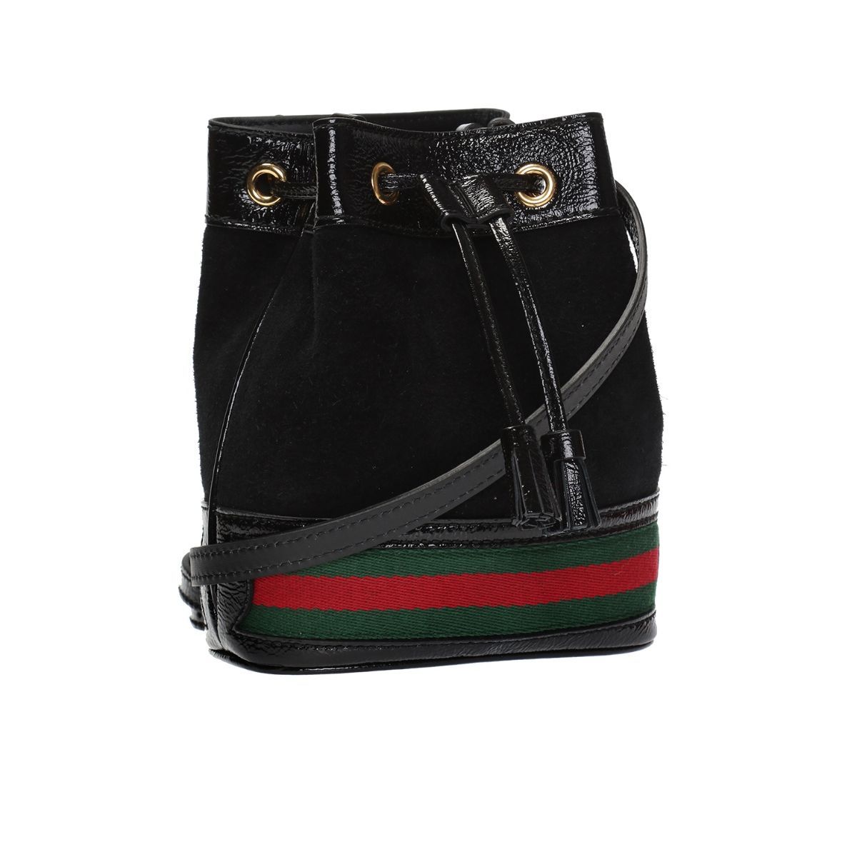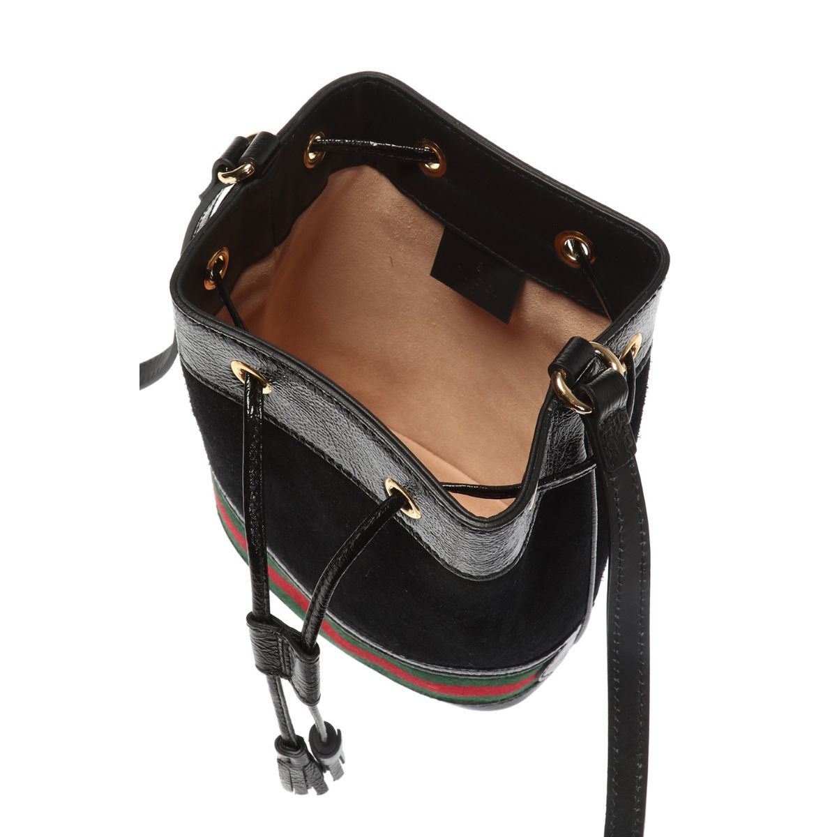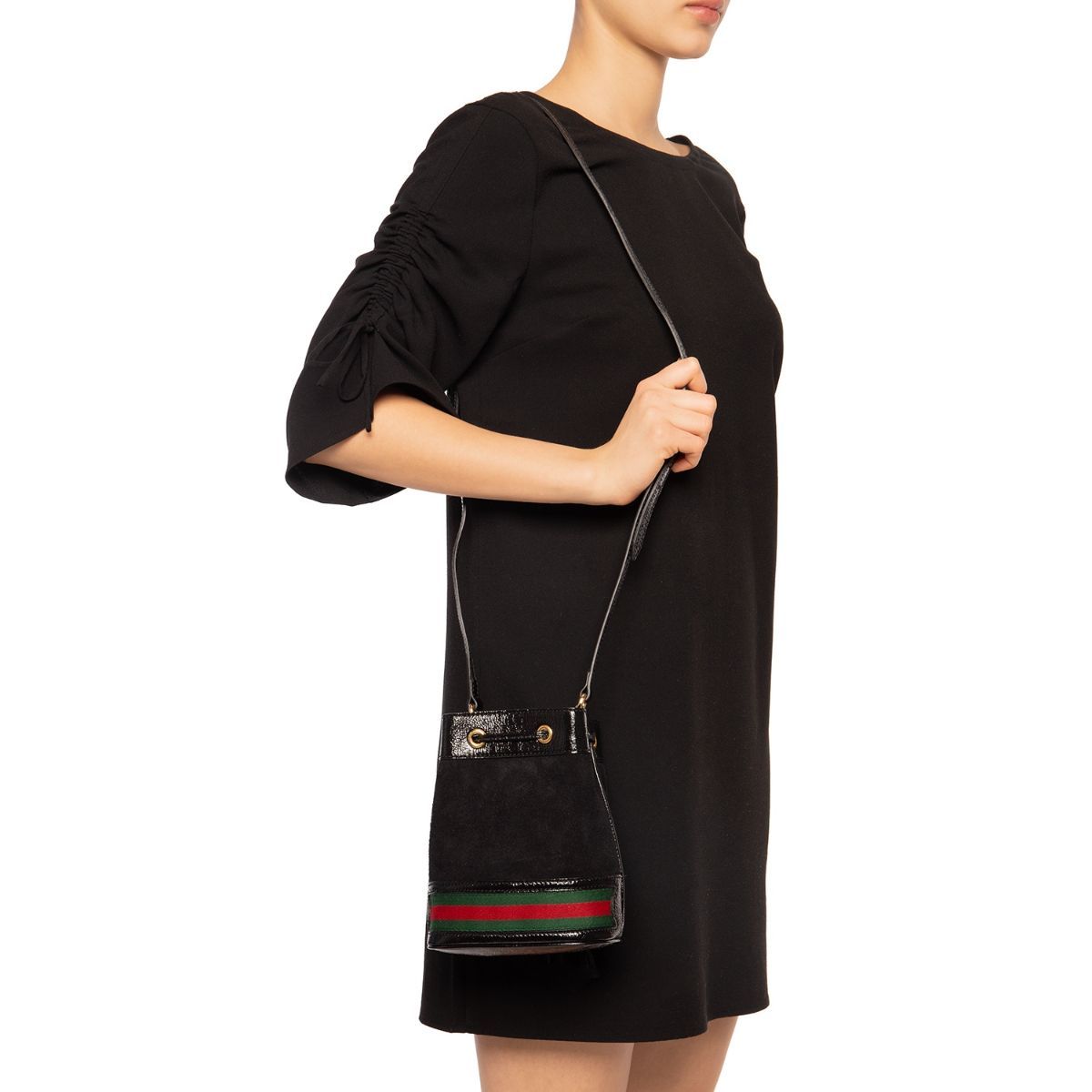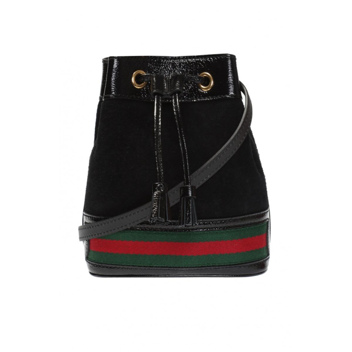 Black 'Ophidia' shoulder bag from Gucci. Made of suede and patent leather. Drawstring fastening. Bottom decorated with an embroidered pattern featuring the brand's signature 'Web' stripes in green, red and green. Adjustable shoulder strap. Beige lining. Main internal compartment.