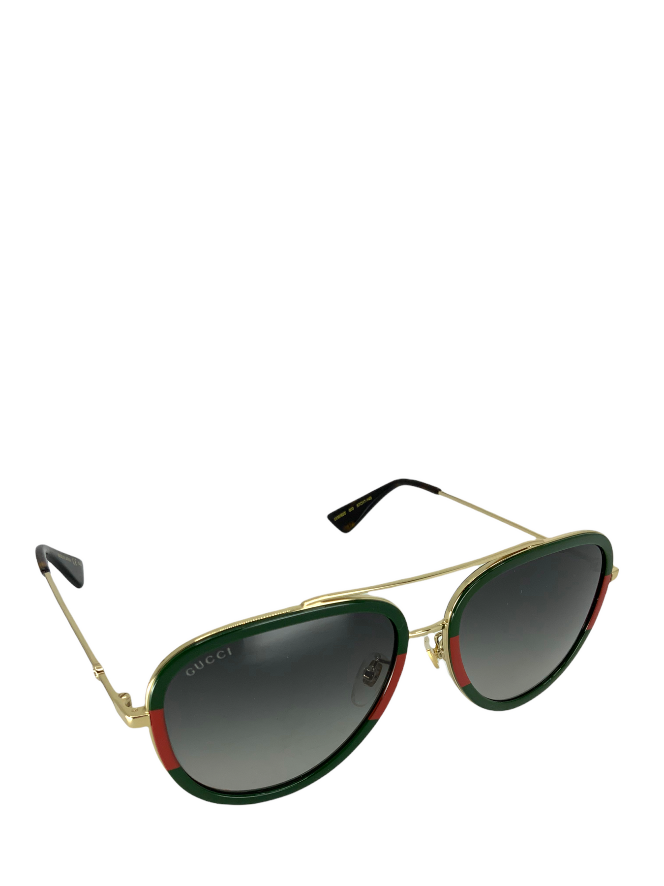 Add to your collection this d pair of GUCCI Aviator Metal Sunglasses featuring gold metal with a green and red web frame and a subtle signature bumble bee motif on the tips of both arms.