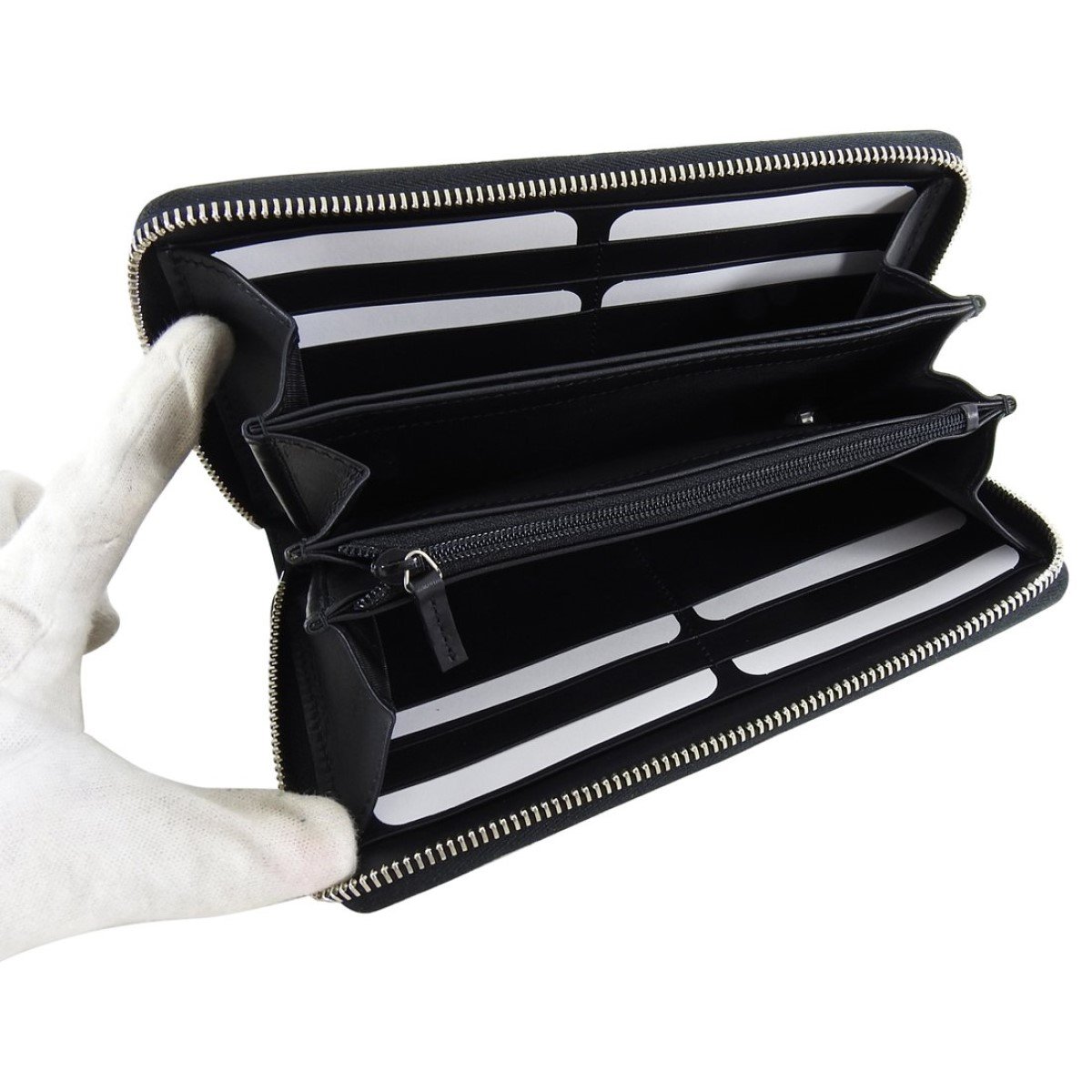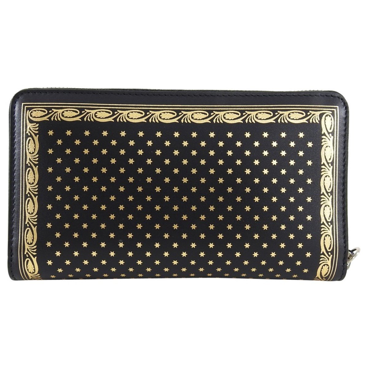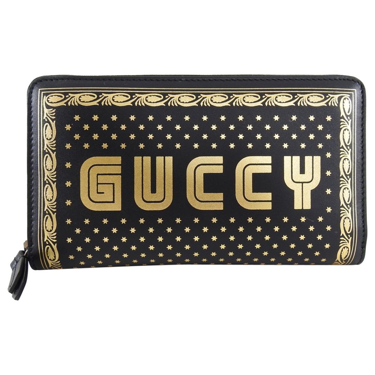 This black and gold Gucci zip around wallet is a beautiful piece to add to your accessory collection. "Guccy" logo surrounded by stars in gold. Features 12 credit card slots, central zipped coin pouch pocket, and 2 open bill sections. Perfect for organizing all your items in style.