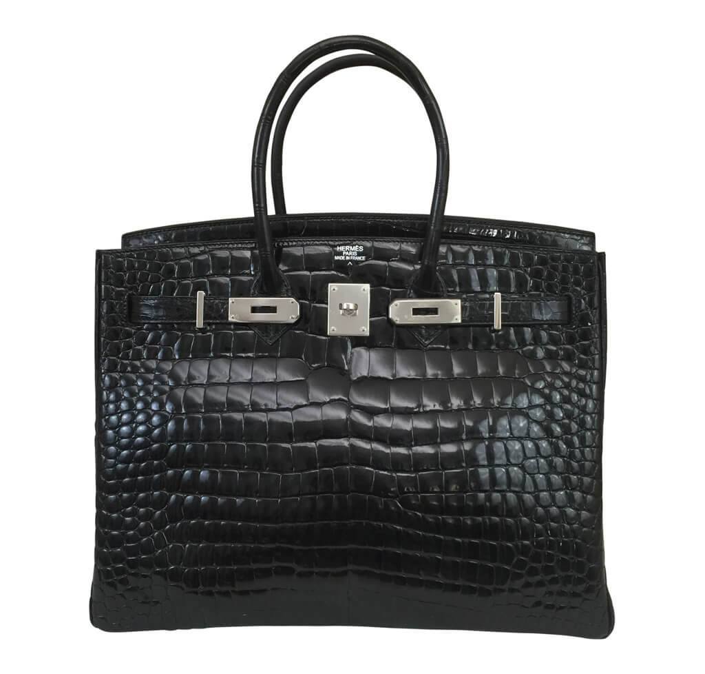This incredibly rare Hermès Birkin bag is a timeless collector’s piece. This bag is made from shiny porosus crocodile skin which features larger scales in the middle that get smaller in size towards the edges of the bag. The black exterior is accentuated by palladium hardware. The embossing has the circumflex symbol, which is embossed on all porosus crocodile Hermès bags.